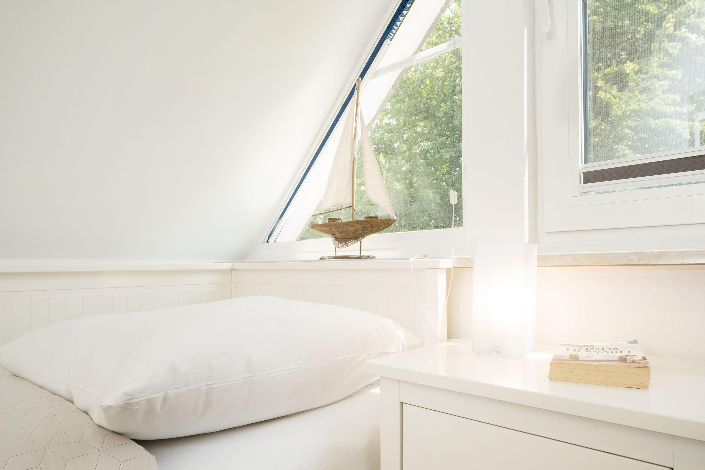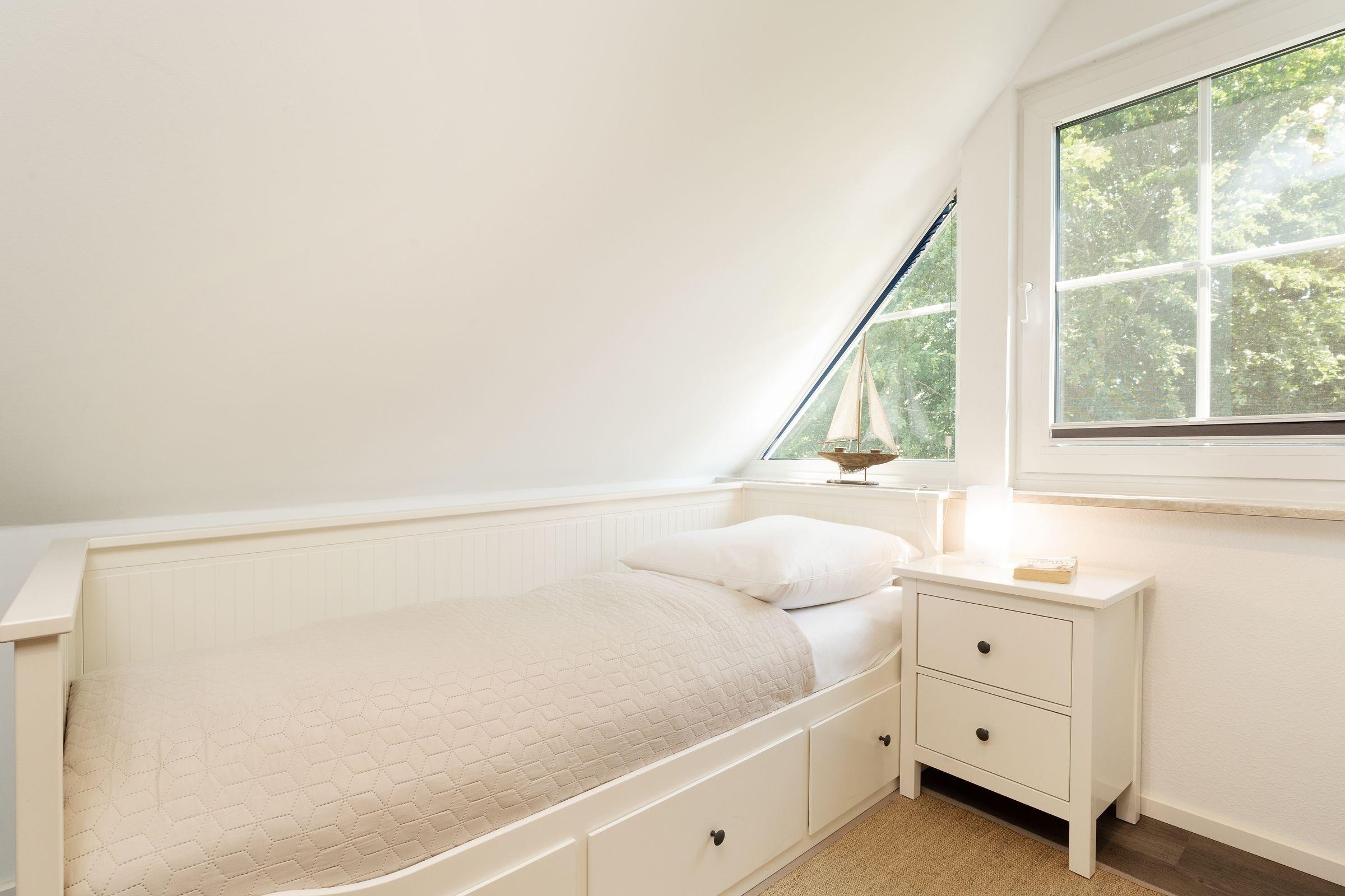 Schlafzimmer 3 (OG): 1 Einzelbett (80x200 cm), Plissees zur Verdunkelung, kein Platz für Babybett vorhanden