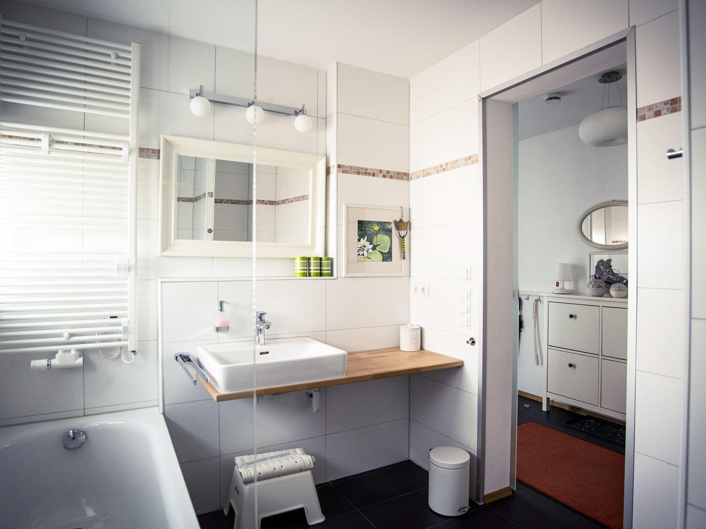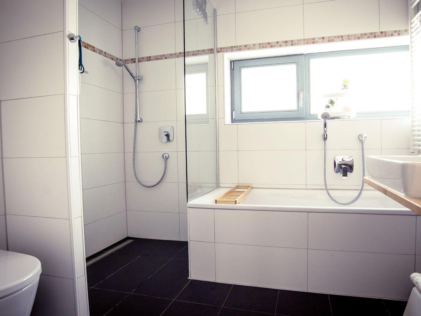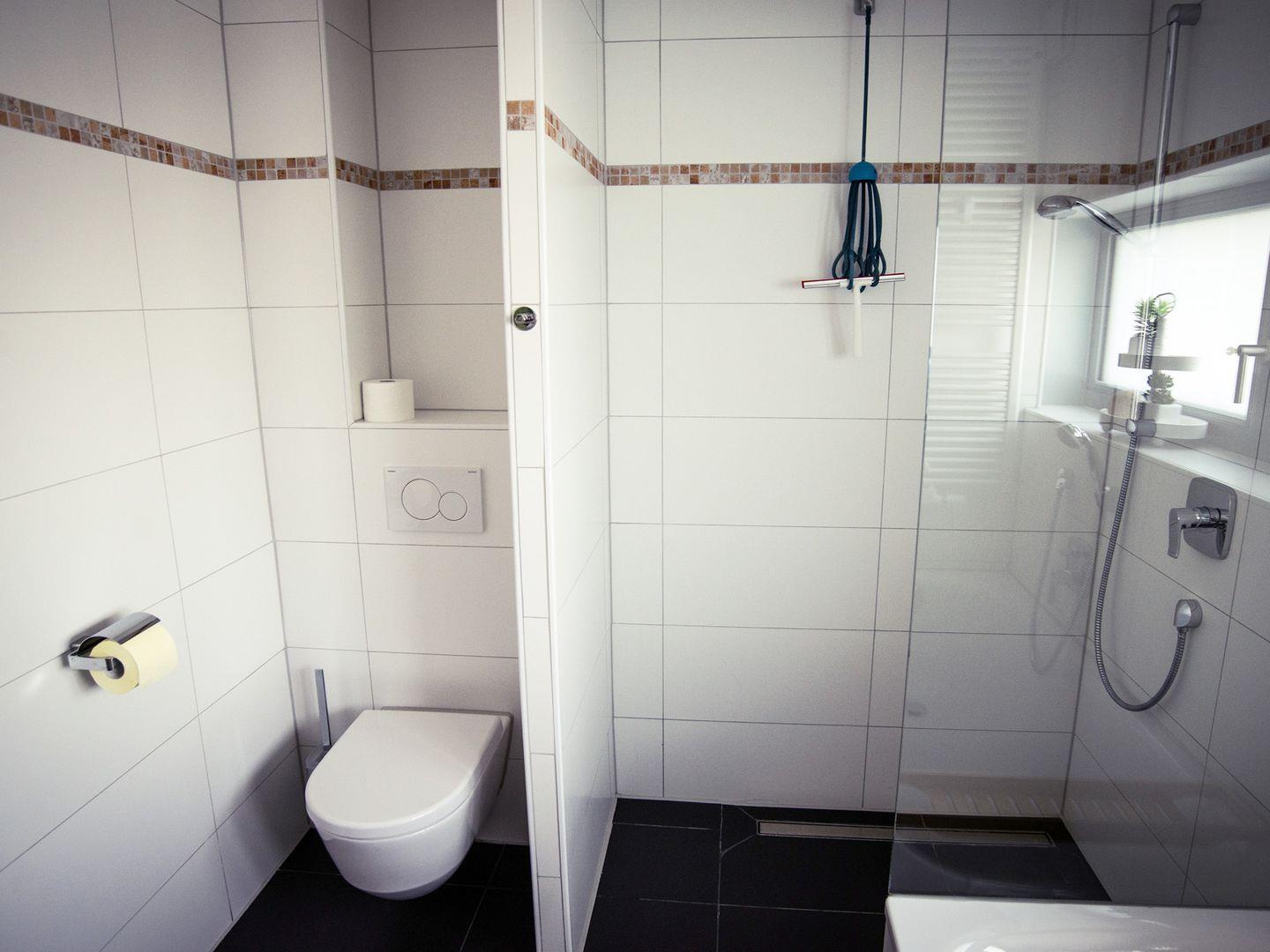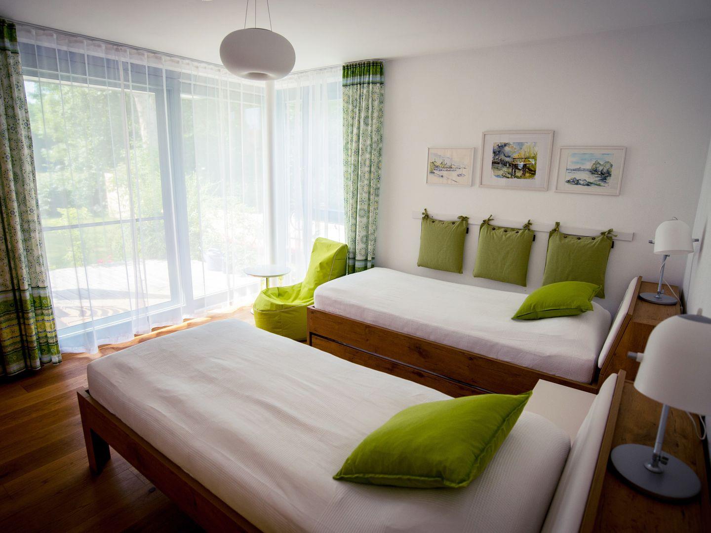 Die beiden Schlafzimmer sind mit sehr guten Matratzen ausgestattet und garantieren erholsamen Schlaf. Eines der Schlafzimmer verfügt über ein Doppelbett und ein eigenes Badezimmer mit bodentiefer Dusche, Waschtisch und Toilette. Das zweite Schlafzimmer ist mit zwei Einzelbetten eingerichtet, auf Wunsch kann ein zusätzliches Bett gestellt werden. Ein weiteres Badezimmer bietet eine Dusche, eine Badewanne, ein WC und einen Waschtisch. Zusätzlich steht ein separates Gäste-WC zur Verfügung. Insektenschutzgitter an allen zu öffnenden Fenstern sorgen für ruhige, ungestörte Nächte.
