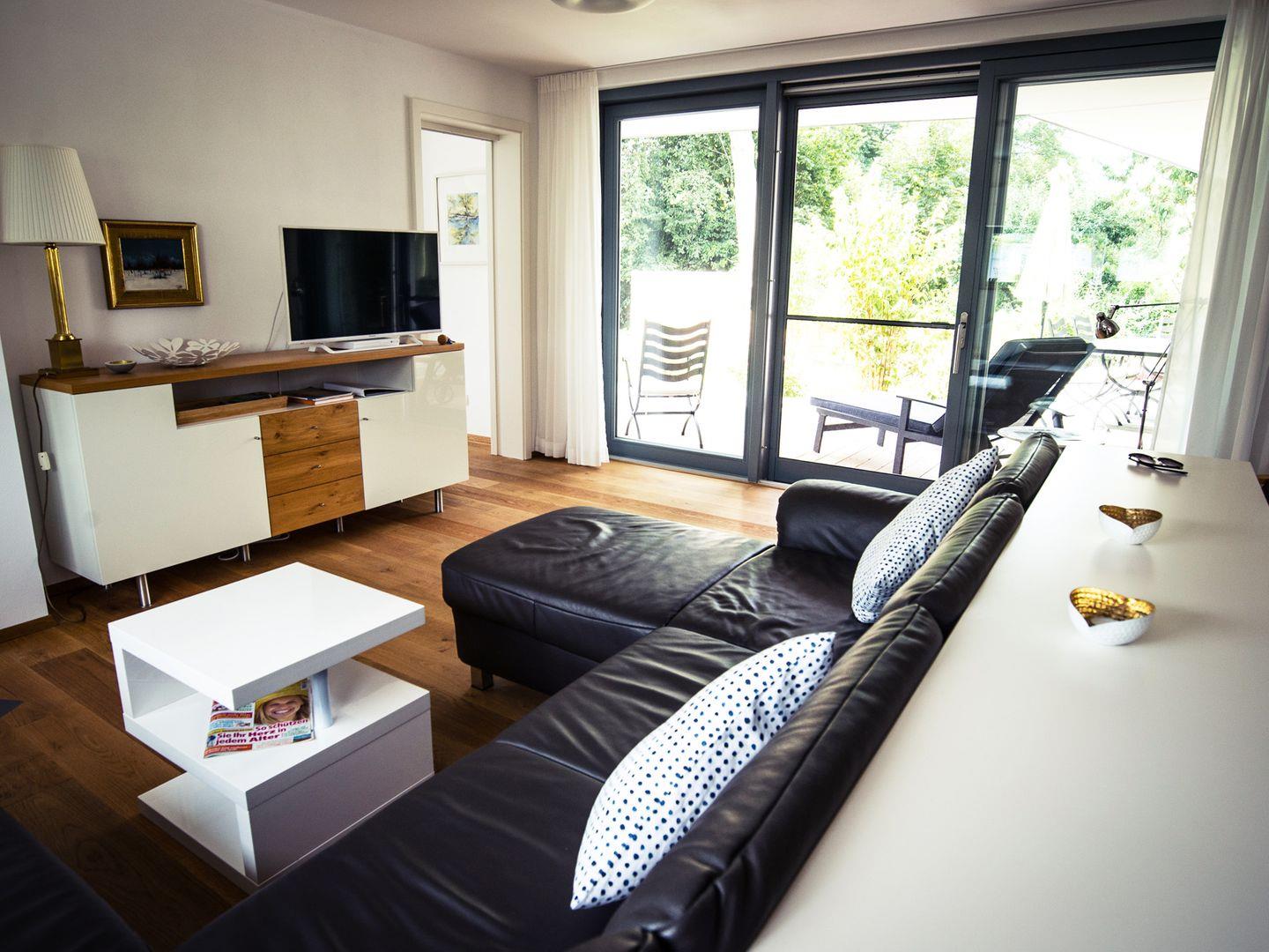 Diese exklusive Neubau-Ferienwohnung in Kressbronn am Bodensee besticht durch ihre außergewöhnliche Lage direkt am See und ihre hochwertige Ausstattung. Sie bietet sonnige, lichtdurchflutete Räume und ist ideal für erholsame Tage zu zweit, mit der Familie oder mehreren Generationen. Der großzügige Wohnbereich vereint stilvolles Design mit maximalem Komfort: Eine moderne Einbauküche, ein eleganter Essbereich, eine bequeme Ledercouch, ein Kaminofen sowie ein gemütlicher Lesesessel schaffen eine einladende Atmosphäre zum Entspannen und Genießen. Bodentiefe Fenster und Türen führen auf die teilüberdachte Terrasse, die sowohl Schutz an warmen Regentagen als auch angenehmen Schatten im Hochsommer bietet.