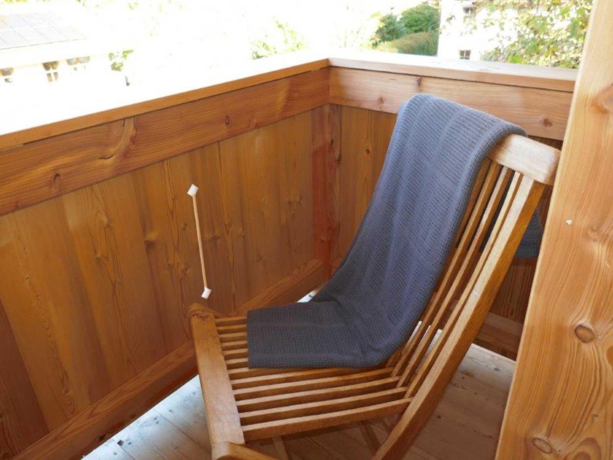 Behagliche, aber moderne Ferienwohnung mit Schwedenofen und Balkon und kleinem Sitzbereich vor dem Haus.