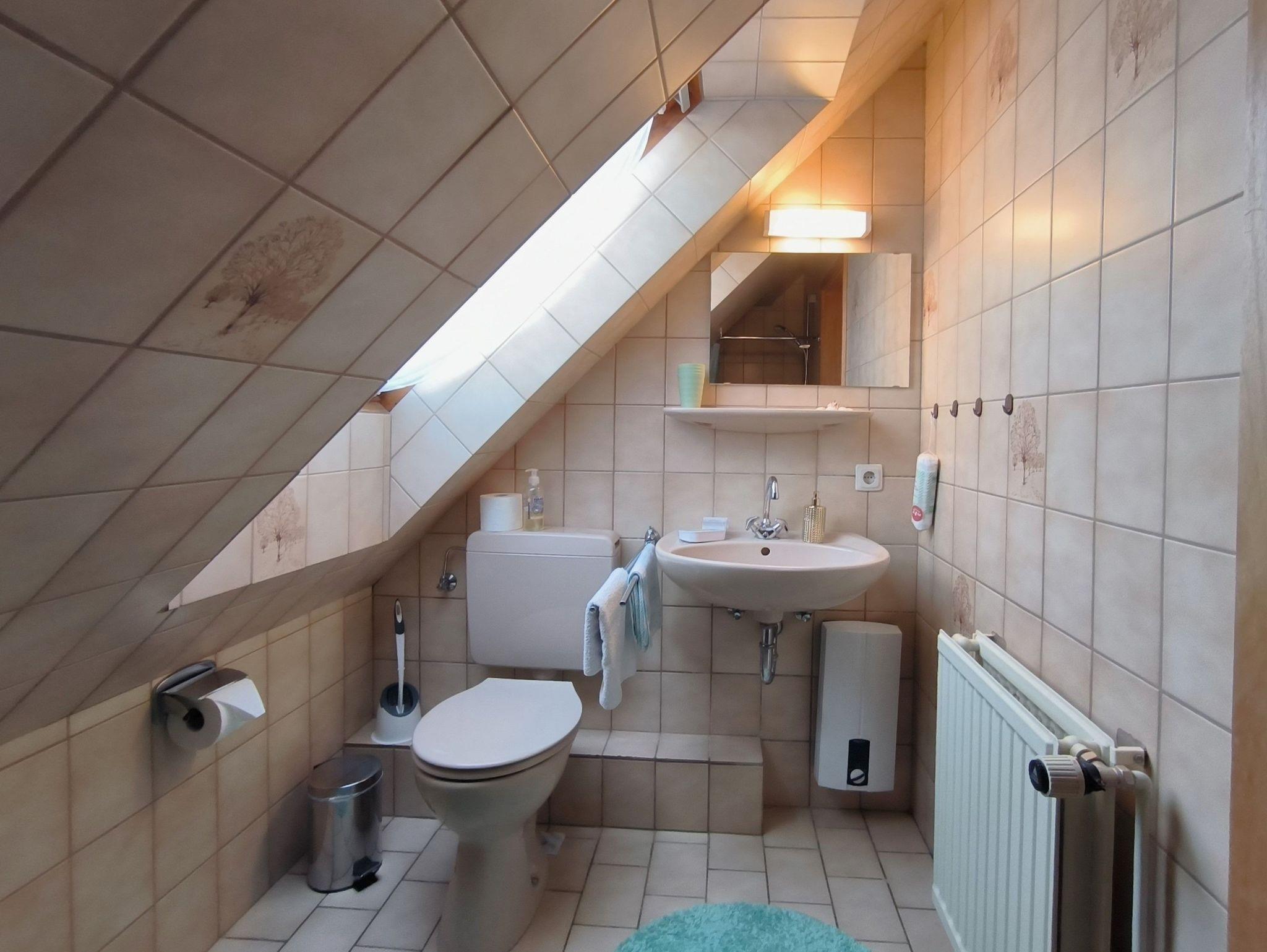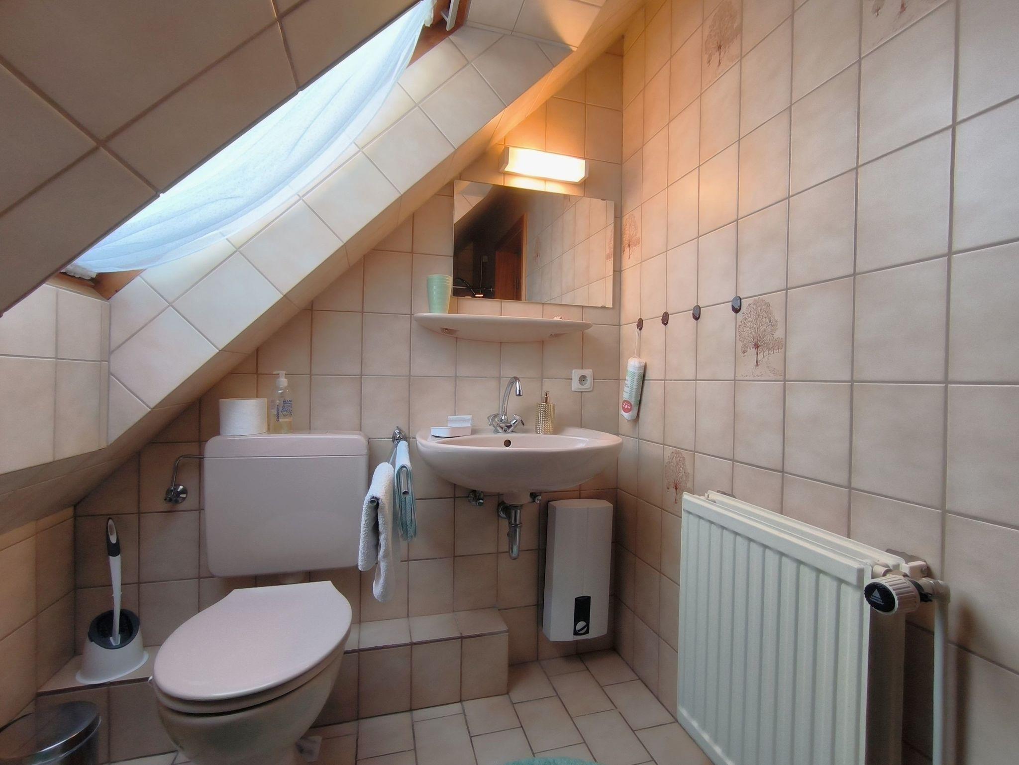 Die Ferienwohnung im Obergeschoss besteht aus einem gemütlichen Wohnzimmer mit offener Küche, zwei Schlafzimmern, einem Duschbad und dem Flur. Das große Schlafzimmer verfügt über ein Doppelbett, einen Kleiderschrank und ein Kinderbett (bis ca. 3 Jahre), in dem kleineren Schlafzimmer stehen zwei Einzelbetten, ein Kleiderschrank und ein Schreibtisch. Beide Schlafzimmer sind verdunkelbar und liegen sehr ruhig. Im Wohnzimmer gibt es eine Sitzecke mit TV, einen großen Esstisch und eine Küchenzeile mit Kühlschrank, Herd, Backofen, Spüle und ausreichend Küchenutensilien zum Zubereiten von leckeren Urlaubsmahlzeiten. Eine Spülmaschine ist nicht vorhanden. Das Bad mit Fenster hat eine Dusche, eine Toilette und einen Waschtisch - ein Föhn ist auch vorhanden. Eine Waschmaschine im Erdgeschoss kann von allen Gästen gegen eine kleine Gebühr genutzt werden, auch Fahrräder zum Leihen und der Grill und die Sitzecken im Garten stehen allen Feriengästen zur Verfügung. Die Betten sind bei Ankunft bereits bezogen und Handtücher sind ebenso vorhanden.