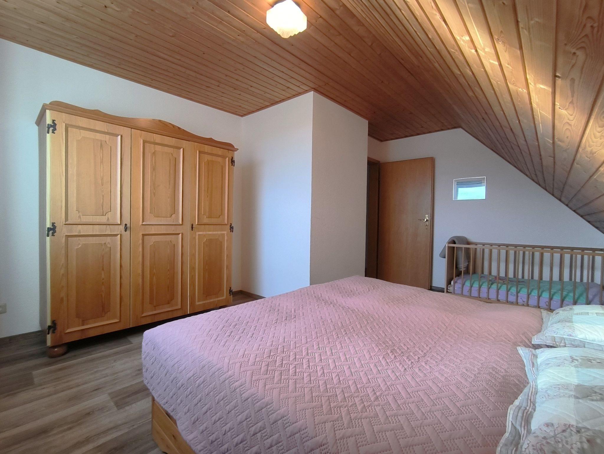 Die Ferienwohnung im Obergeschoss ist mit 80 qm sehr geräumig und verfügt über vier vollwertige Schlafplätze in zwei Schlafzimmern. Ebeneso ist ein Kinderbett im großen Schlafzimmer mit Doppelbett vorhanden, auf Anfrage kann eine weitere Person (Kind) untergebracht werden. Es gibt einen großen Wohn- und Essbereich mit Küchenzeile sowie ein Duschbad in der Ferienwohnung, die Gäste dürfen den teilwiese eingezäunten und rundherum blickdicht bewachsenen Garten mit verschiedenen Sitzgelegenheiten und einem Grill nutzen.