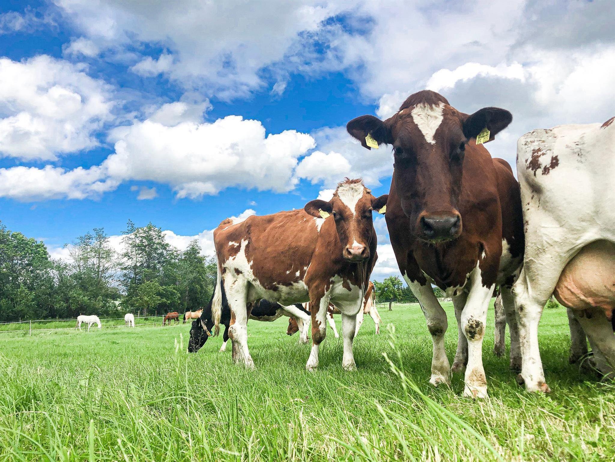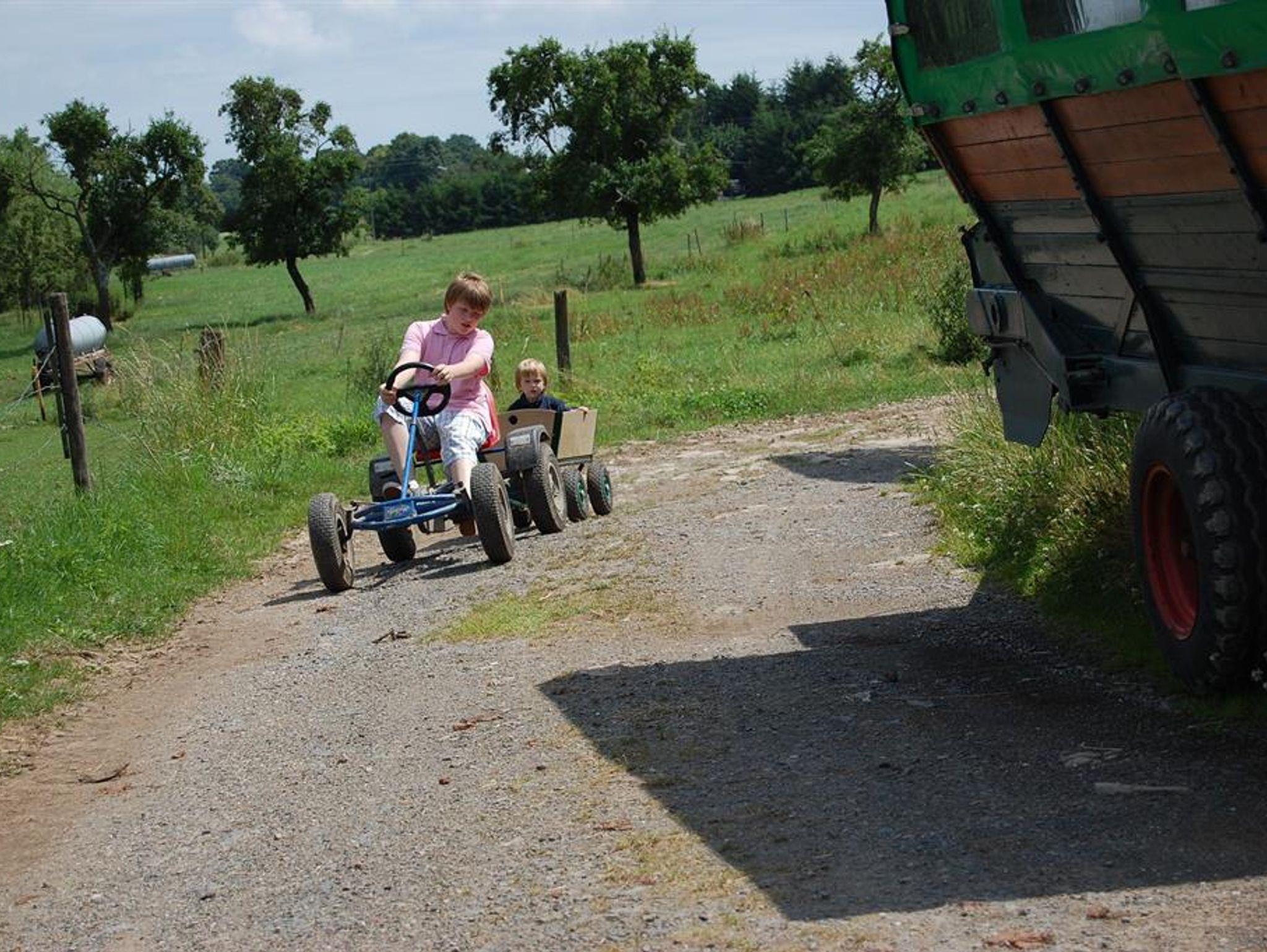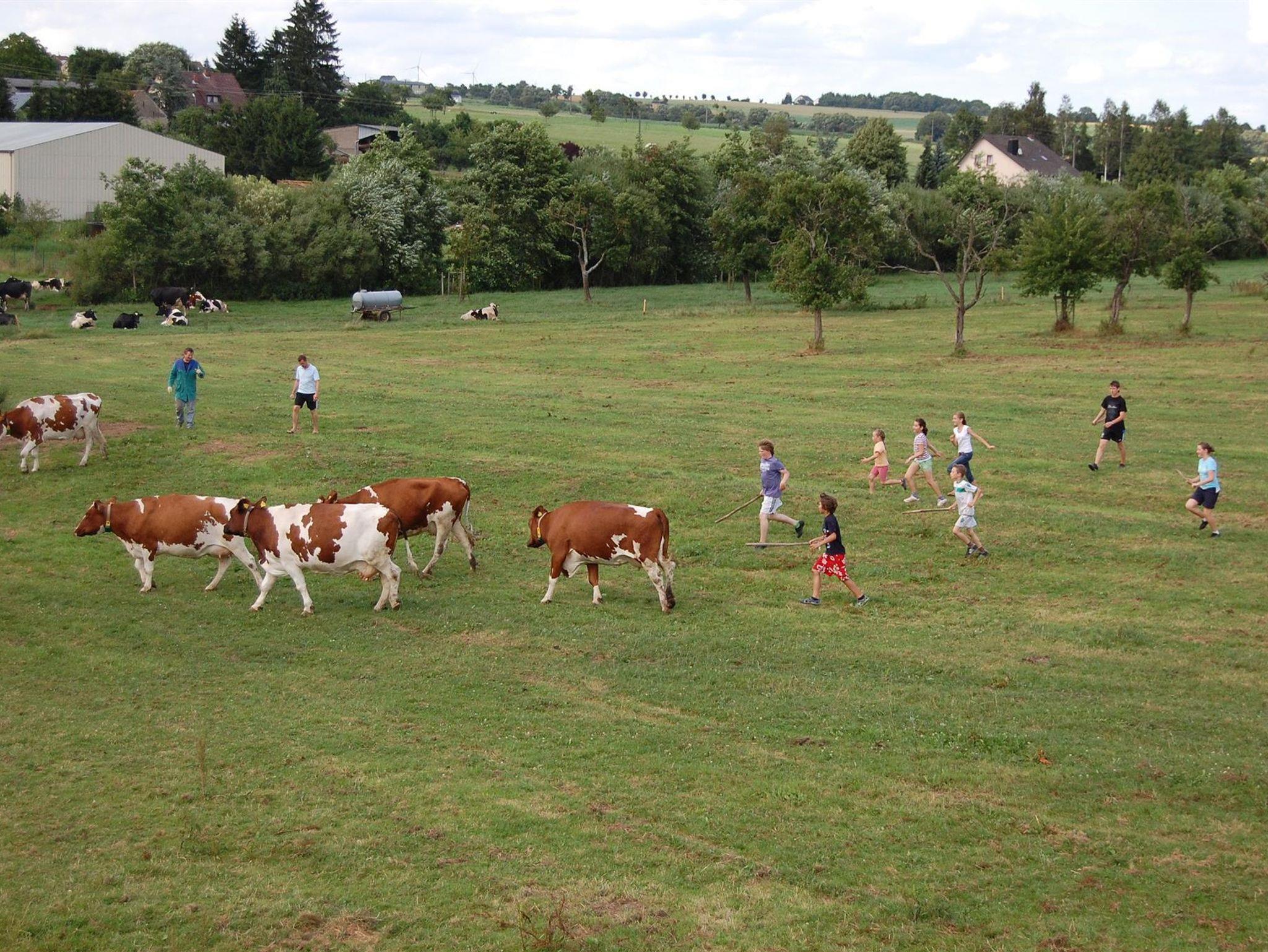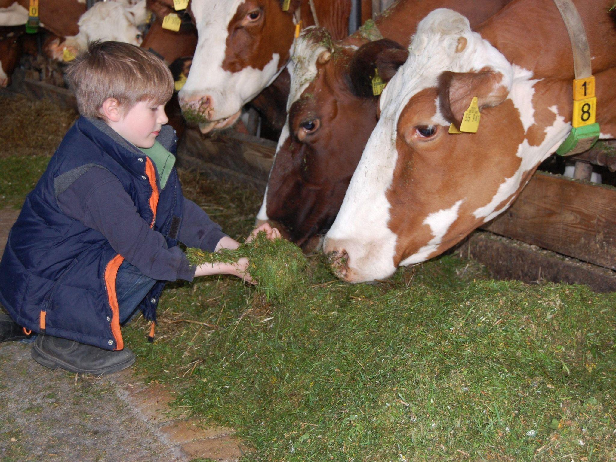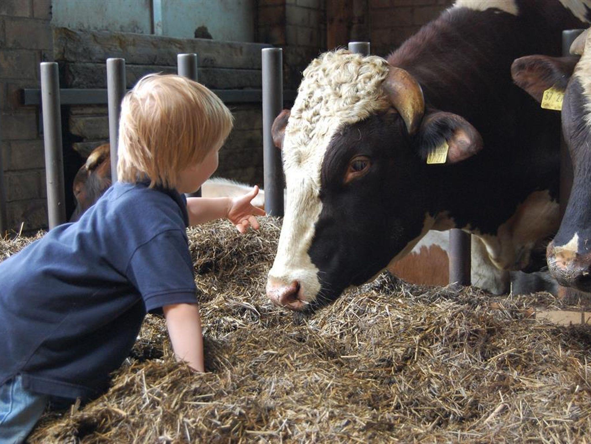 Zum Ferienhof gehört ein voll bewirtschafteter Bauernhof mit Kühen, Ponys und Katzen in 150 m Entfernung. Hier können Sie hautnah beim Melken zusehen und mithelfen oder mit dem Traktor mitfahren.