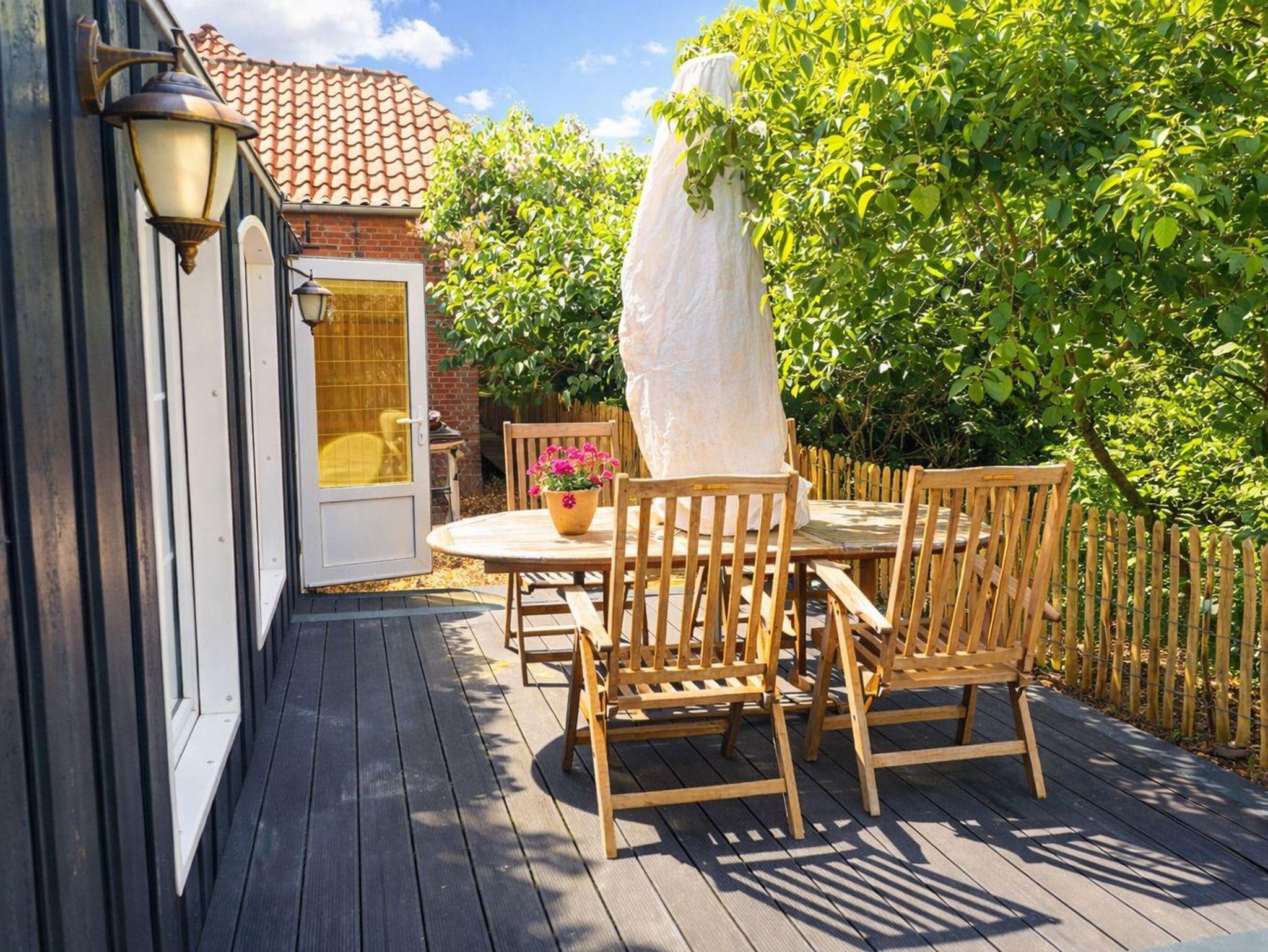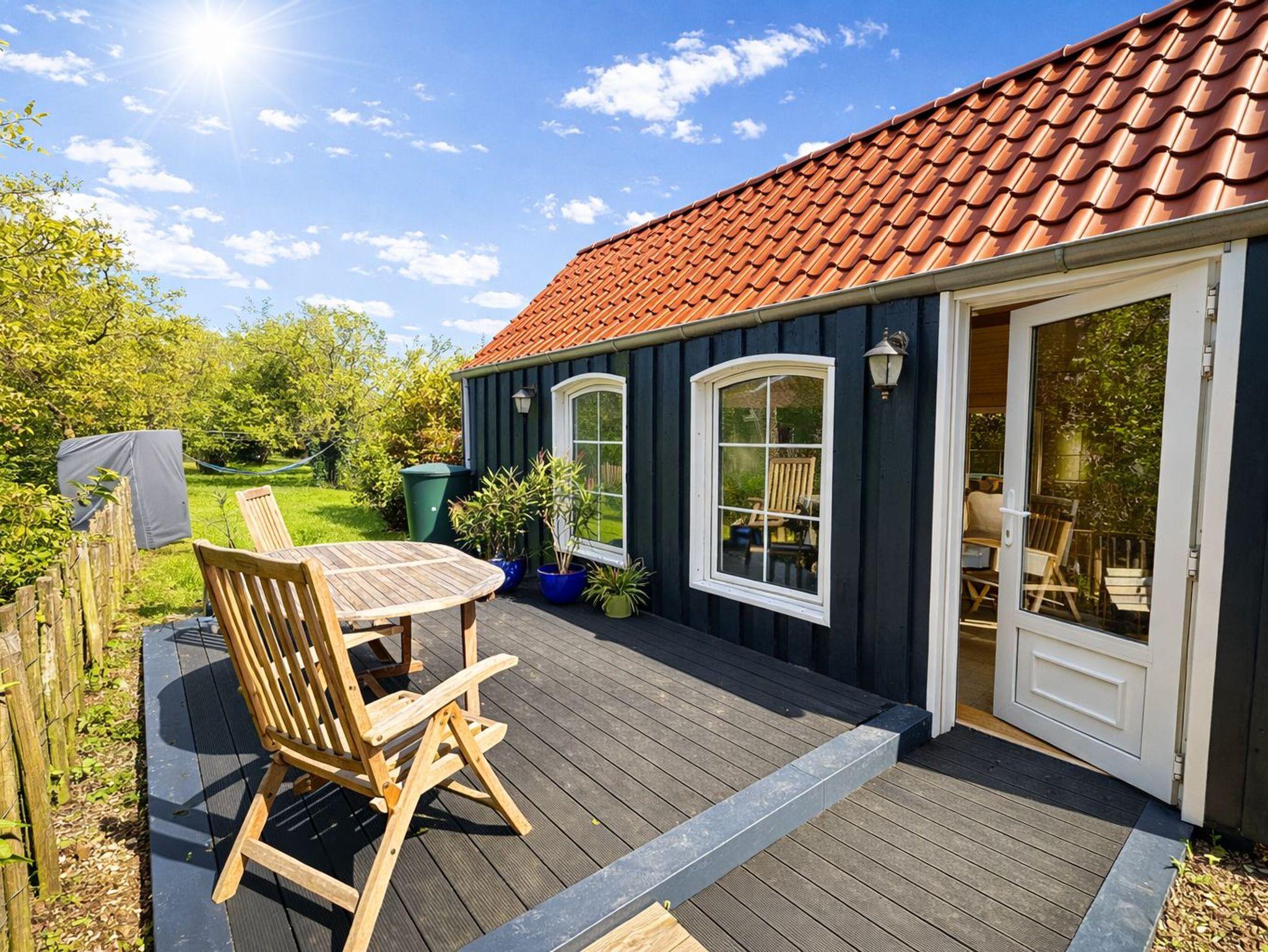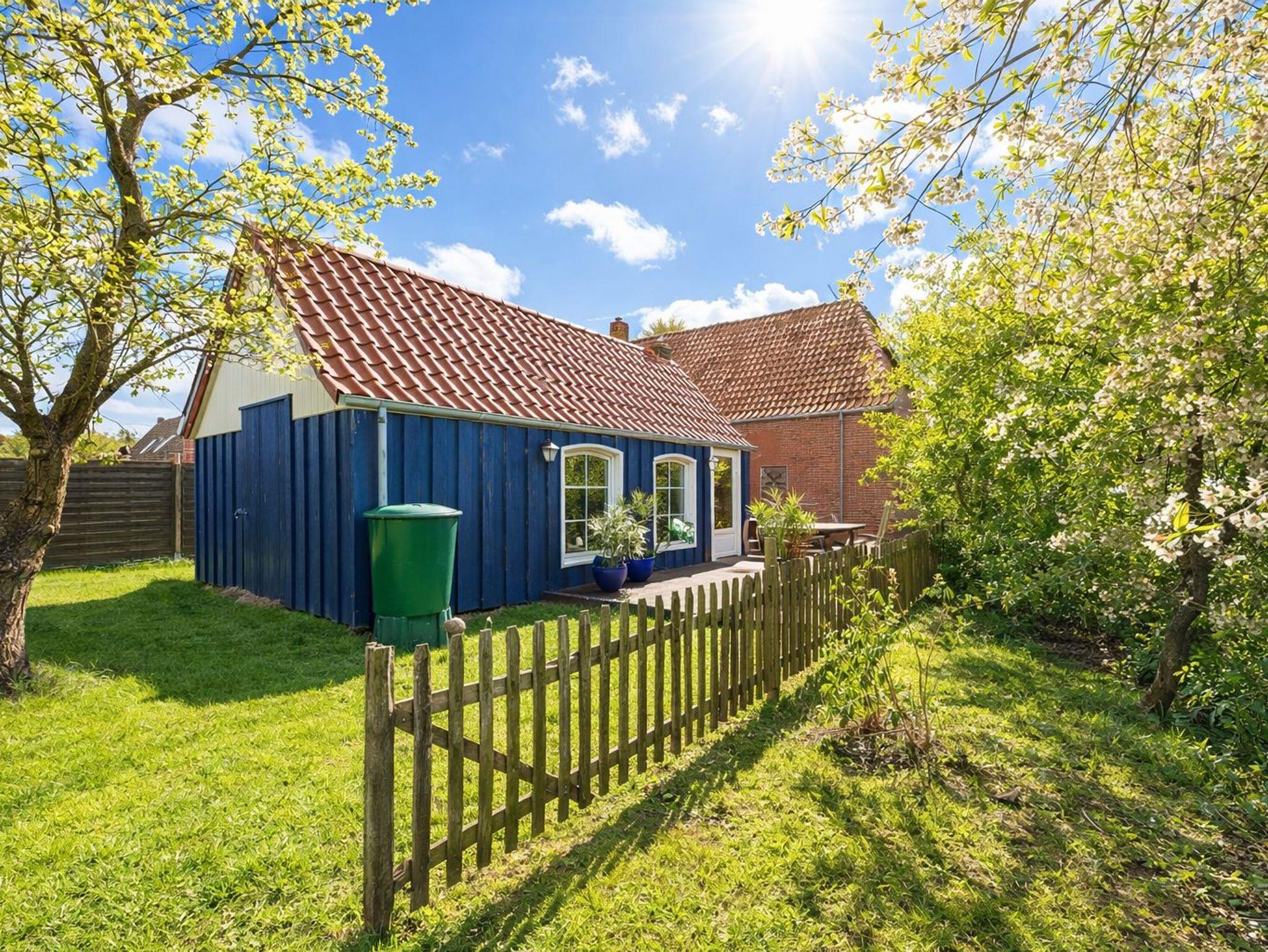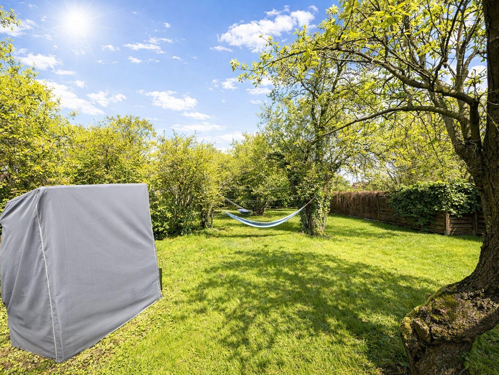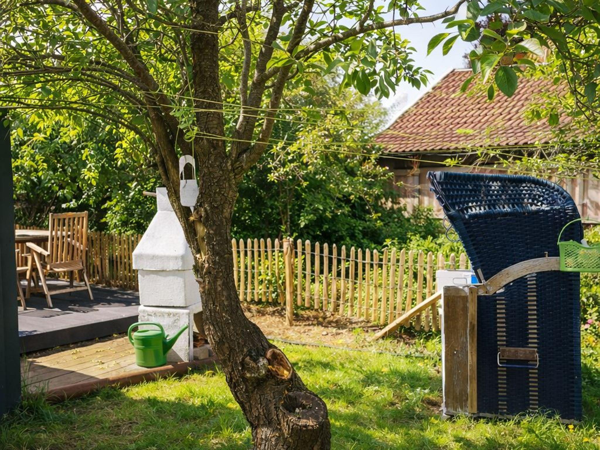 Der Garten hat einen Strandkorb, einen Grill und eine Gartentischgruppe, eine Terrasse und ein Gartenhaus mit Kamin.
