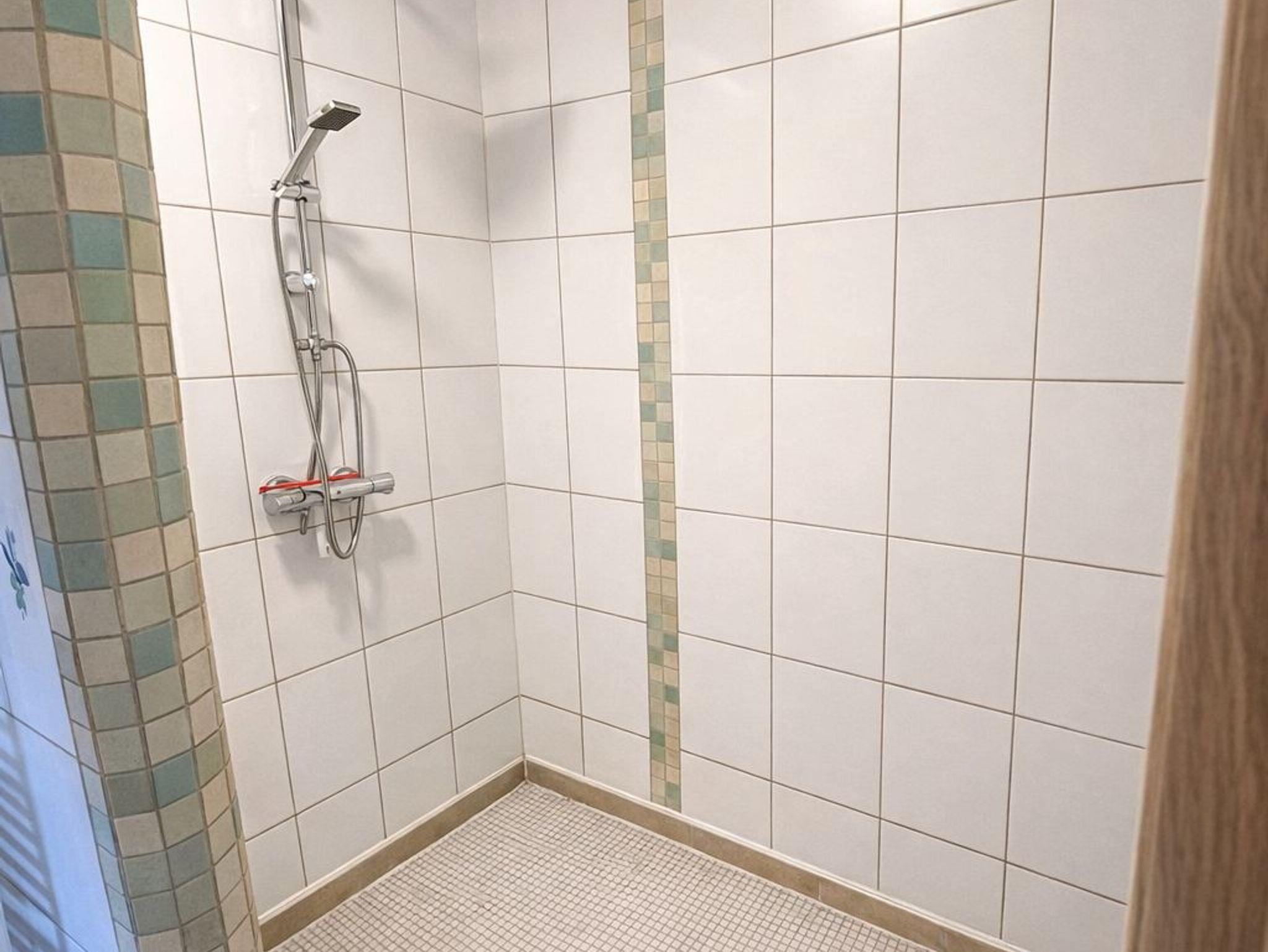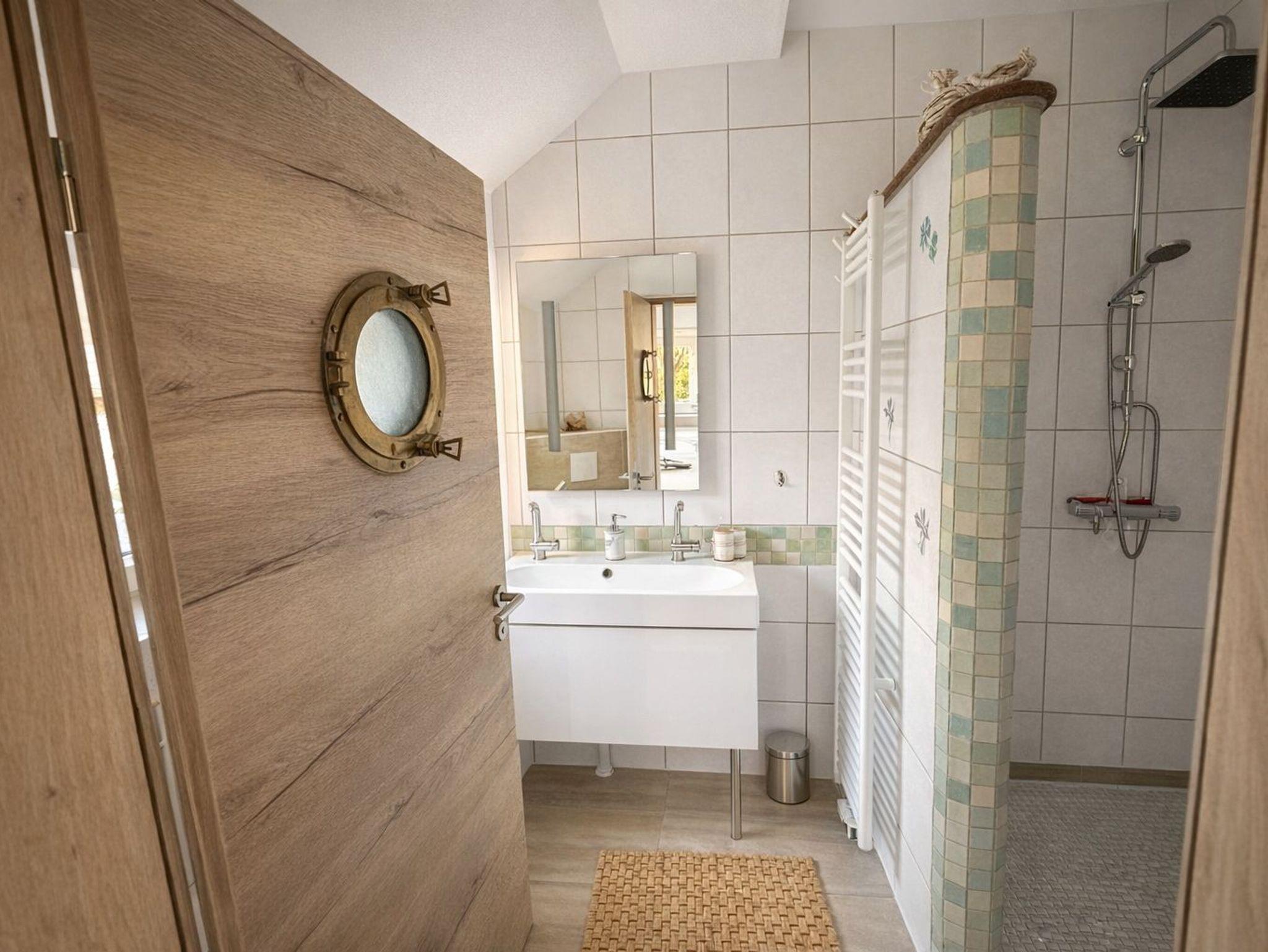 Das Bad hat eine bodentiefe Dusche und ist mit Handtüchern ausgestattet.
