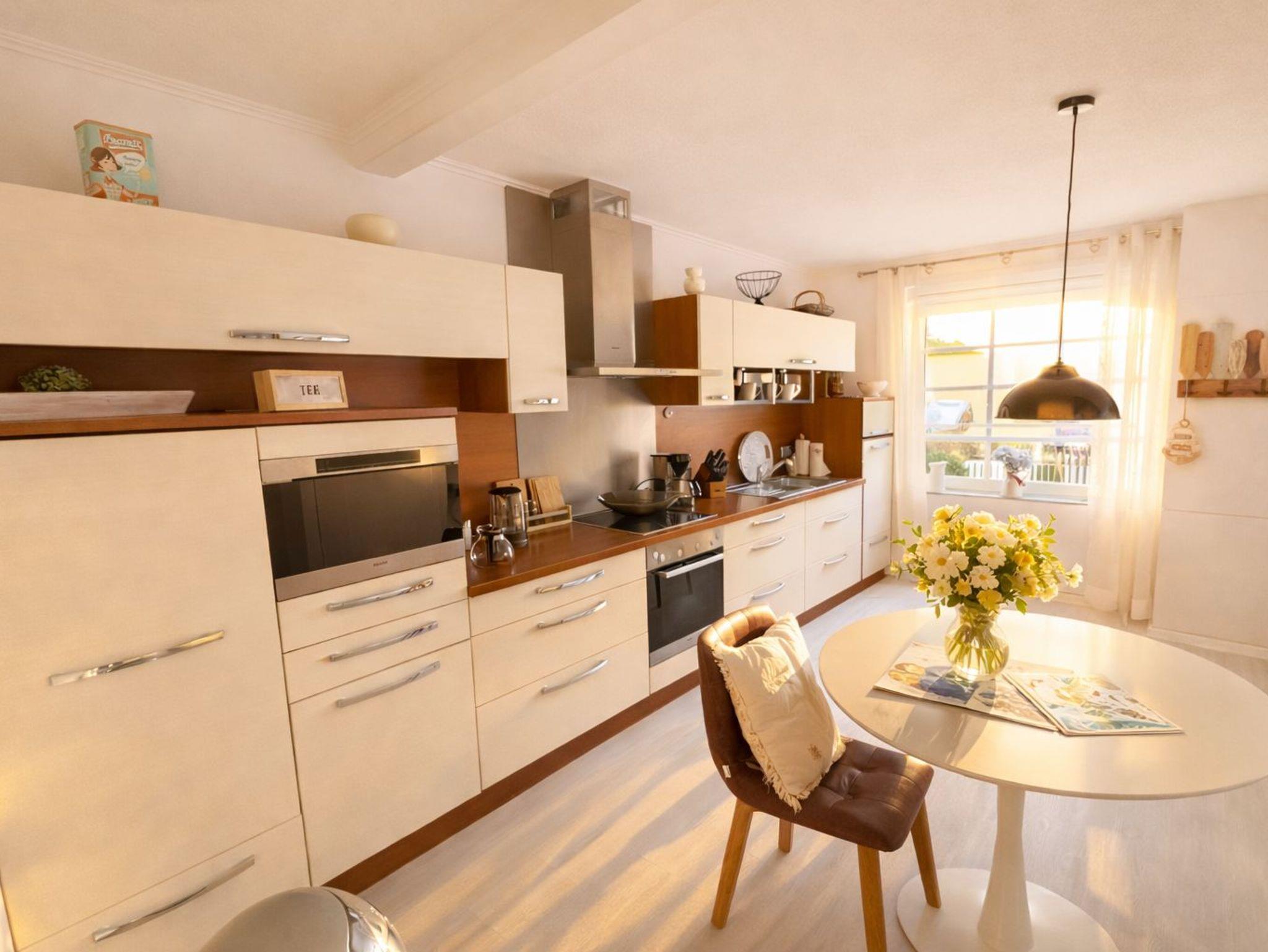 Die Wohnung mit Wohnzimmer, Schlafzimmer, Küche und Duschbad hat eine hochwertige Küche mit Miele-Geräten, Spülmaschine, Dampfgarer, Kühlschrank und Backofen. Hier macht das Frühstücken richtig Spaß.