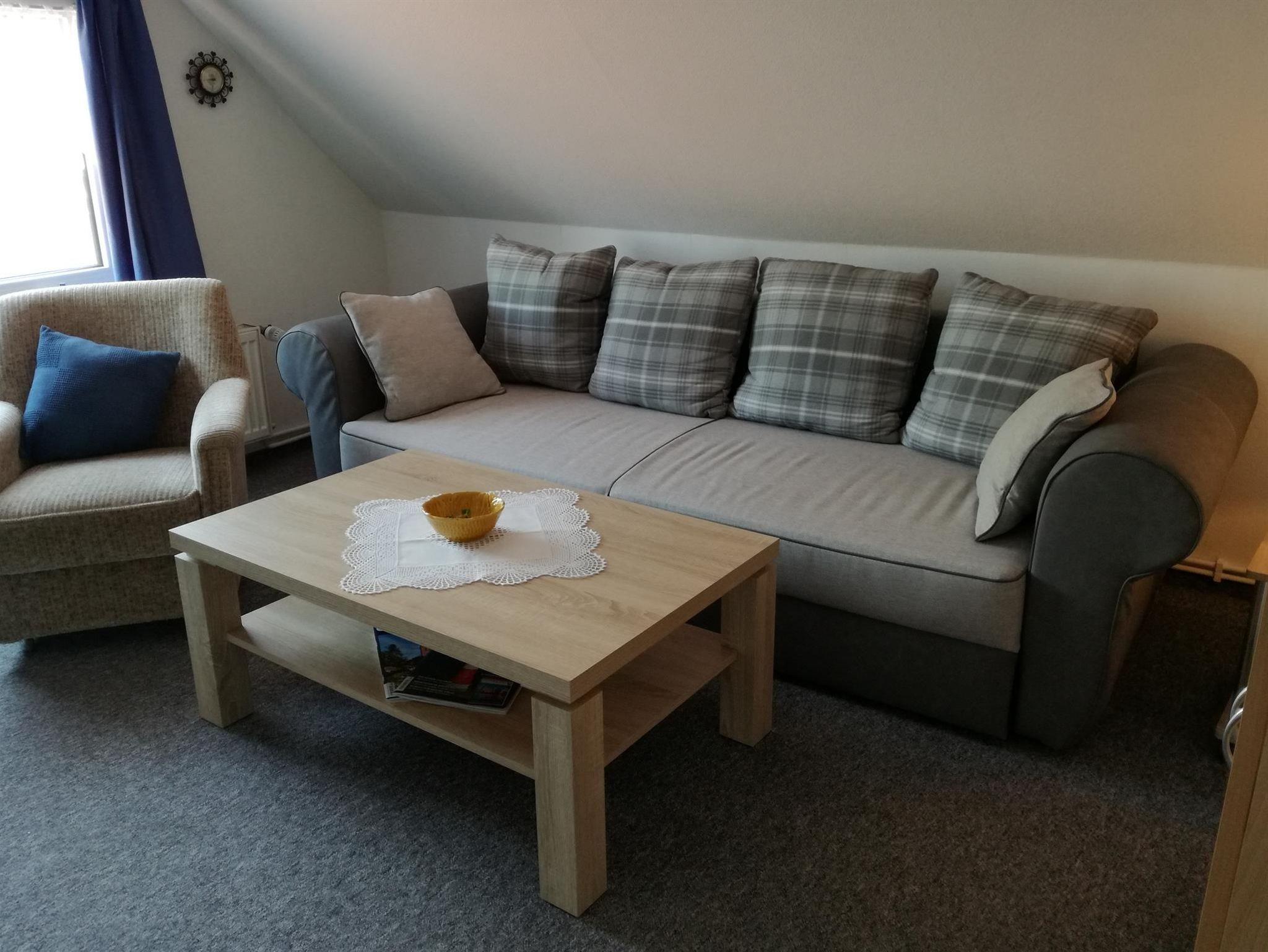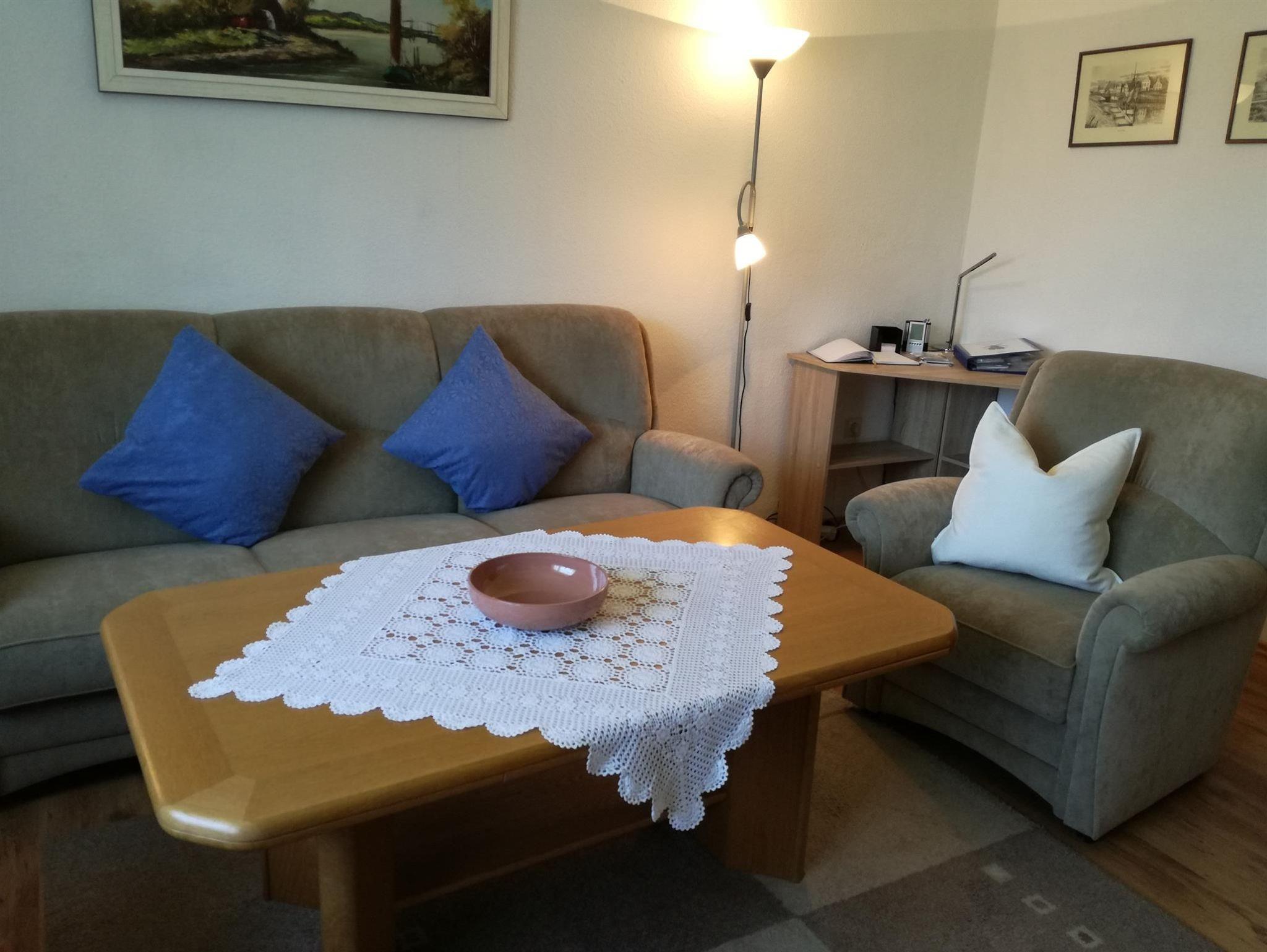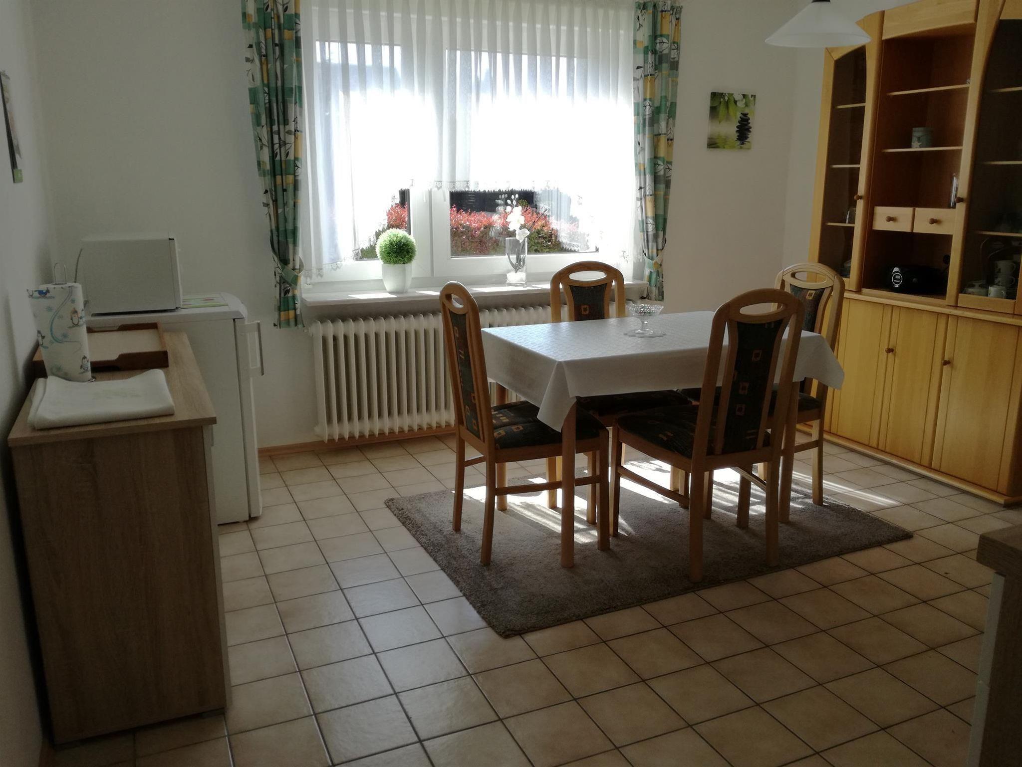 Die ca. 50 qm große Ferienwohnung in der 1. Etage hat ein Wohnzimmer mit Couchgarnitur, Sat TV, Radio und Schrank. Eine separate Küche mit Backofen, Ceranfeld, Kühlschrank, Kaffemaschine usw. finden Sie ebenfalls. Die Schlafzimmer sind aufgeteilt in einem Doppelzimmer mit kompletter Einrichtung und ein Einzelzimmer bei dem auf Wunsch ein Zustellbett (für Kleinkinder) mit rein gestellt werden kann. Im Badezimmer befindet sich eine Dusche. Handtücher werden kostenlos gestellt. Großer Garten mit Grillmöglichkeit zur Verfügung.