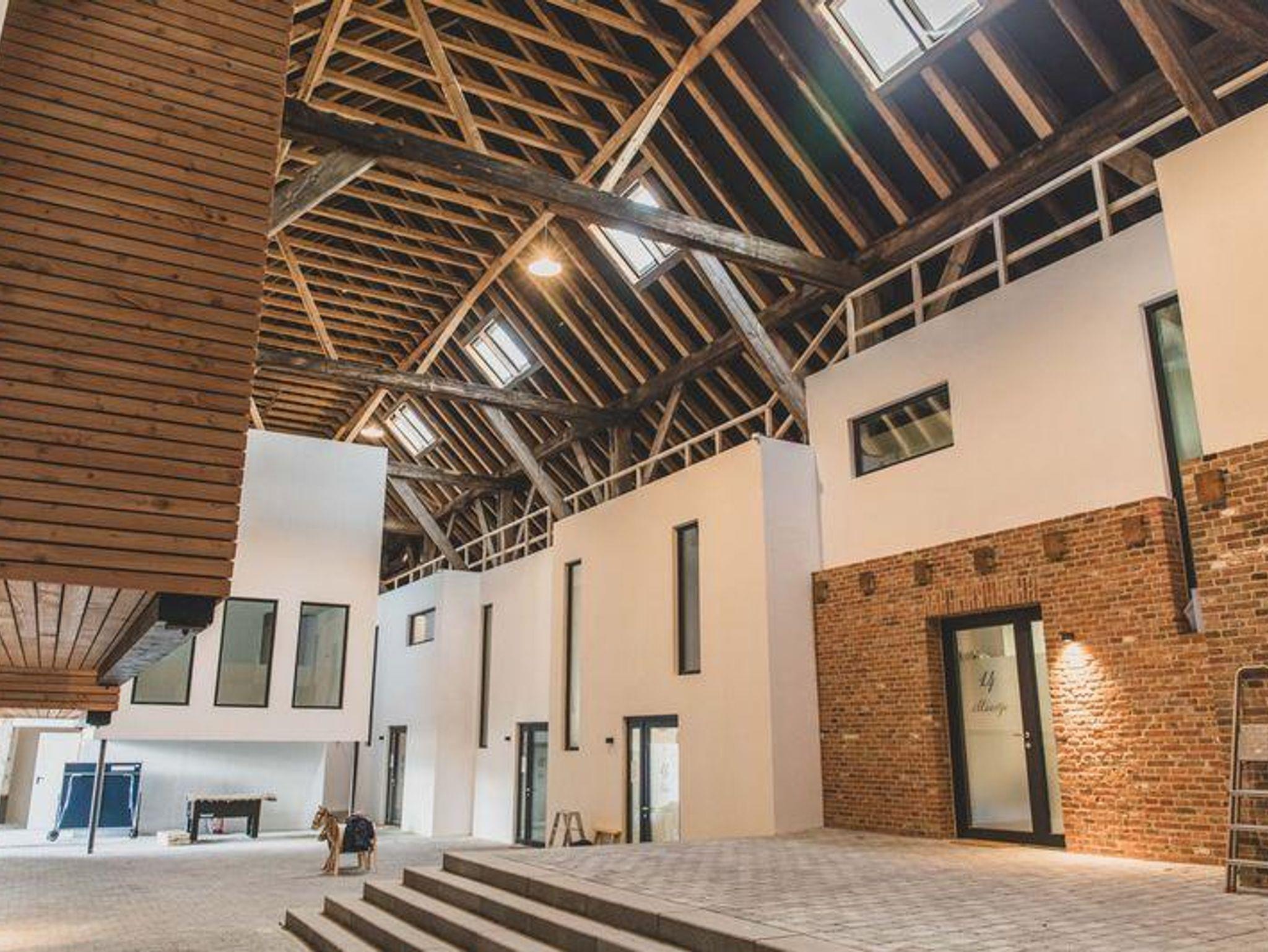 Alle Wohnungen sind Maisonette und zeichnen sich durch moderne, Grundrisse aus. Durch die Einbeziehung des historischen Ständerfachwerks in die Wohnraumgestaltung erhalten die Einheiten zudem eine besondere, unverwechselbare Note. Fußbodenheizung, Echtholz-Parkettböden sowie Armaturen und Keramik namhafter Hersteller versprechen einen hohen Wohnkomfort. Zu jeder Wohnung gehört eine großzügige Terrasse sowie ein PKW-Stellplatz mit Abstellschuppen. Die Außenanlagen des rund 4000 qm großen Grundstücks zeichnen sich besonders an der Südseite und Ostseite durch großzügige Grünflächen aus, die mit Sträuchern und Hecken geschmackvoll angelegt wurden. Ein alter Baumbestand rundet das Gesamtbild ab.