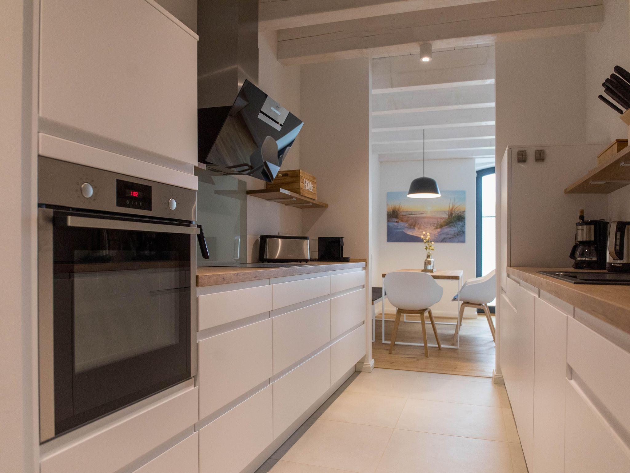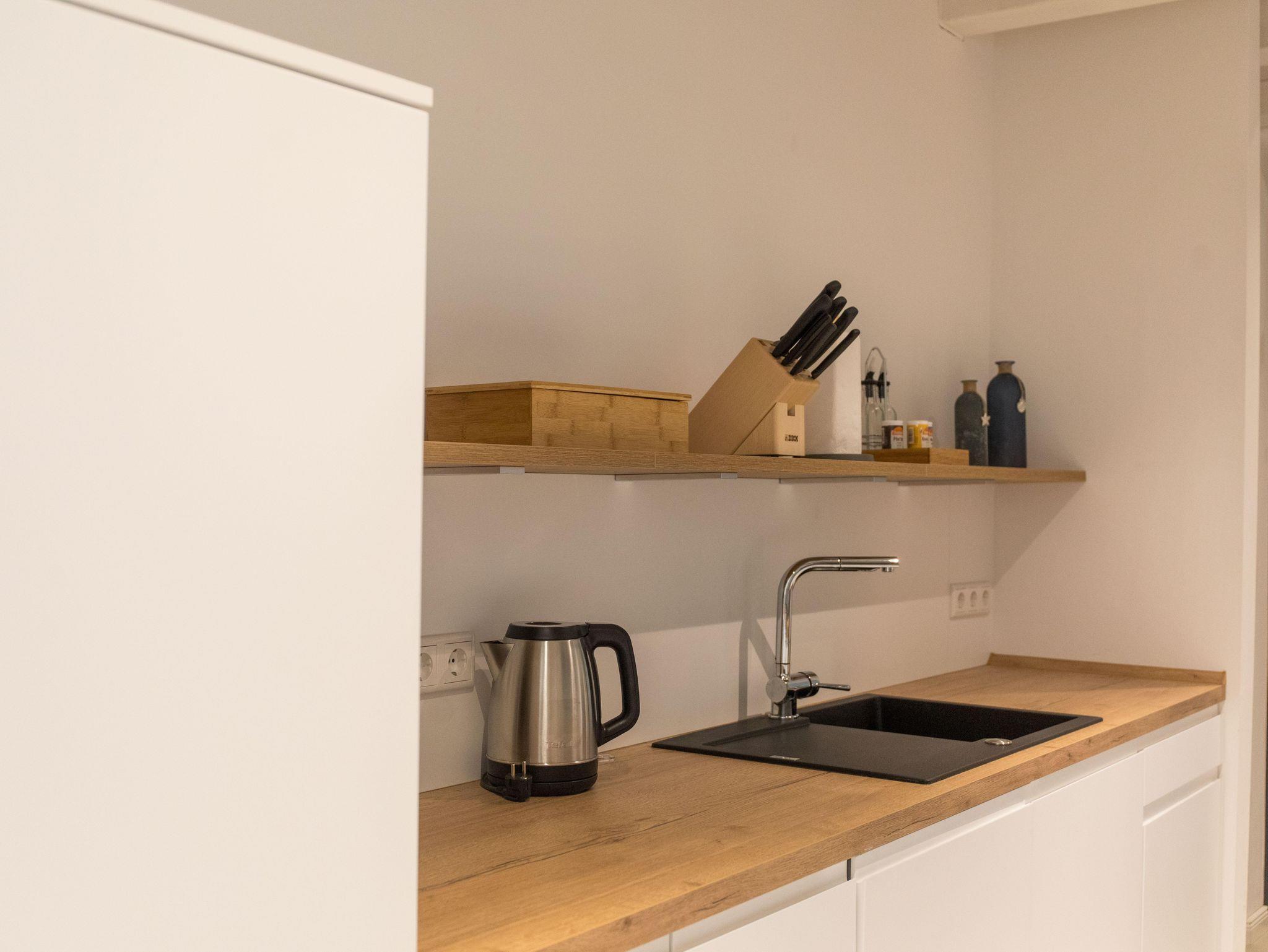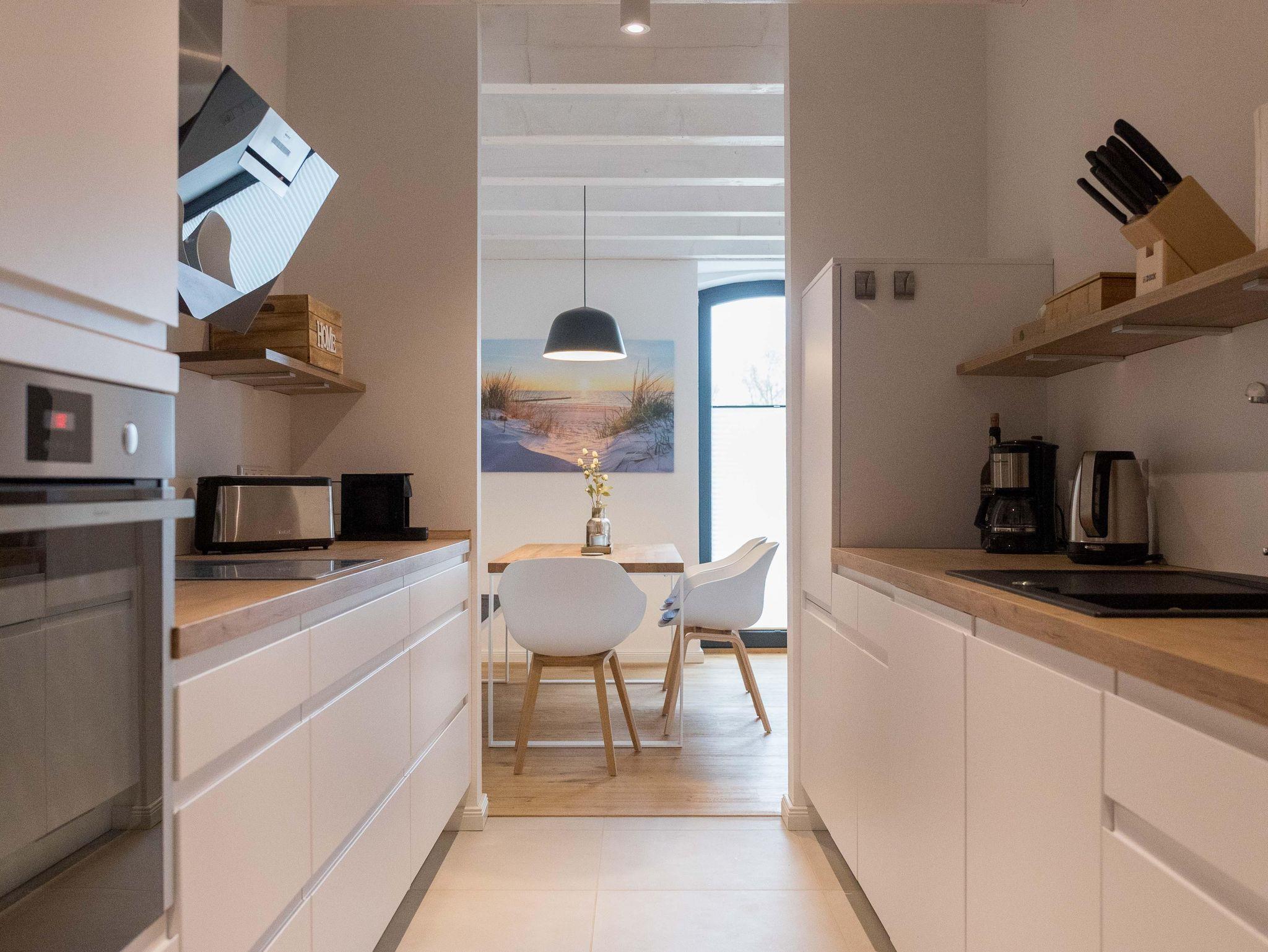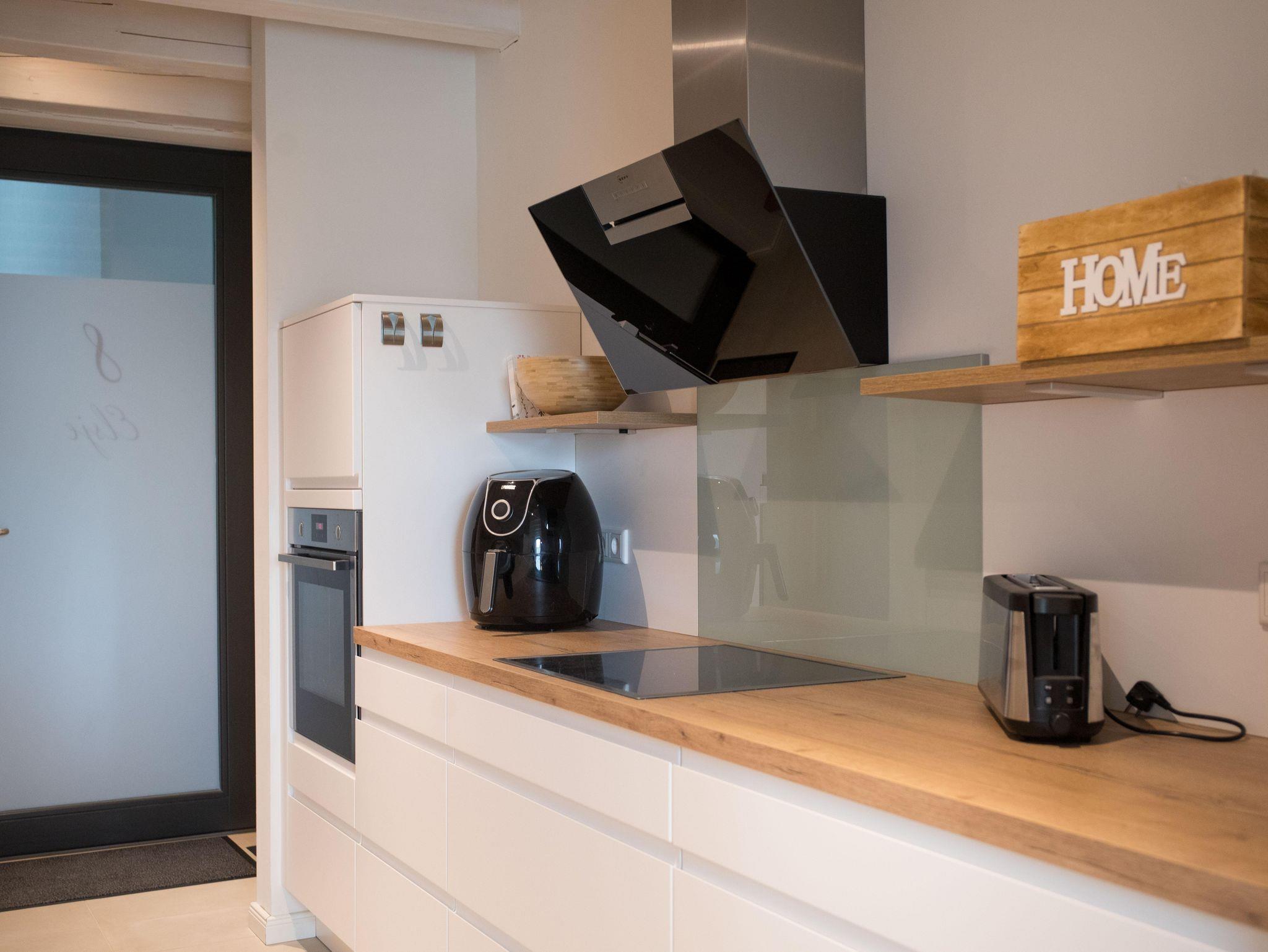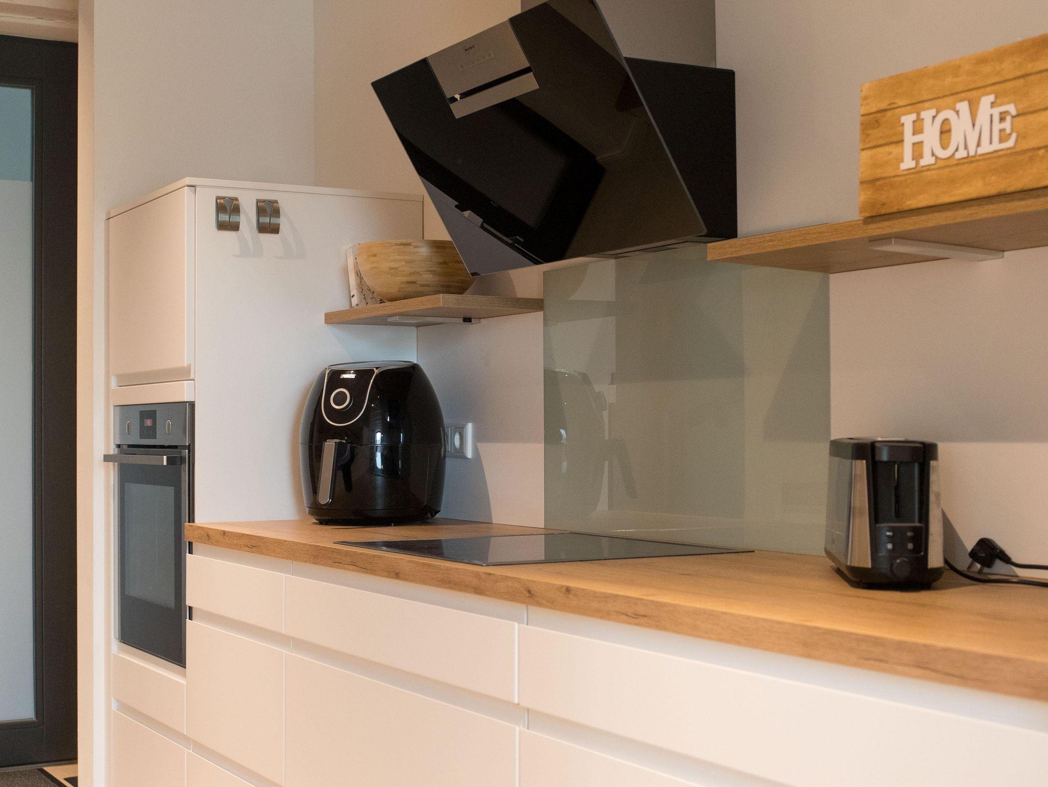 Die Wohnung verfügt über eine gut ausgestattete Küche im Eingangsbereich. Hier stehen Ihnen alle wesentlichen Küchenutensilien zur Verfügung, von der Induktionsherdplatte über eine moderne Espressomaschine bis hin zu einer Heißluftfritteuse.