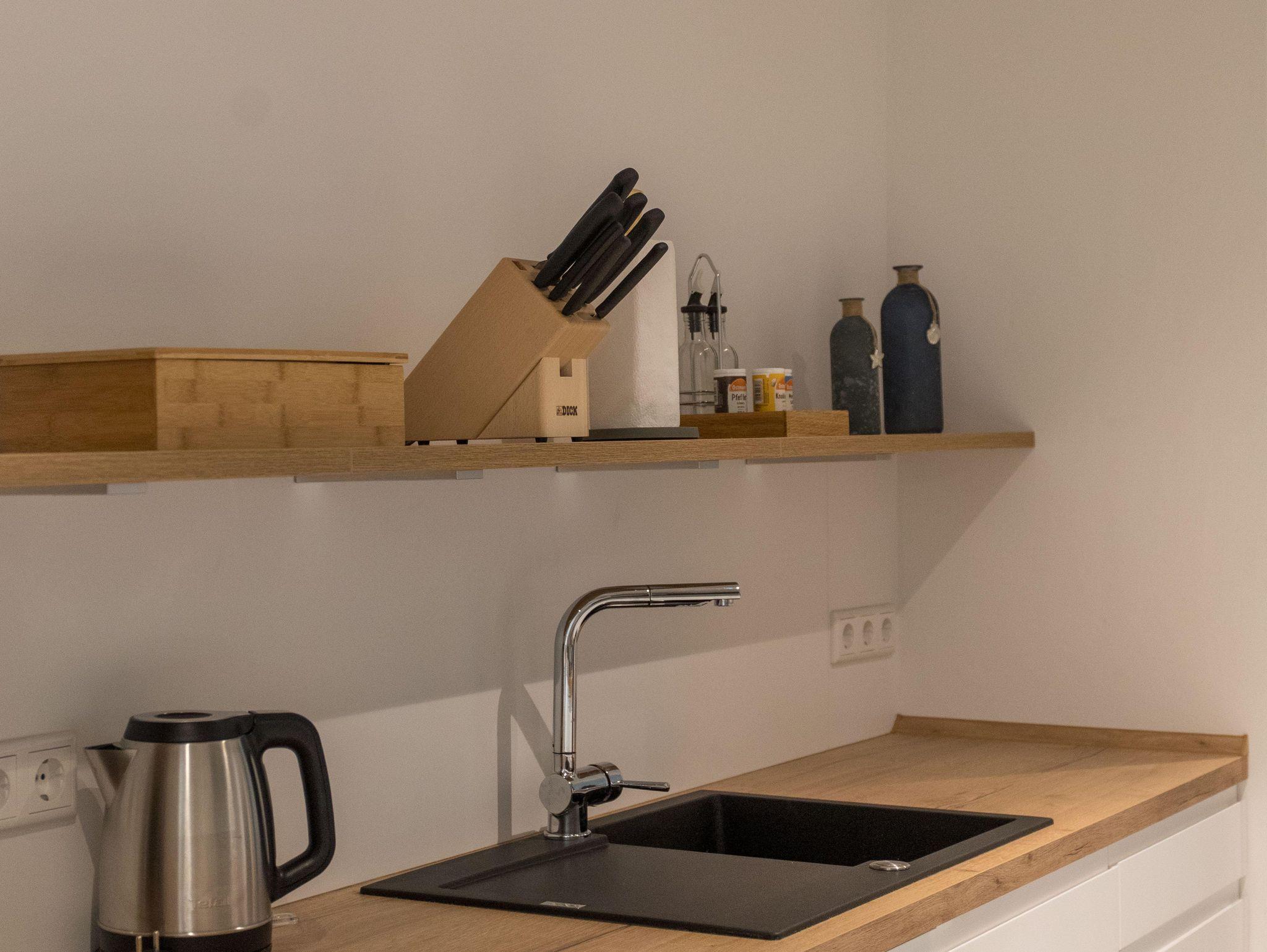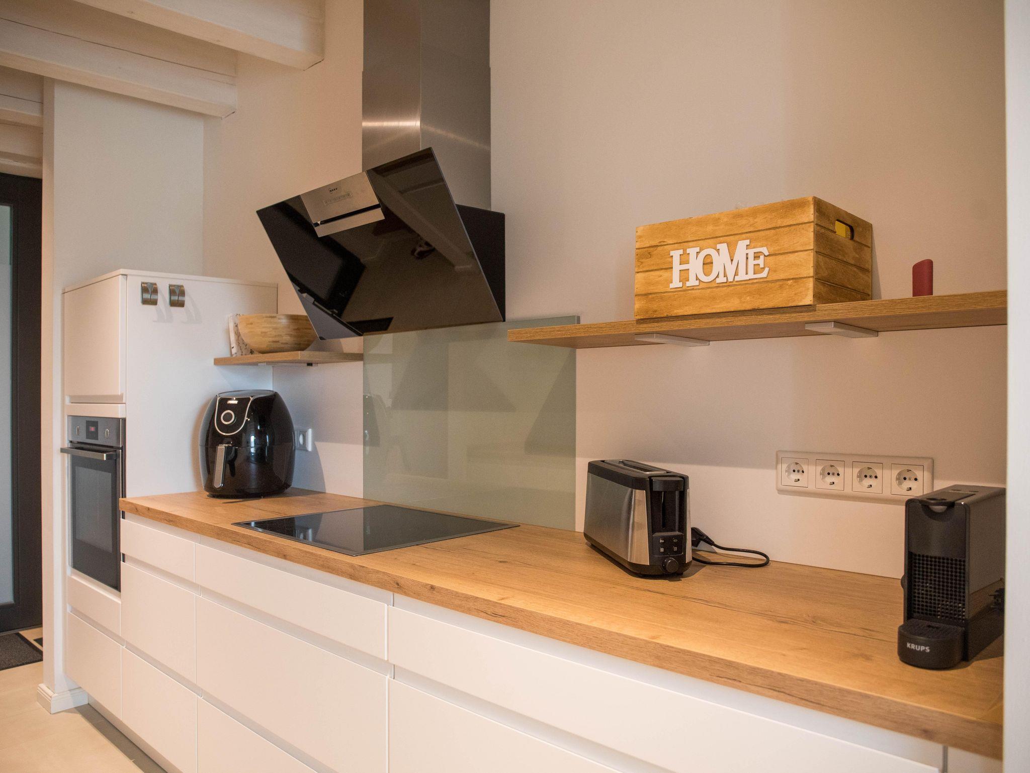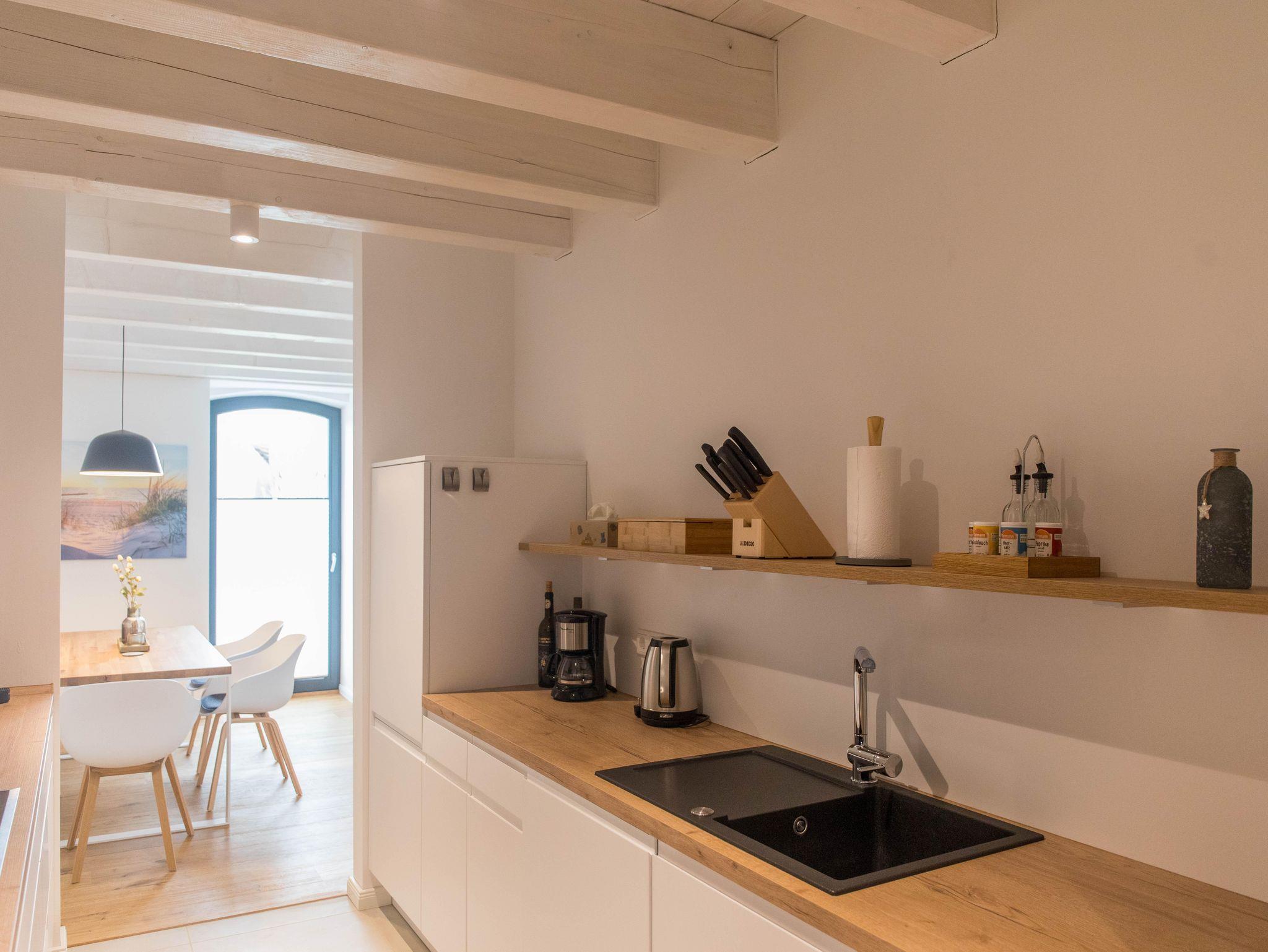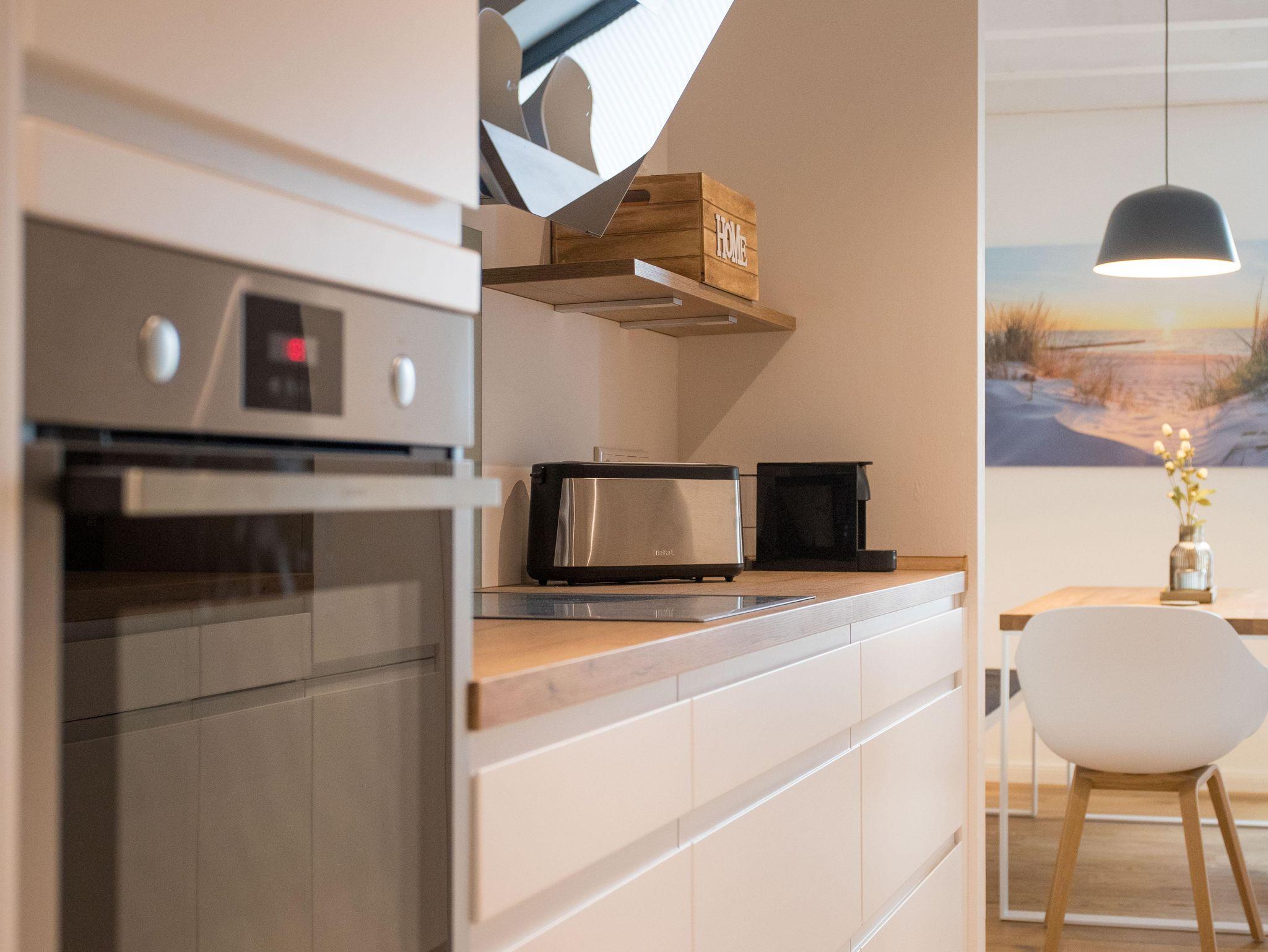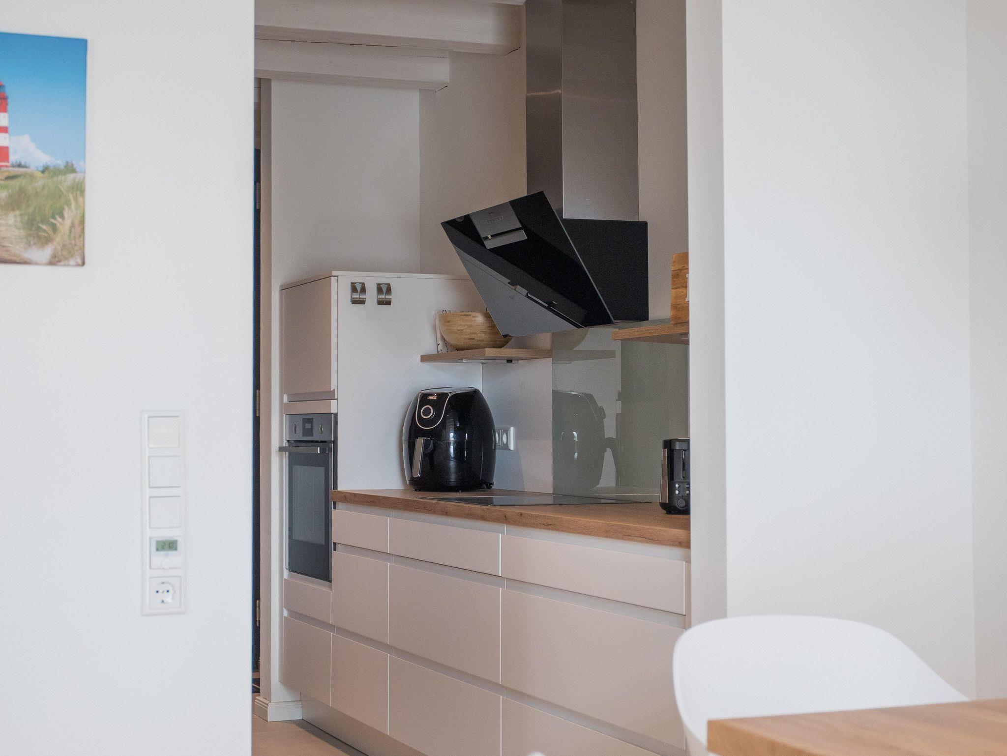 Die Wohnung verfügt über eine gut ausgestattete Küche im Eingangsbereich. Hier stehen Ihnen alle wesentlichen Küchenutensilien zur Verfügung, von der Induktionsherdplatte über eine moderne Espressomaschine bis hin zu einer Heißluftfritteuse.