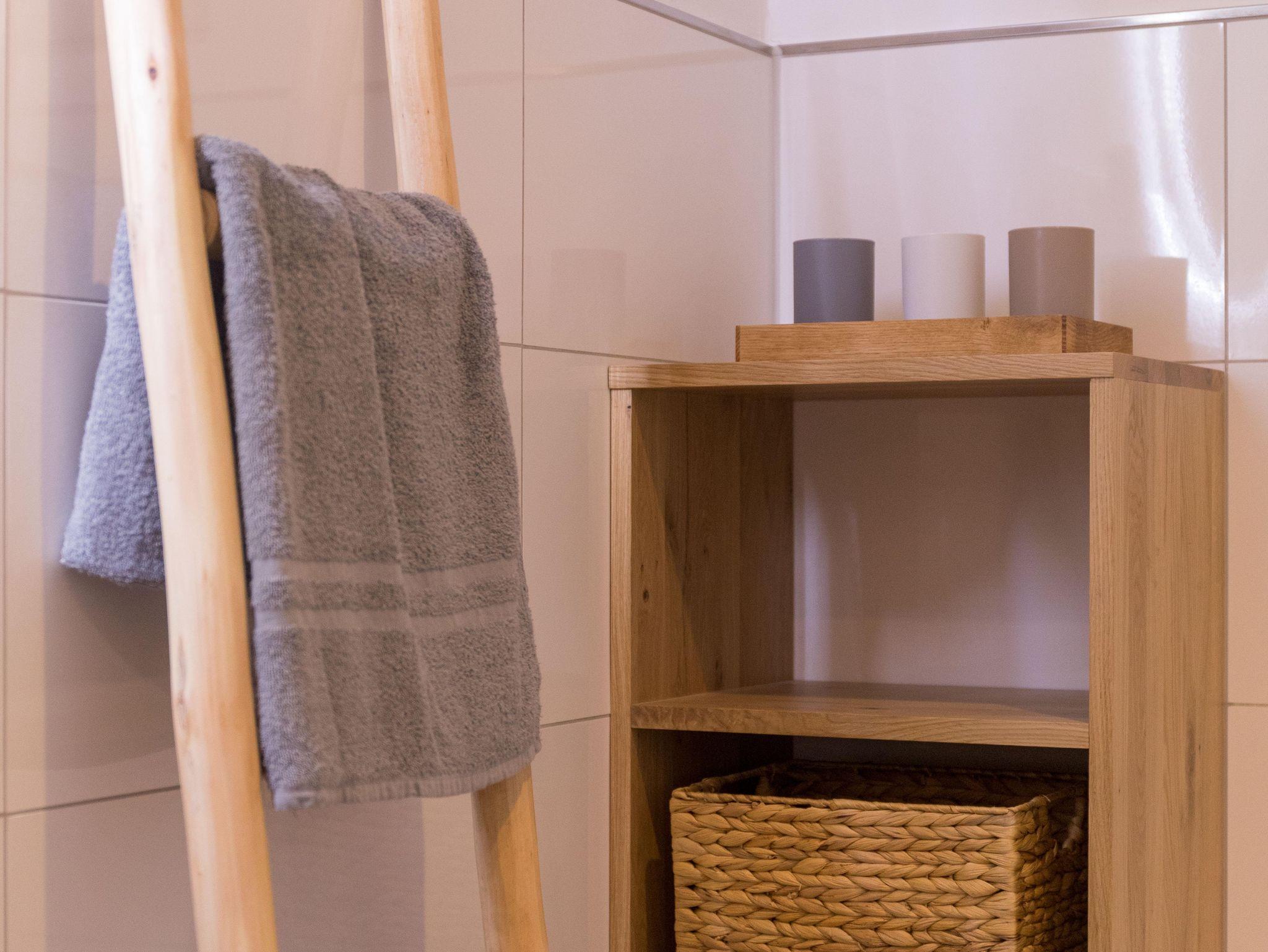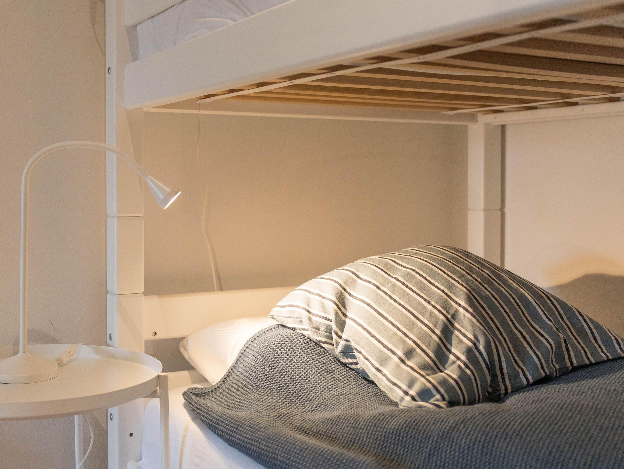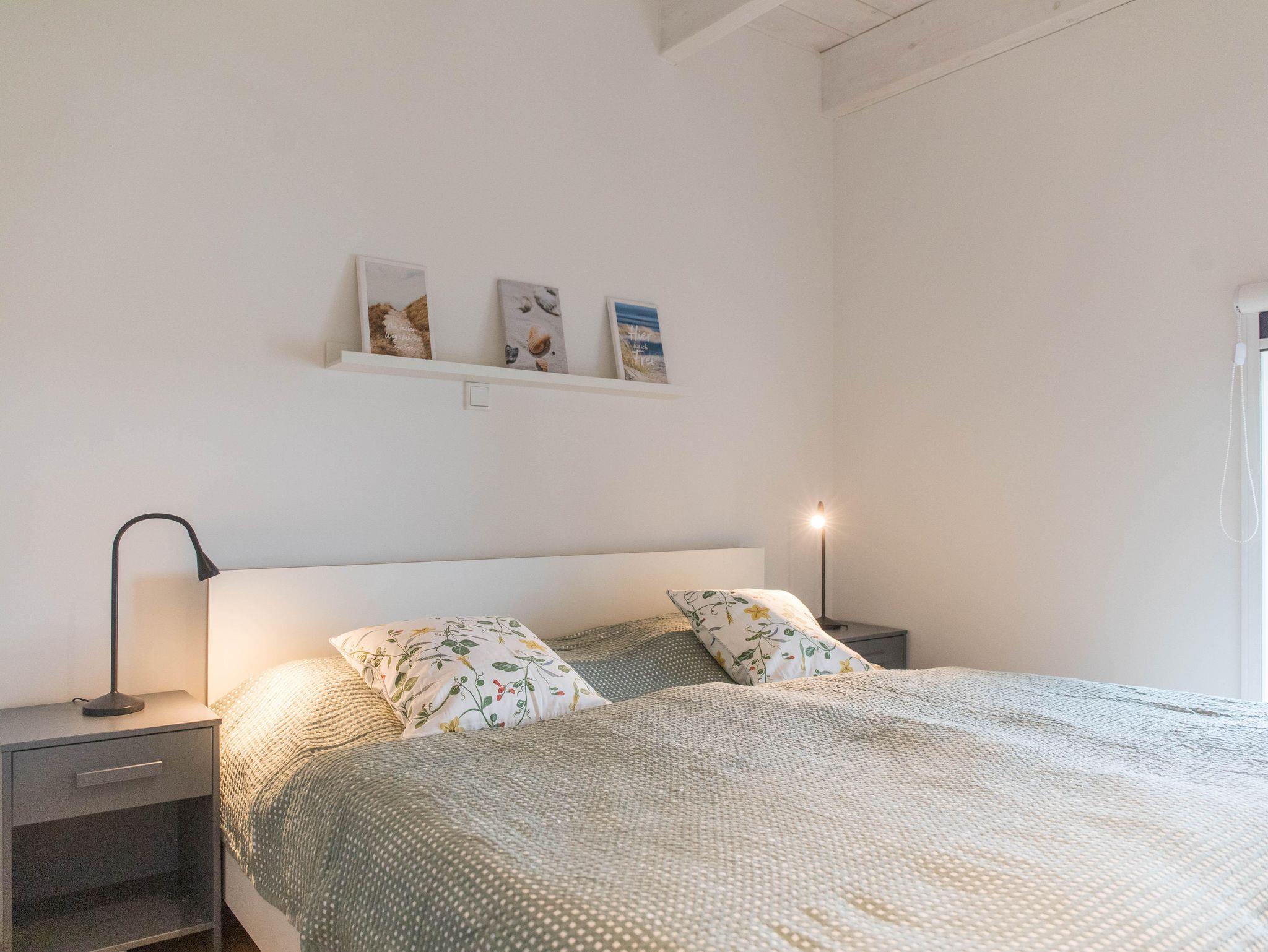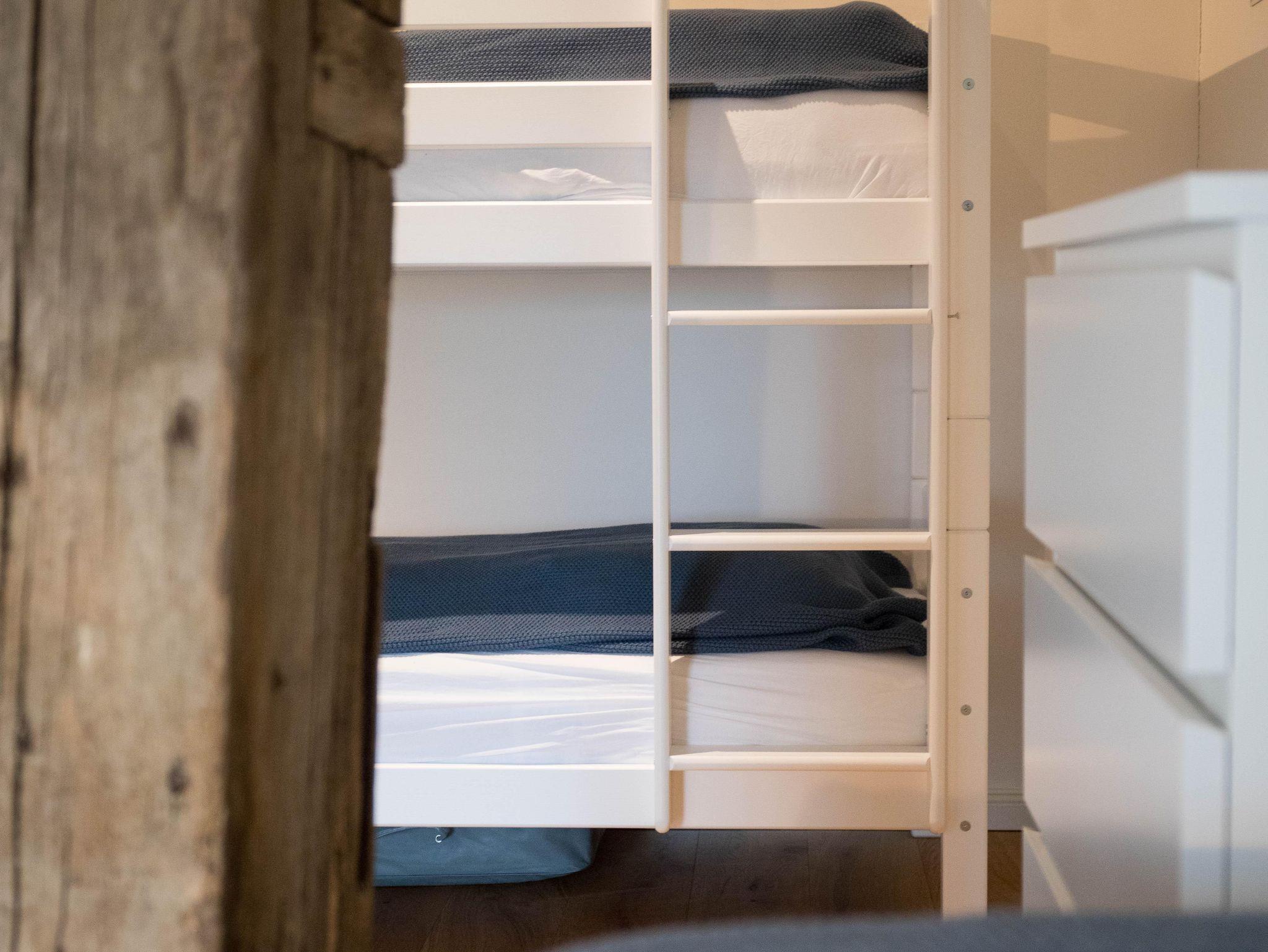 Das Obergeschoss verfügt über zwei geschmackvoll eingerichtete Schlafzimmer. Das Elternschlafzimmer verfügt über ein bequemes Doppelbett sowie einen ausreichenden Kleiderschrank. Im Kinderzimmer stehen bei Bedarf bis zu vier Schlafmöglichkeiten (inkl. zweier Stapelbetten) sowie eine Kommode zur Verfügung. Beide Schlafzimmer verfügen über Verdunklungsrollos. Das moderne Bad ist mit einer Badewanne, einer bodenebenen Dusche, WC und einer Handtuchheizung ausgestattet.