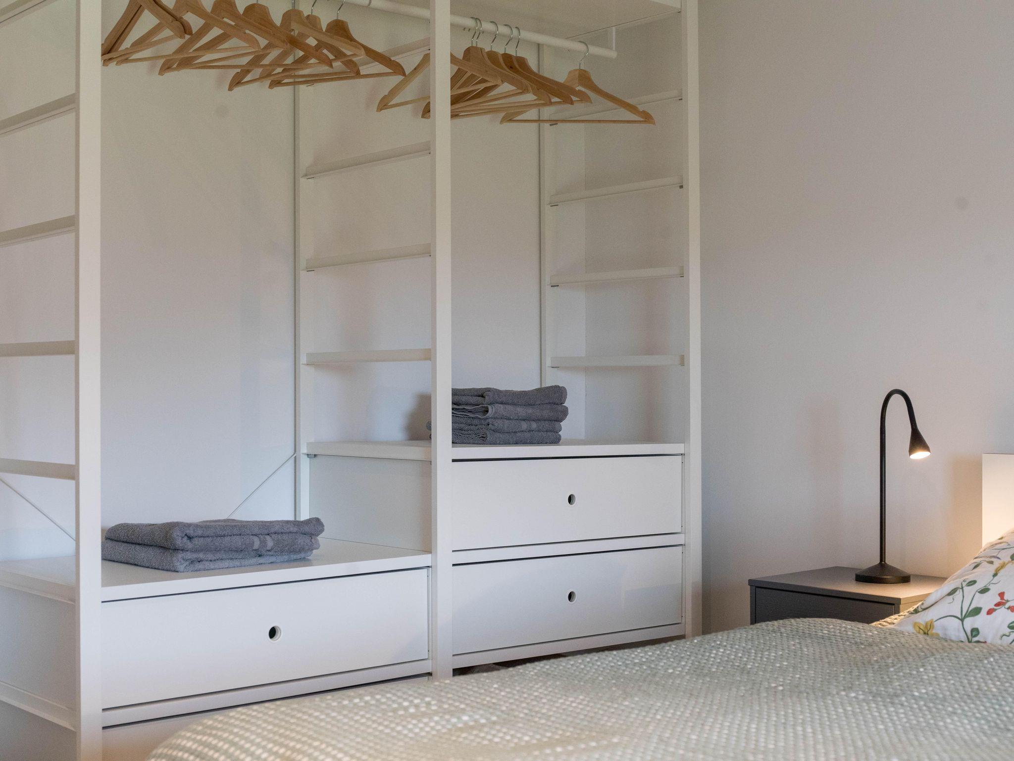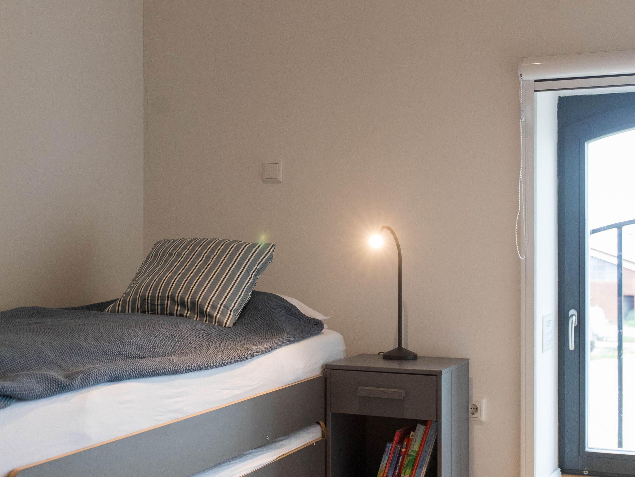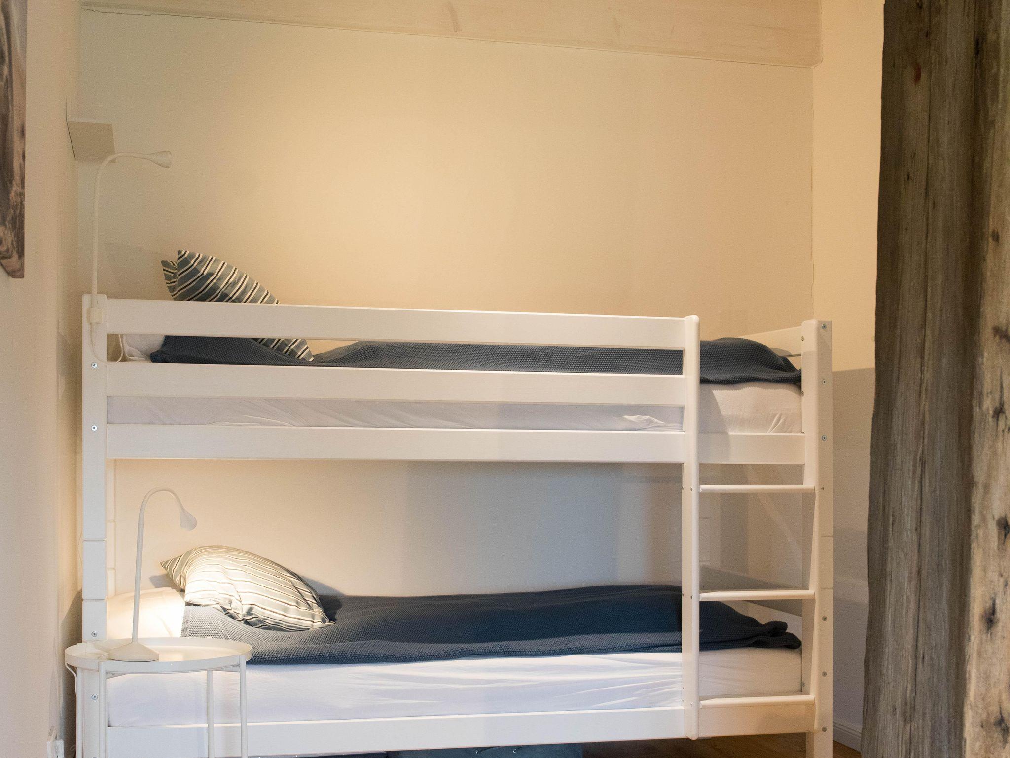 Das Obergeschoss verfügt über zwei geschmackvoll eingerichtete Schlafzimmer. Das Elternschlafzimmer verfügt über ein bequemes Doppelbett sowie einen ausreichenden Kleiderschrank. Im Kinderzimmer stehen bei Bedarf bis zu vier Schlafmöglichkeiten (inkl. zweier Stapelbetten) sowie eine Kommode zur Verfügung. Beide Schlafzimmer verfügen über Verdunklungsrollos. Das moderne Bad ist mit einer Badewanne, einer bodenebenen Dusche, WC und einer Handtuchheizung ausgestattet.