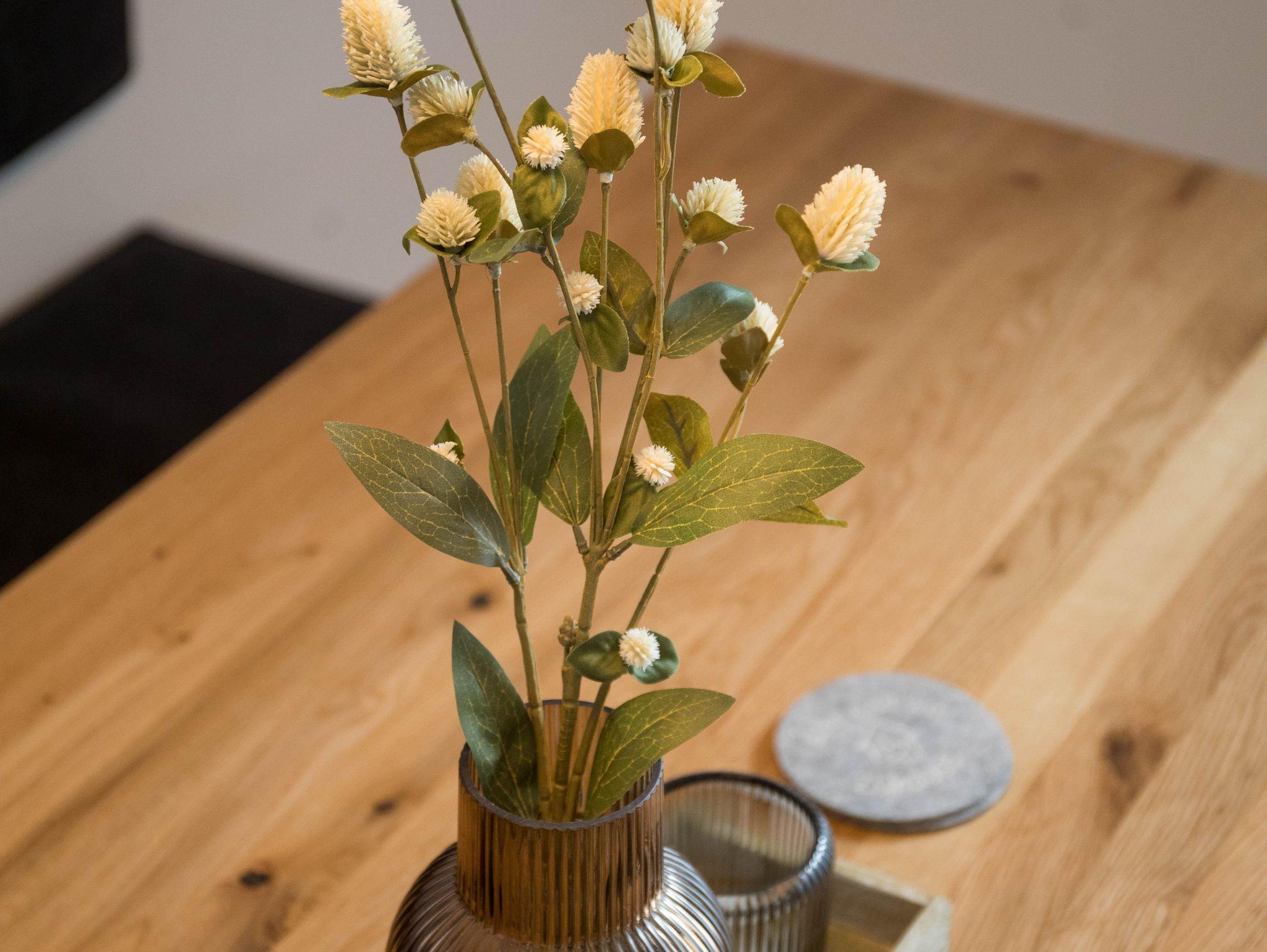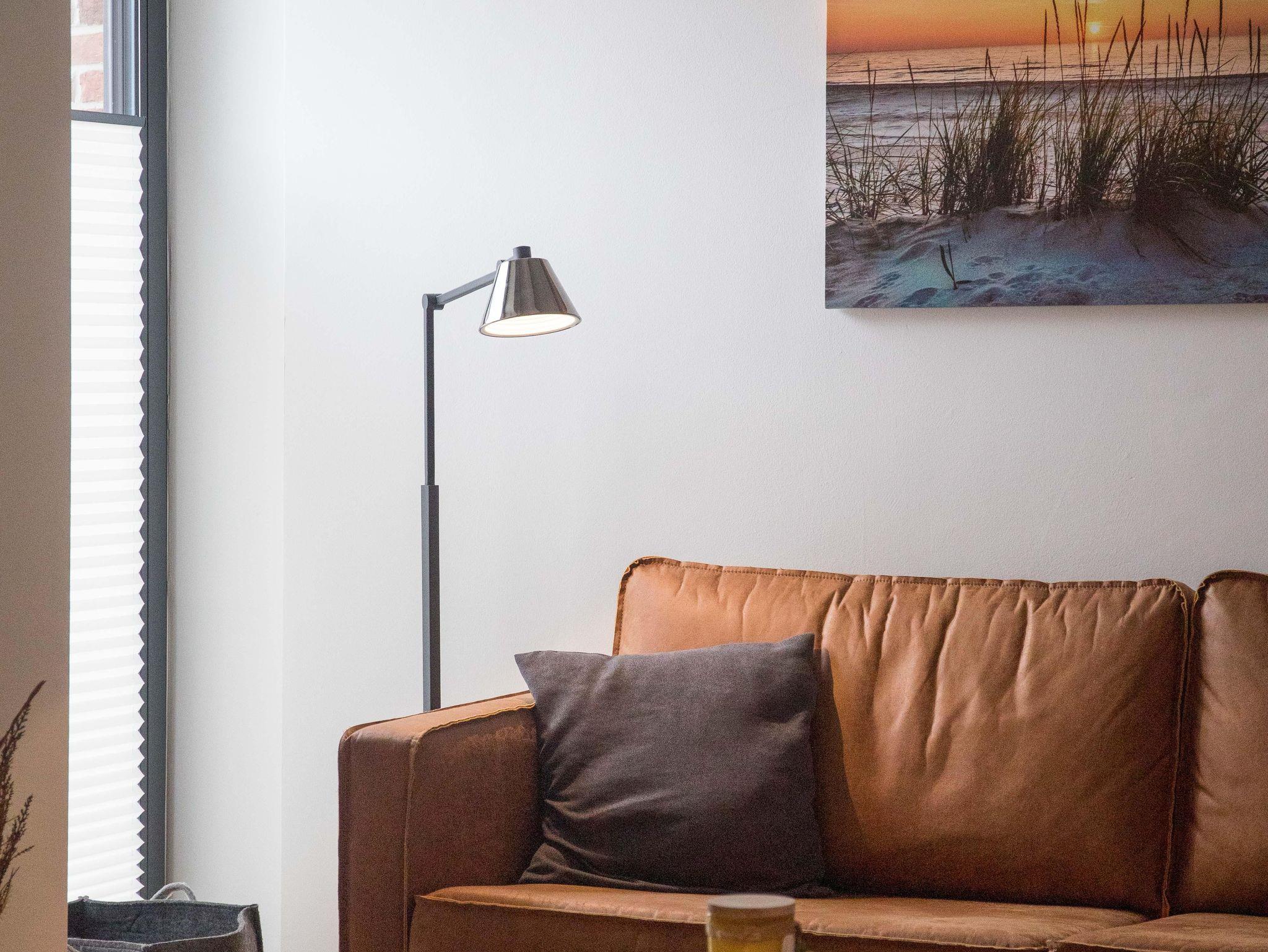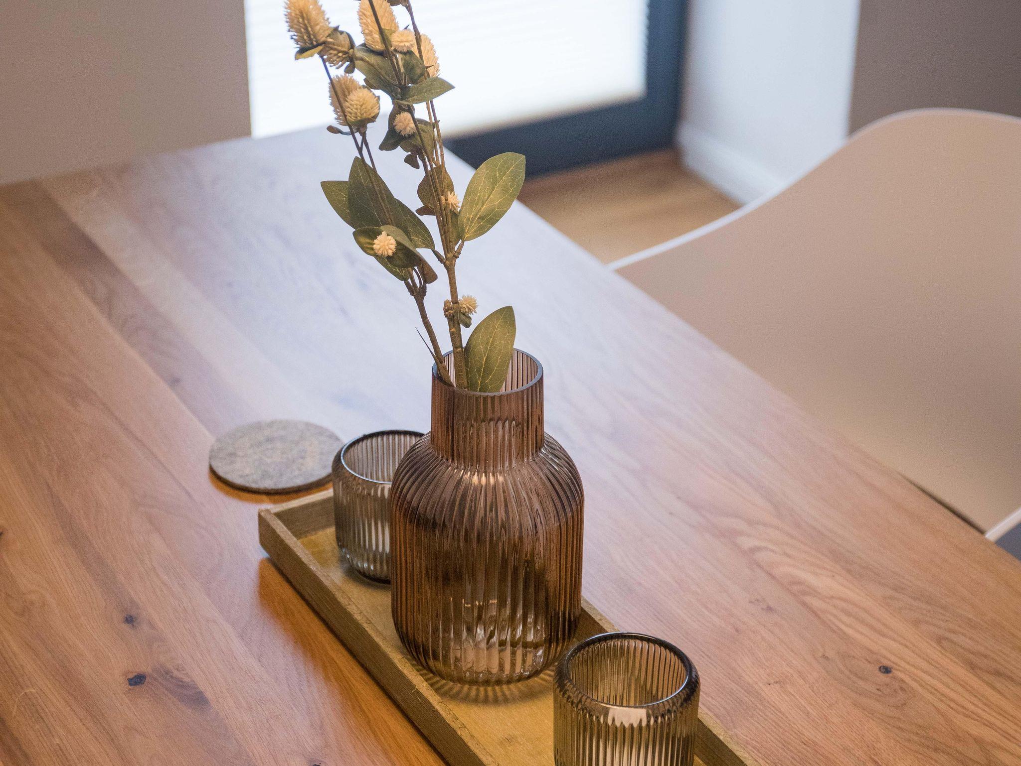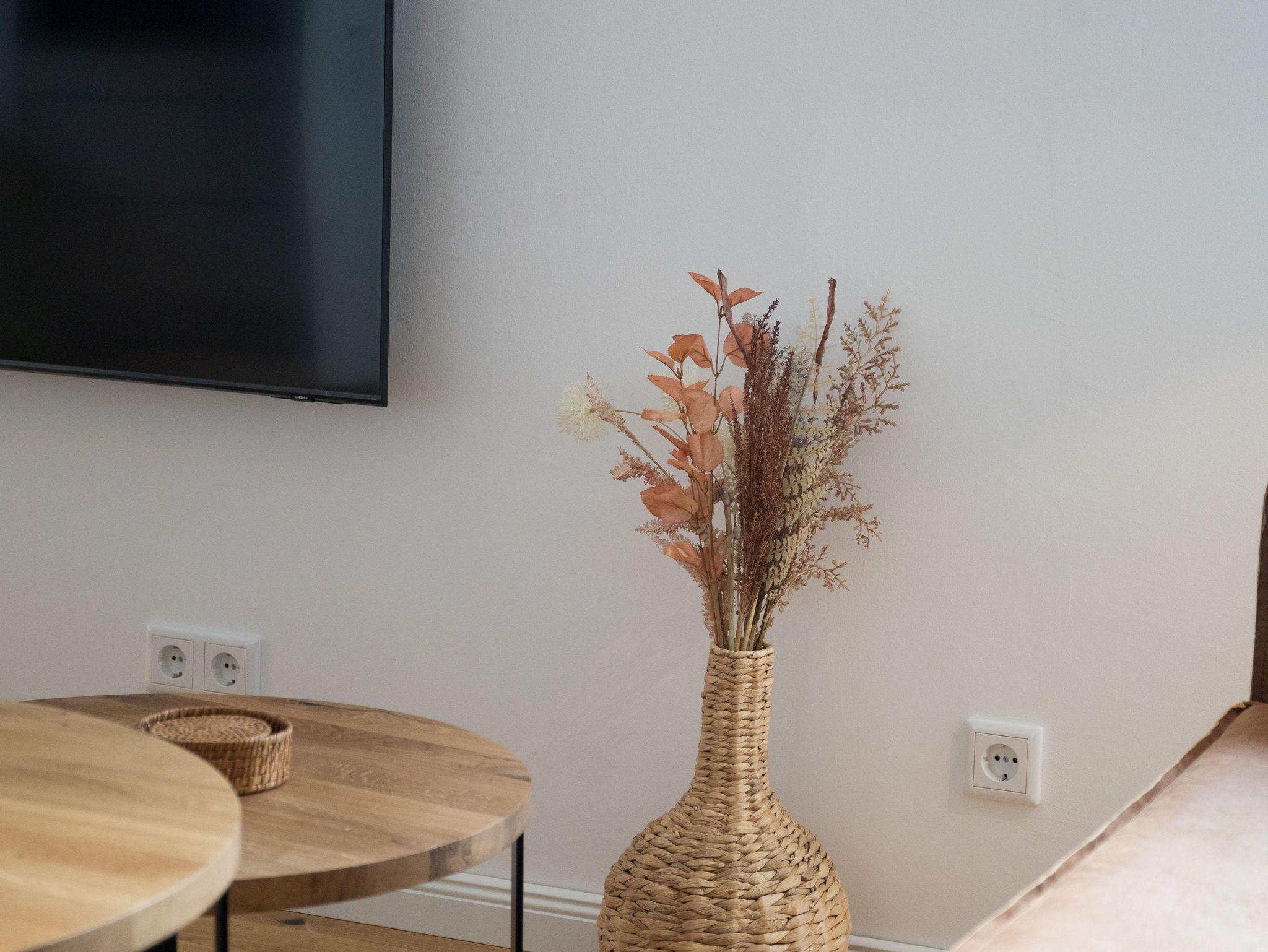 Von der Küche gelangt man in das großzügige Wohn- und Esszimmer. Genießen Sie gemeinsame Mahlzeiten im Essbereich oder entspannen Sie einfach auf dem bequemen Sofa im Wohnzimmer, während Sie den 50 Zoll großen QLED-Fernseher nutzen. Für die kleinen Gäste steht ein Kinderhochstuhl zur Verfügung. Für zusätzlichen Komfort sorgt die Fußbodenheizung, die für eine wohlige Atmosphäre selbst an kühlen Tagen sorgt. Zudem sind im Erdgeschoss ein Gäste-WC und ein Abstellraum vorhanden.