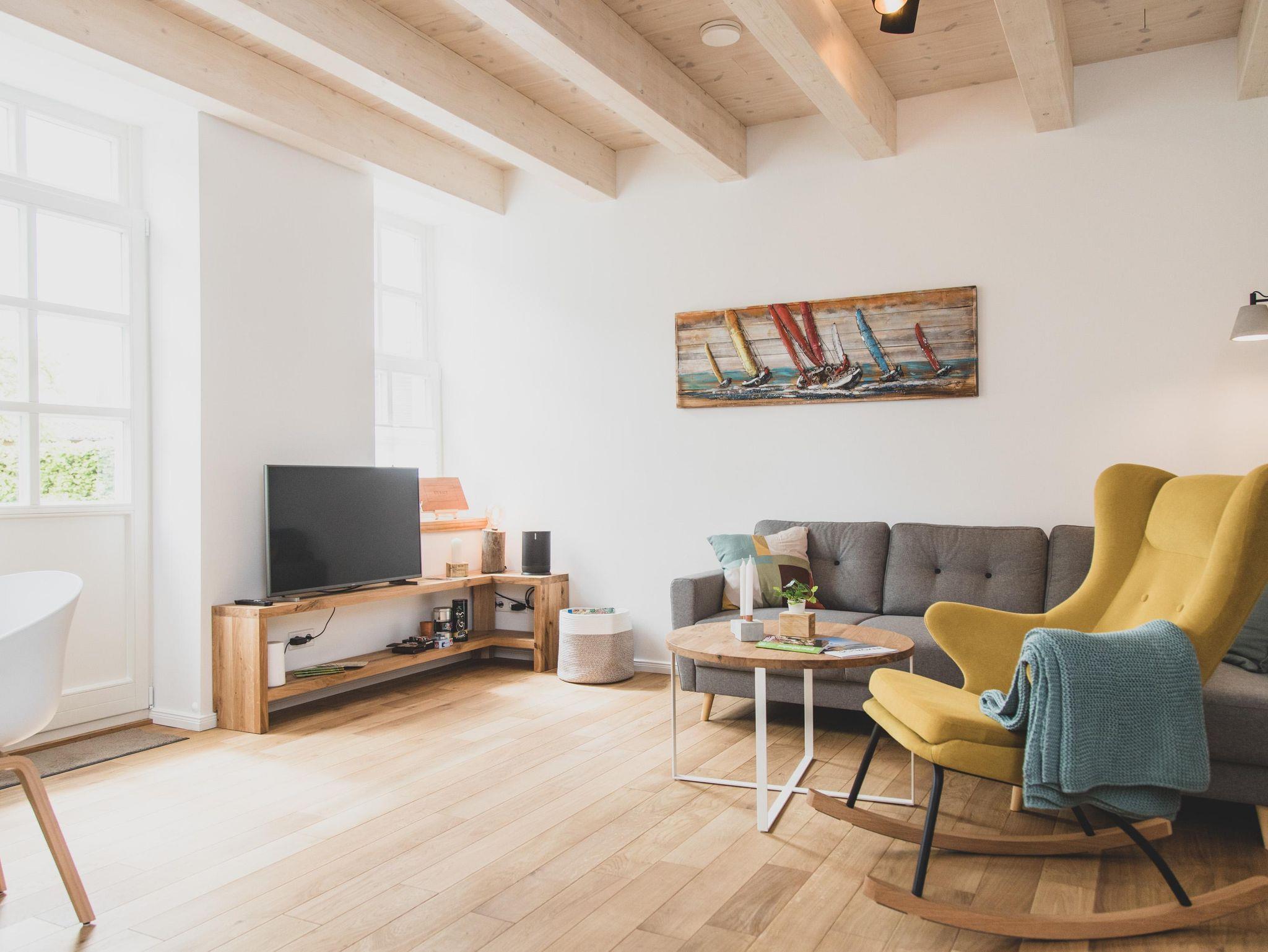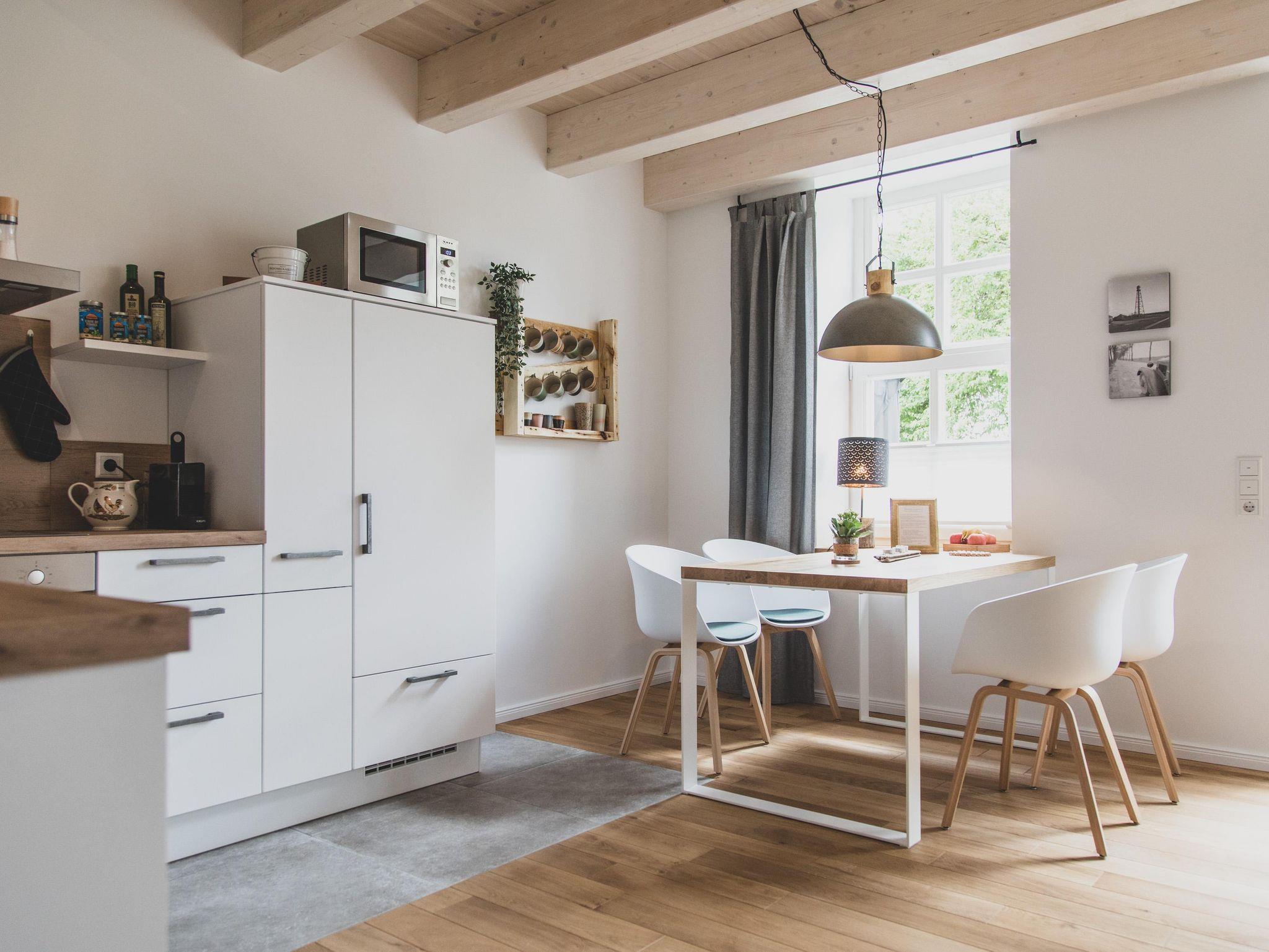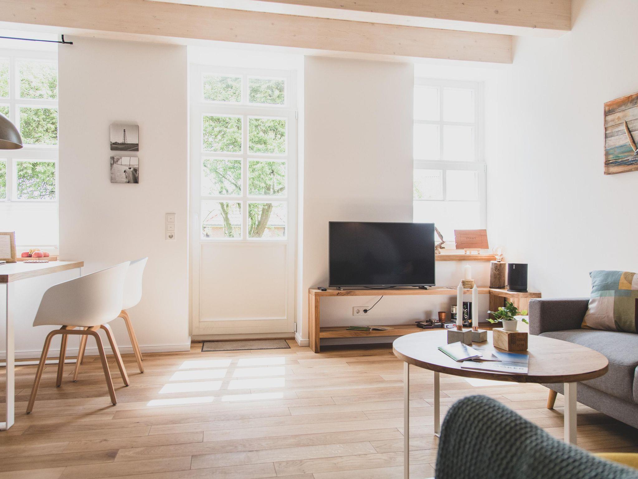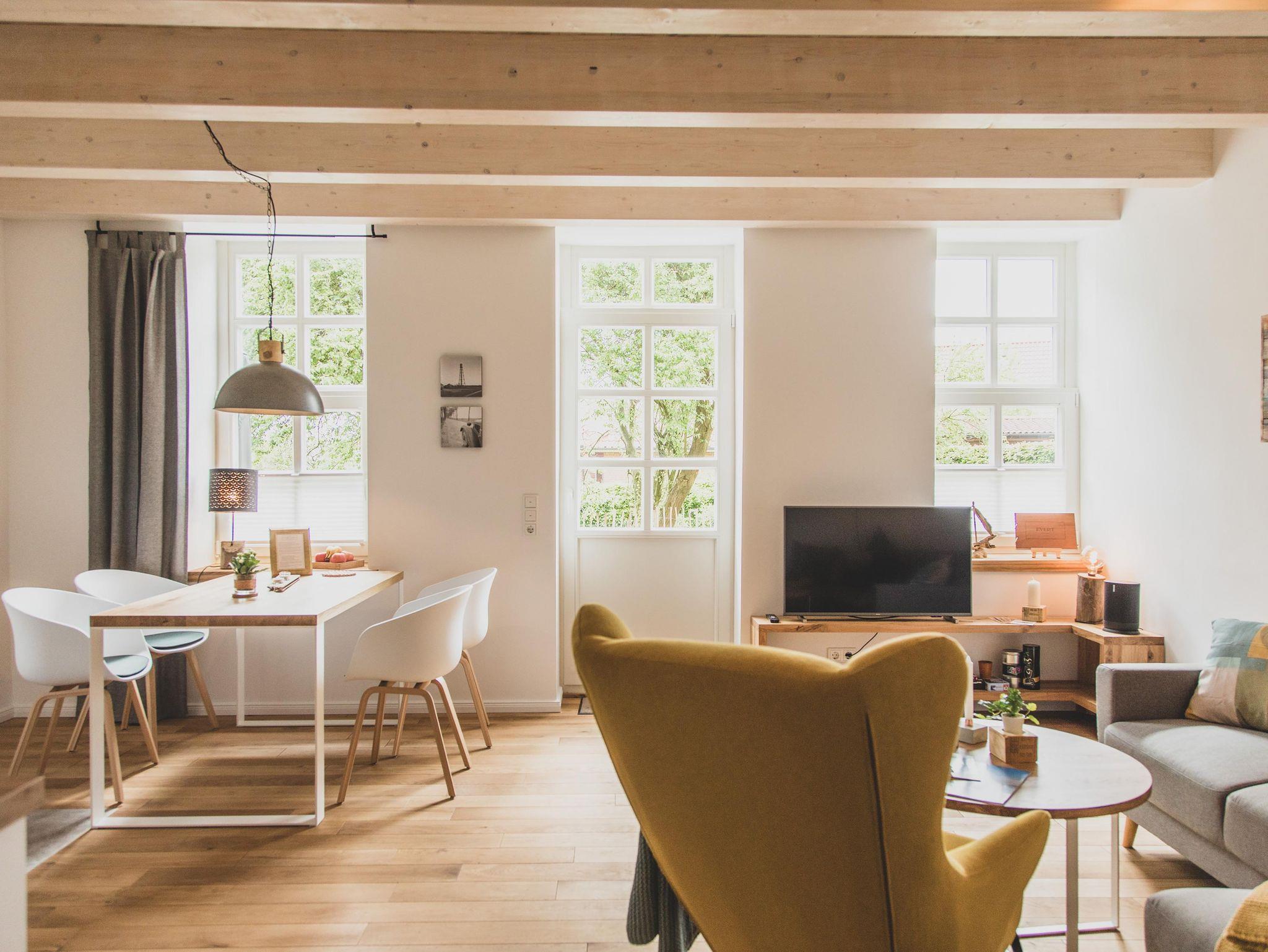 Die großen Blockrahmenfenster, die Balkendecken und das Echtholzparkett prägen das Erscheinungsbild der hellen Ferienwohnung. Sie wurde mit viel Liebe zum Detail eingerichtet und Materialien vom Strand, aus der Bauphase und alte Teile des historischen Ständerwerks runden den Charme der Wohnung ab.