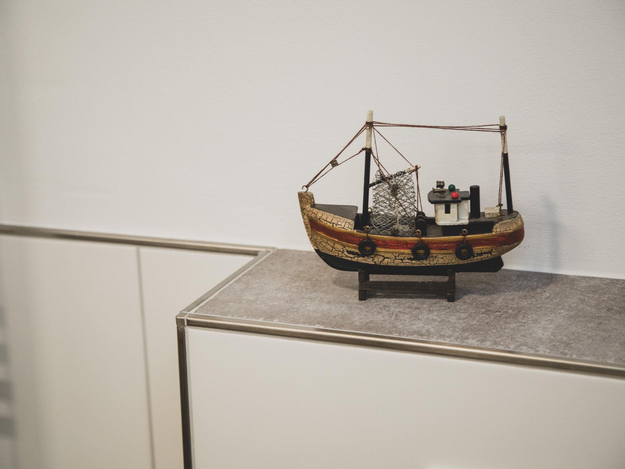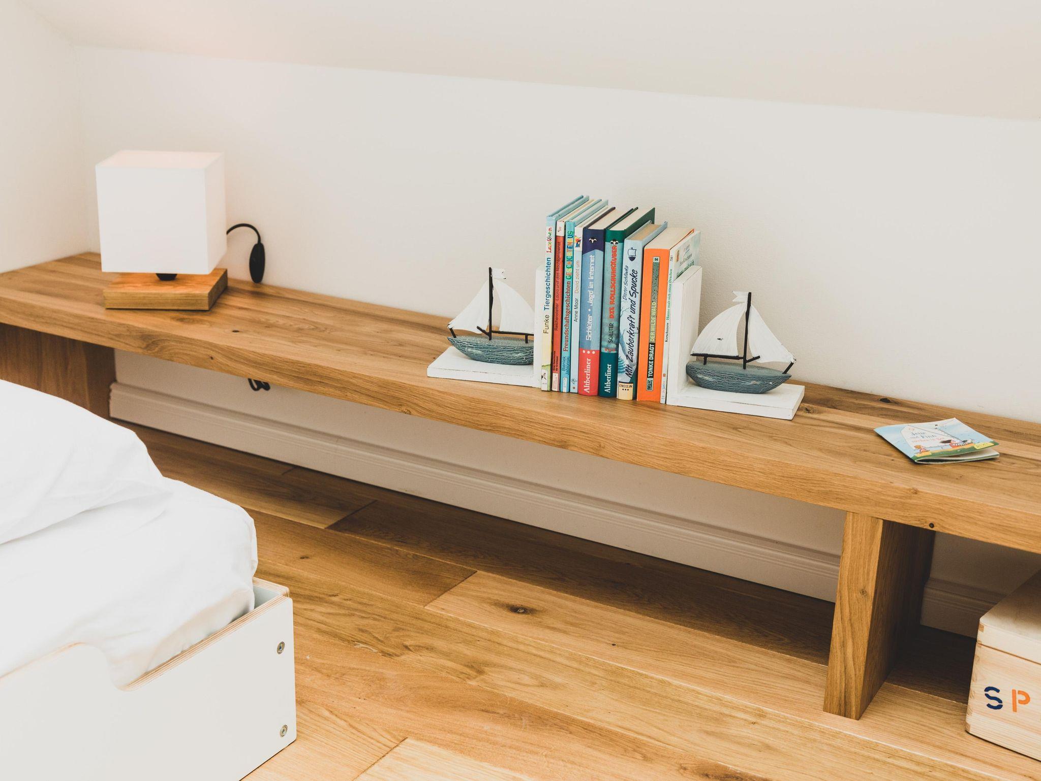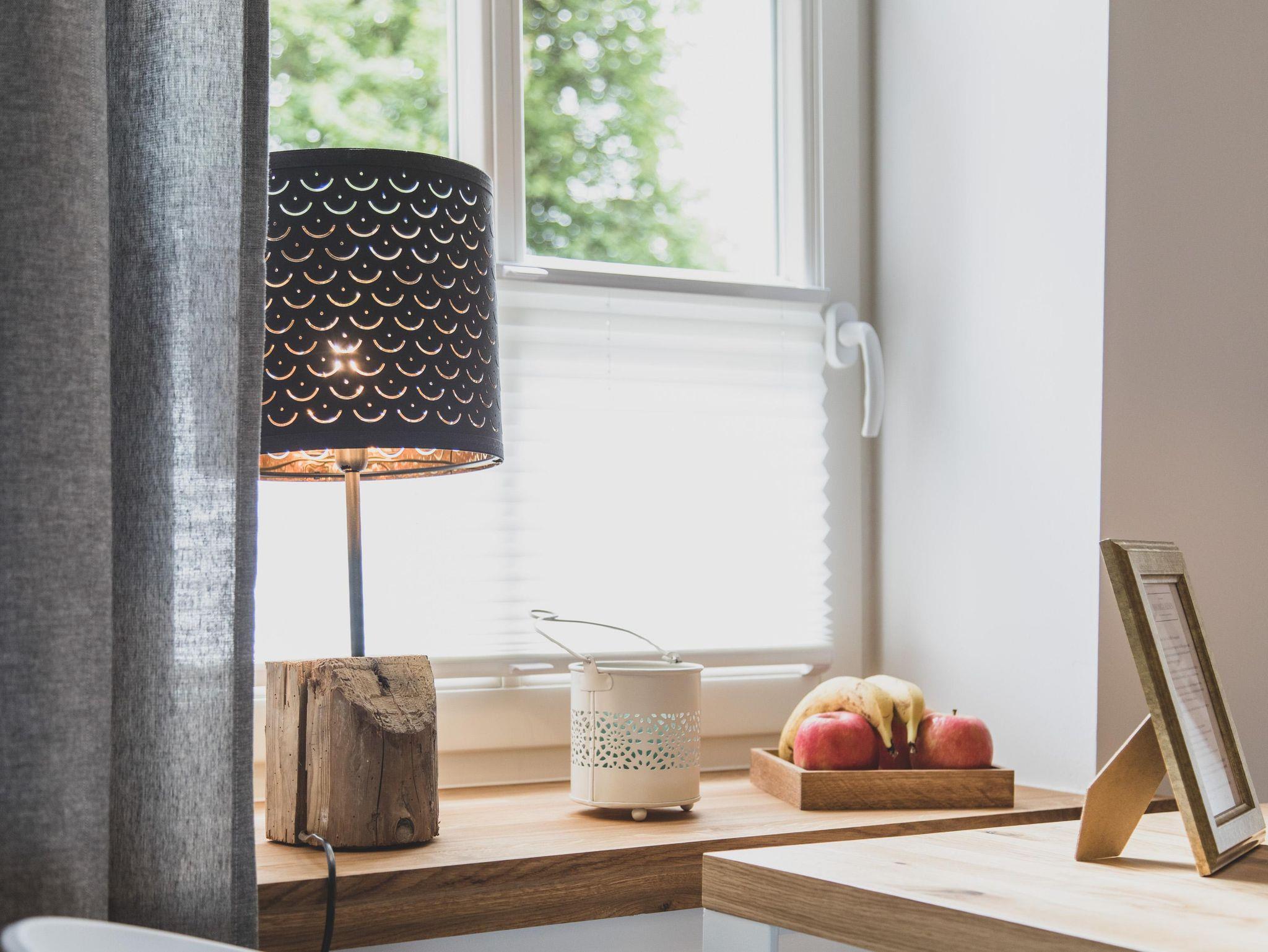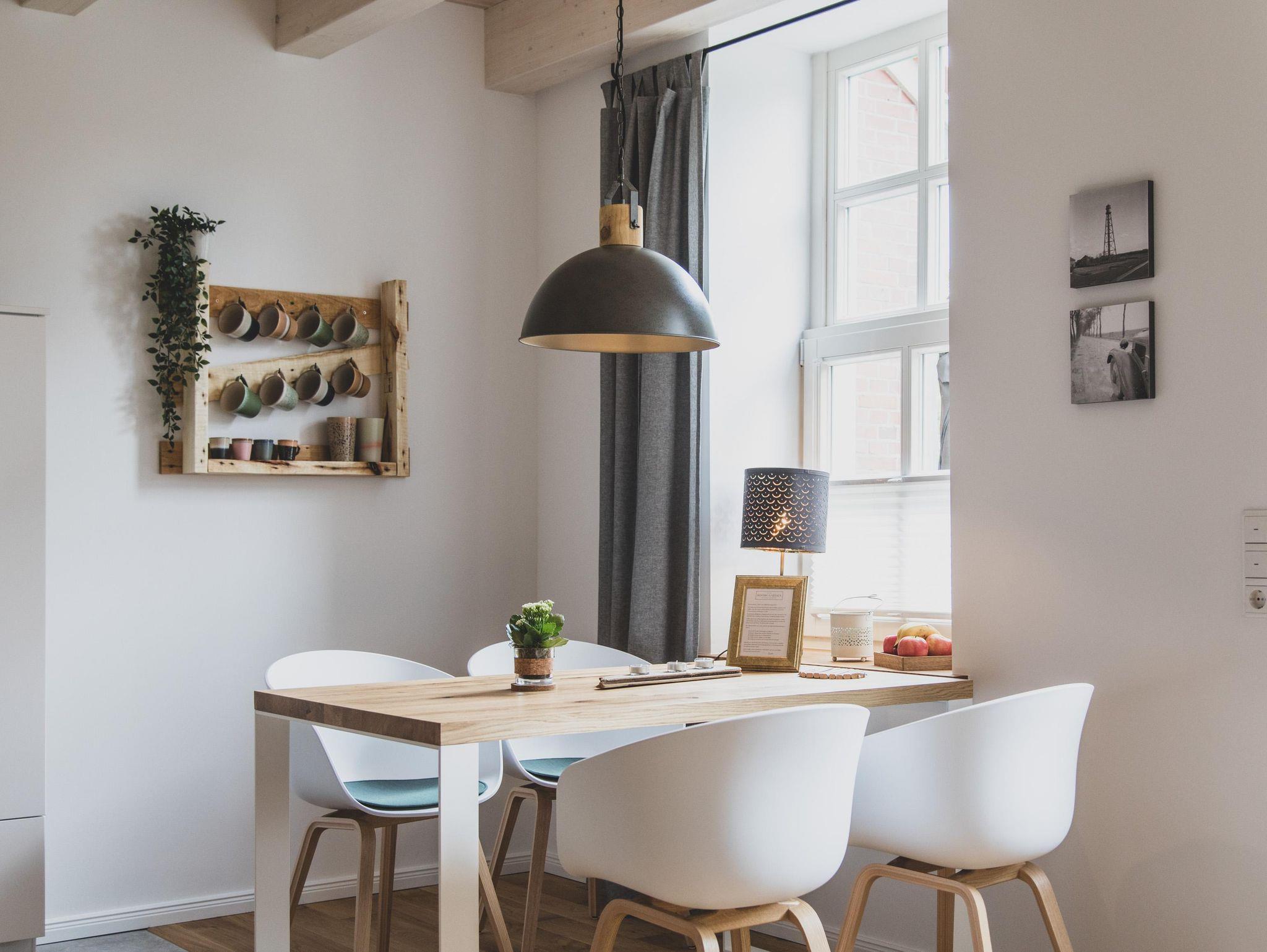 Die großen Blockrahmenfenster, die Balkendecken und das Echtholzparkett prägen das Erscheinungsbild der hellen Ferienwohnung. Sie wurde mit viel Liebe zum Detail eingerichtet und Materialien vom Strand, aus der Bauphase und alte Teile des historischen Ständerwerks runden den Charme der Wohnung ab.