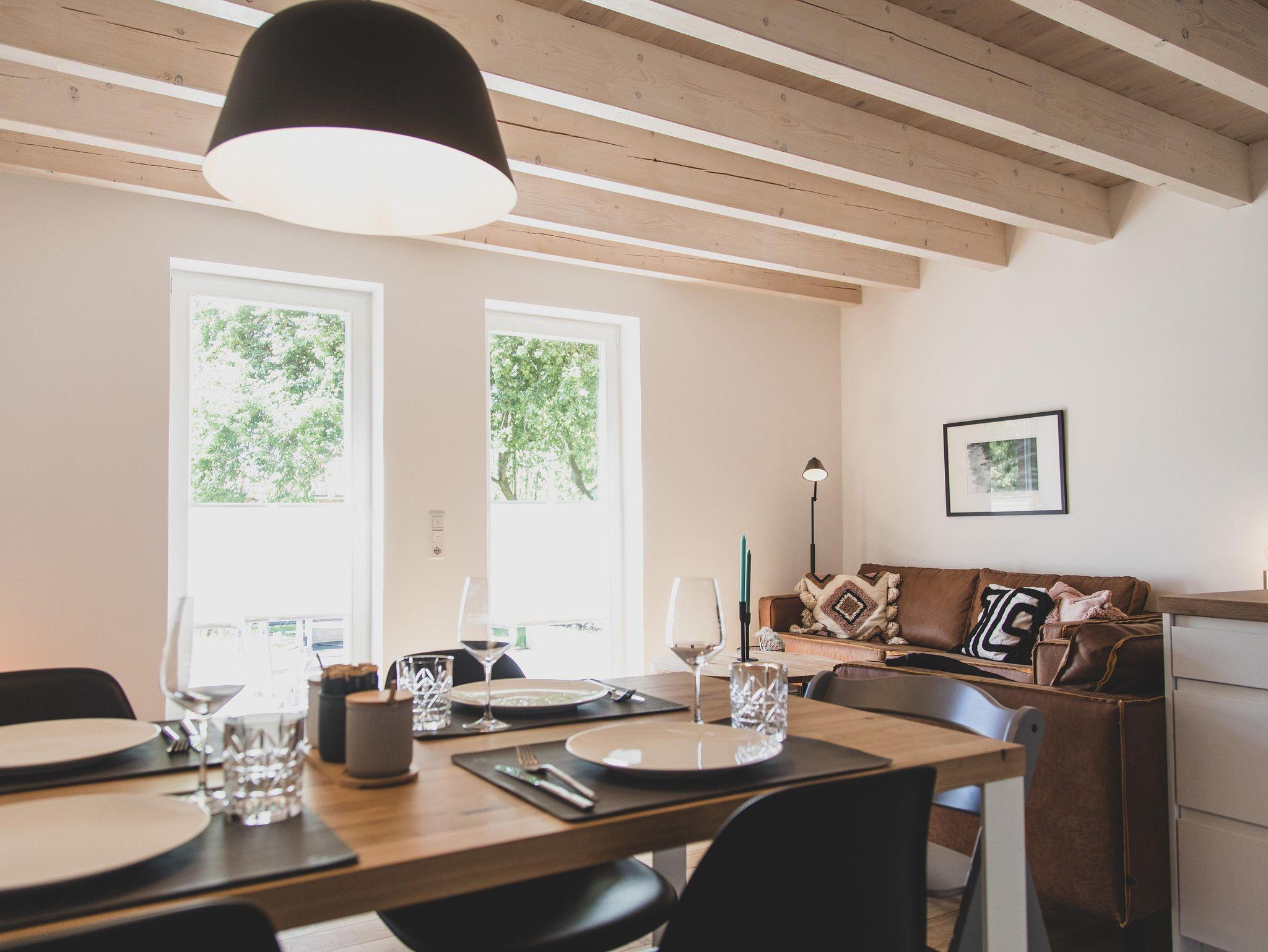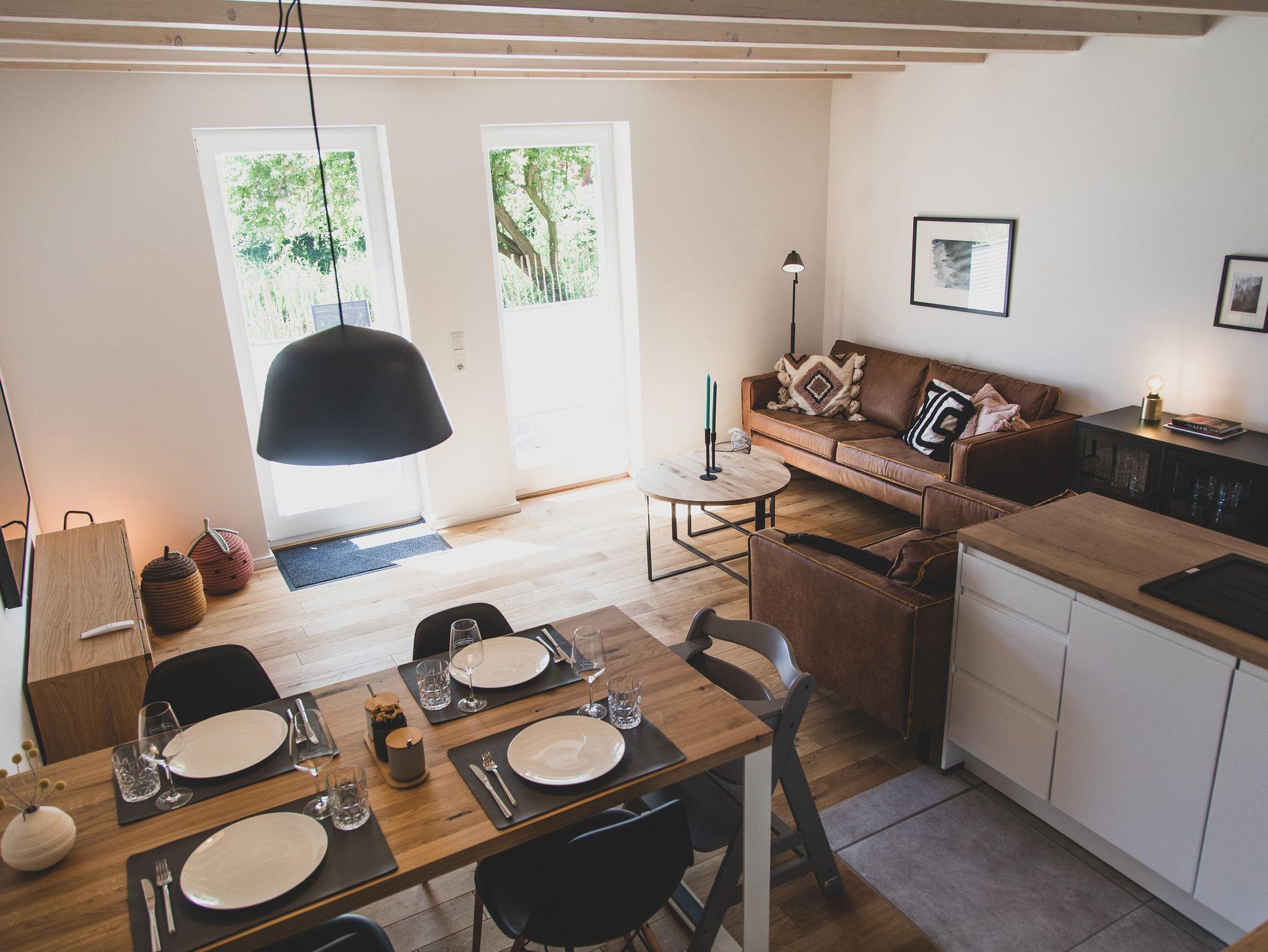 Hohe Decken, dicke Balken und große Fenster prägen das Erscheinungsbild der hellen Wohnung. Holzdielen, moderne Einrichtung, ausgesuchte Details und Bilder runden den Charme der Wohnung ab. Gartenmöbel, Sonnenschirm und Grill stehen zur Benutzung bereit. Schlafzimmer 1 bietet ein Doppelbett und den unverbauten Blick in den Garten und die Natur. Im zweiten Schlafzimmer finden Sie 2 Einzelbetten. Ein großzügiges Bad mit Dusche lädt zur Entspannung ein.