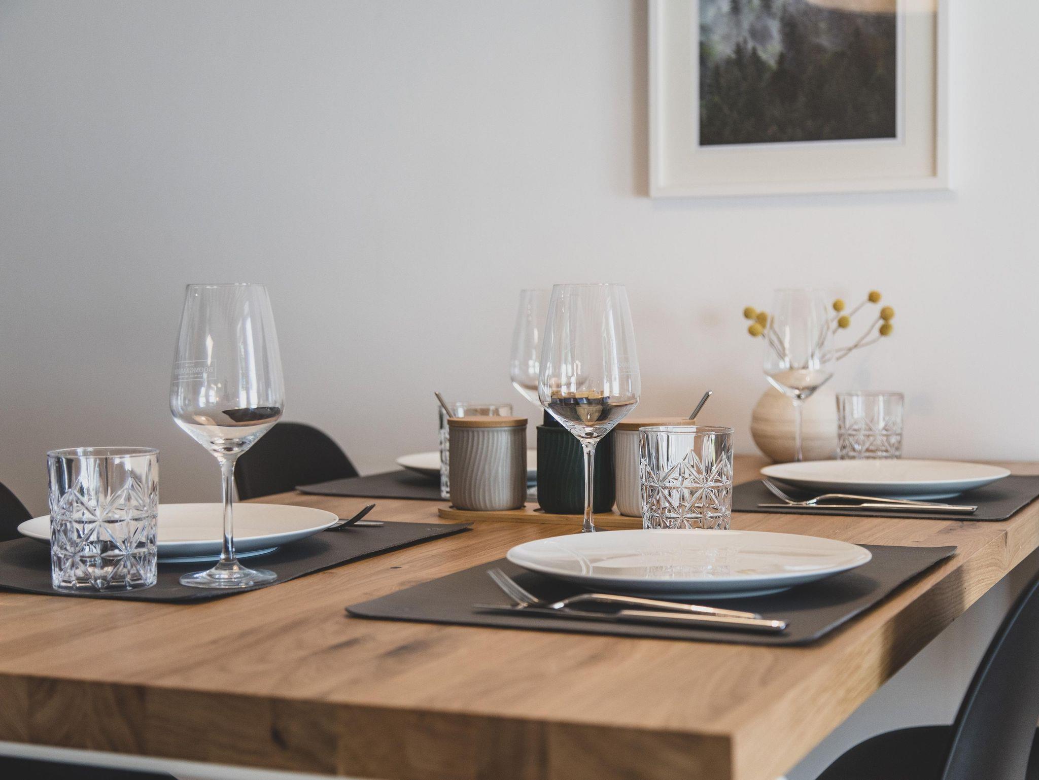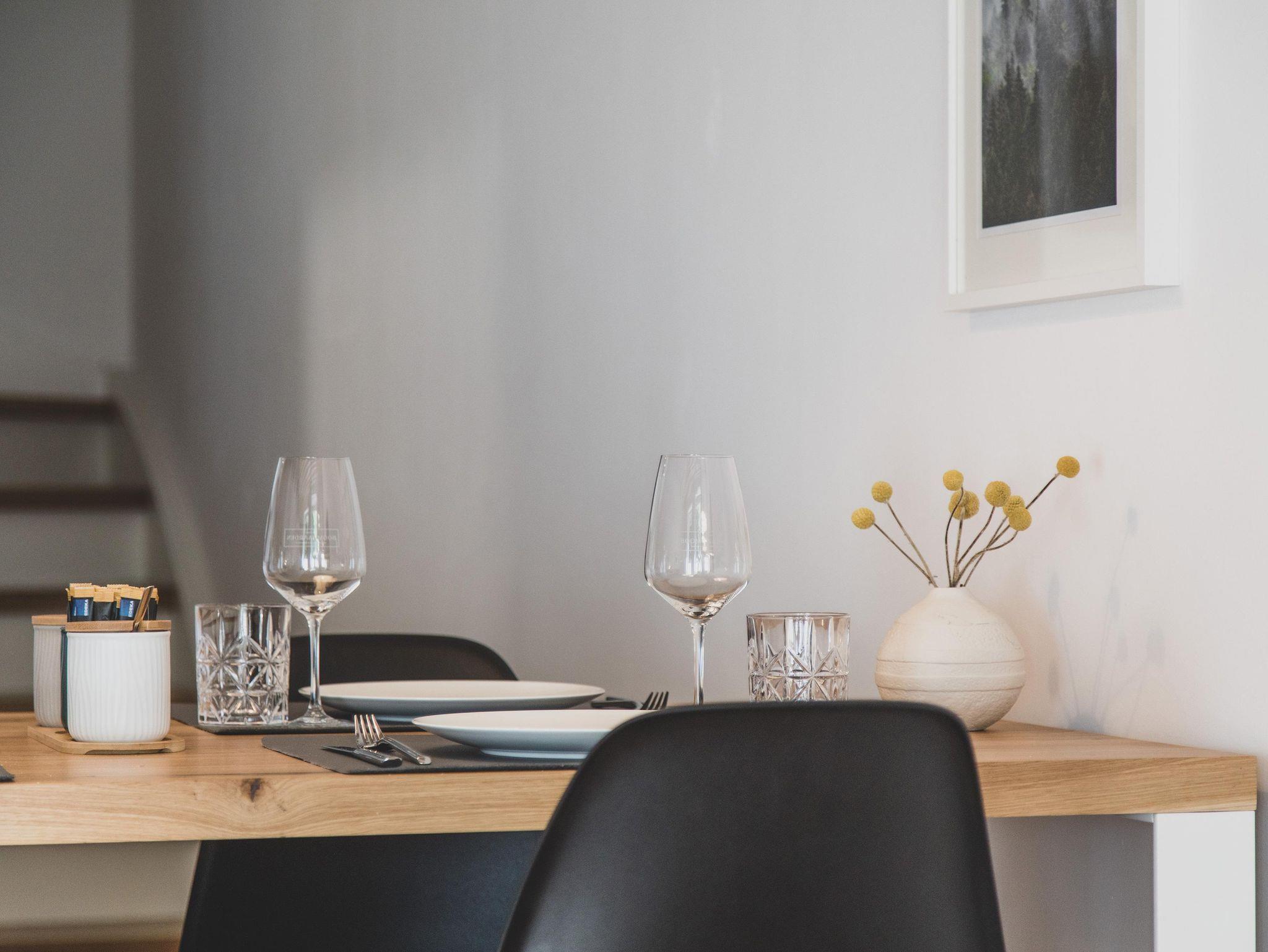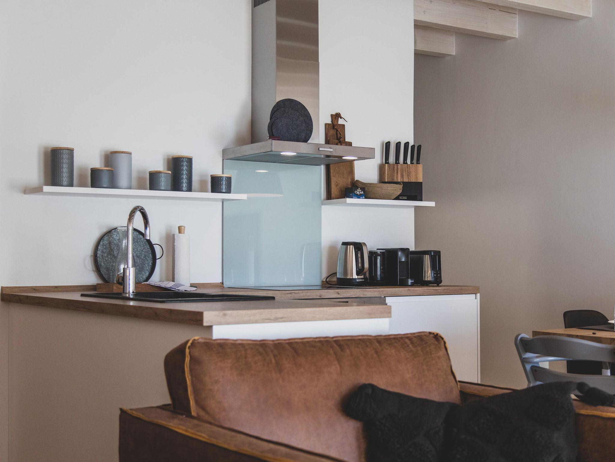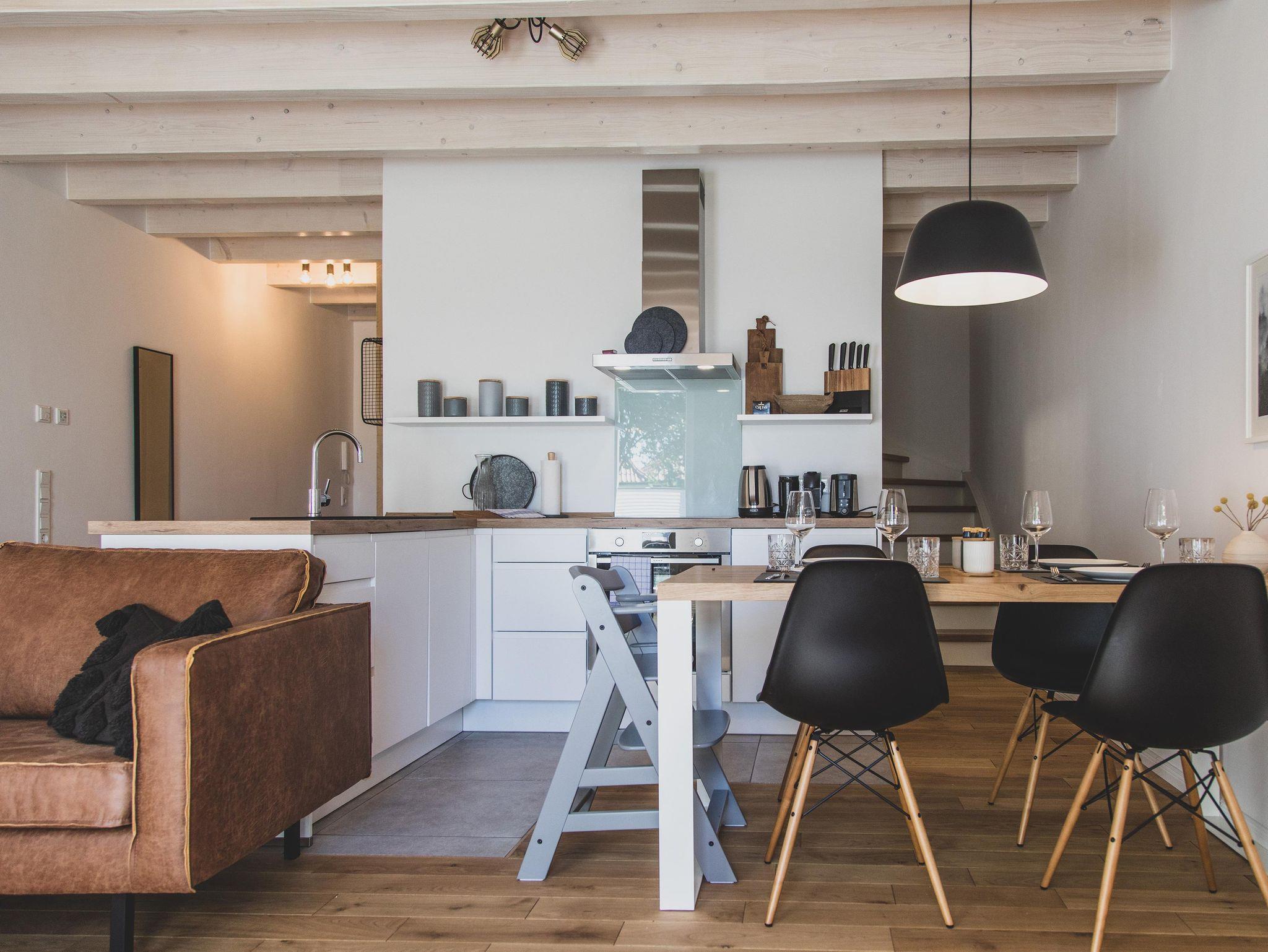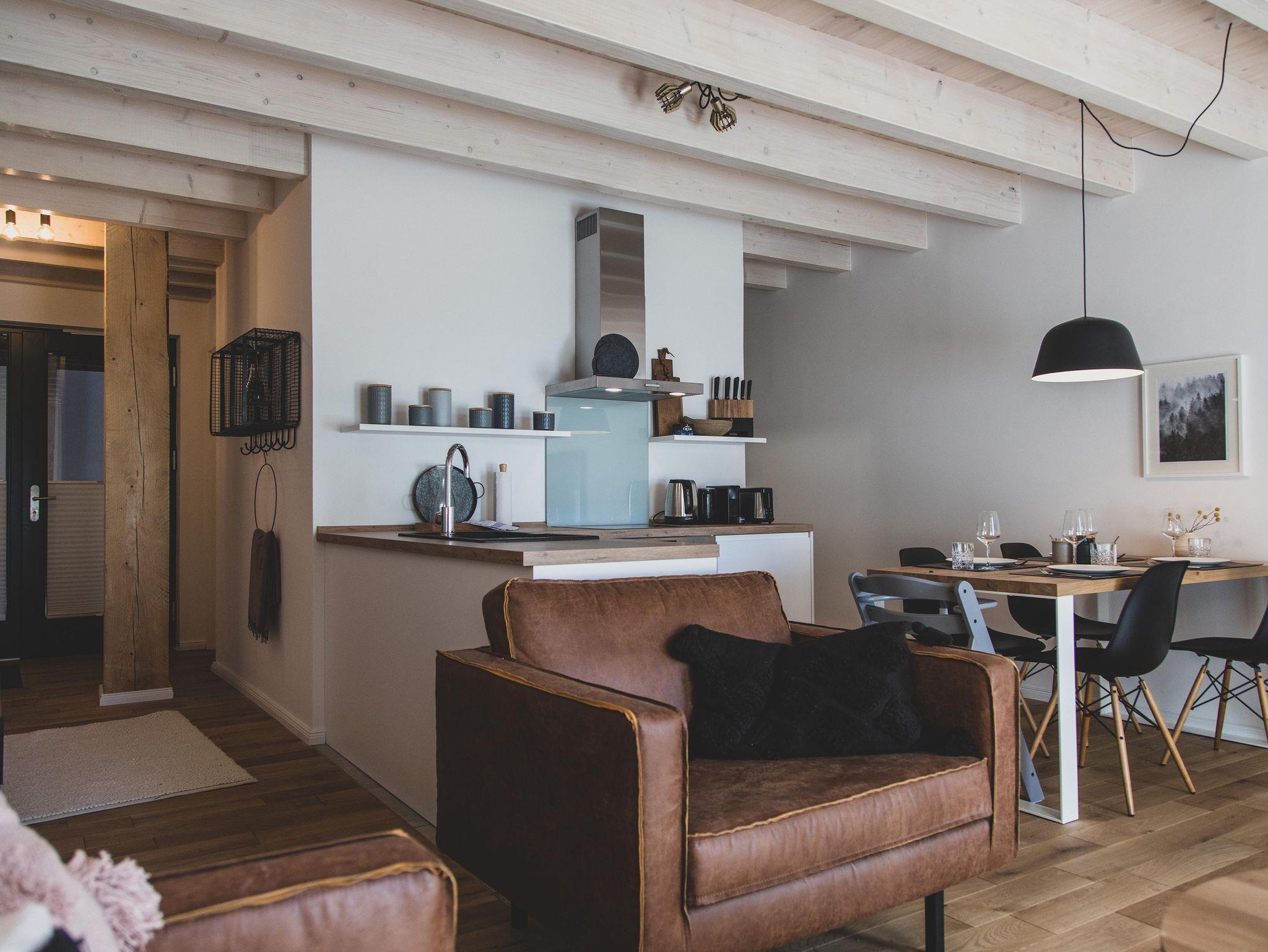 Unsere Wohnungen im Vorderhaus des Ferienhofs verfügen über hohe Decken mit durchgehend erhaltenen alten Deckenbalken. Die historischen Blockrahmenfenster und Fensterläden wurden in Handarbeit neu erstellt und runden den Anblick des denkmalgeschützten Gulfhofs ab. Im ehemaligen Scheunentrakt befinden sich durch bodentiefe Fenster helle und großzügig geschnittene Wohnungen. Alle Ferienwohnungen sind individuell, modern und mit viel Liebe zum Detail eingerichtet und bieten von der Terrasse einen erholsamen Blick auf die Grünflächen mit altem Baumbestand.
