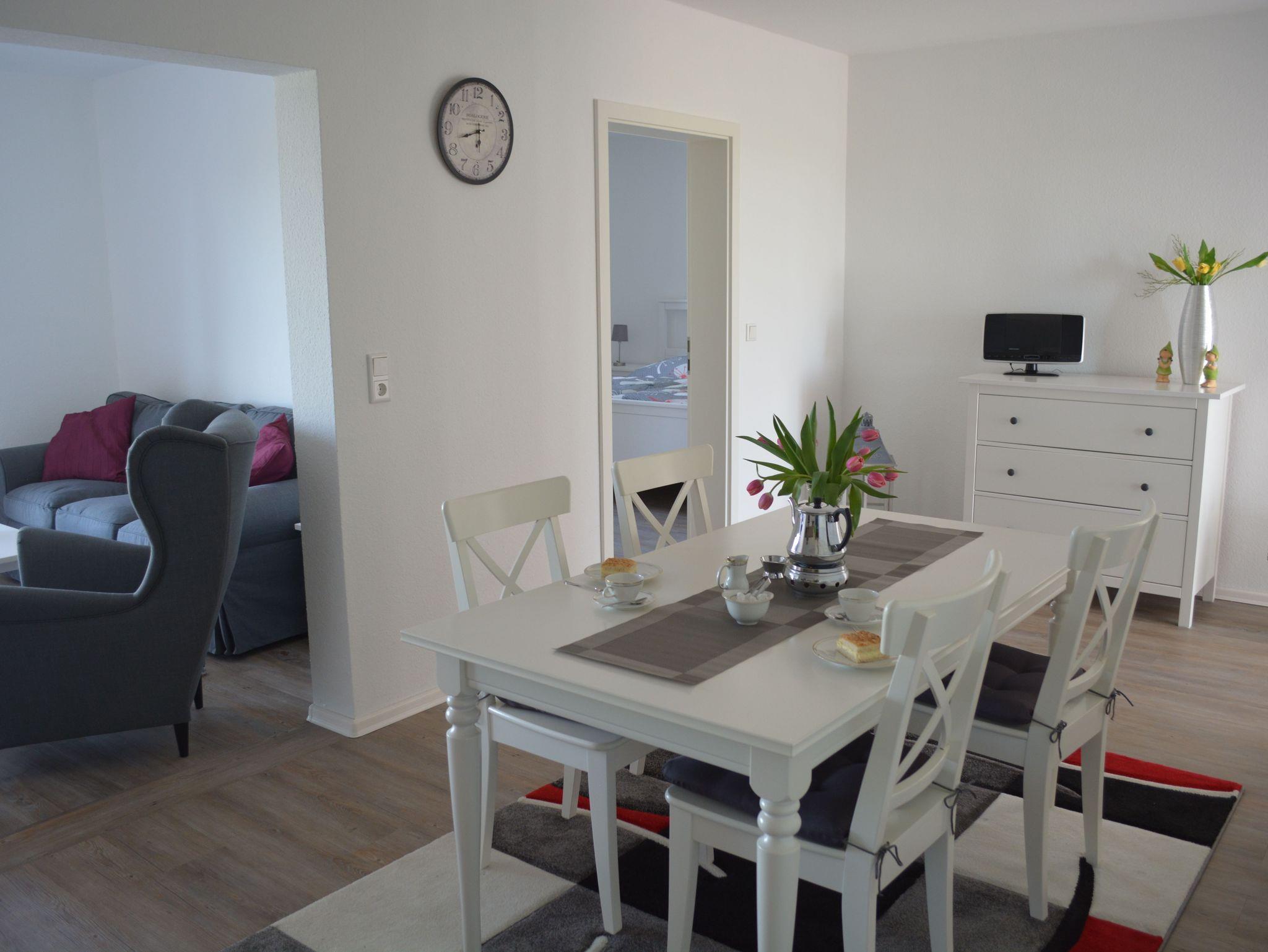 Die ebenerdige sowie modern und hell eingerichtete Ferienwohnung (ca. 68 qm) bietet Platz für bis zu 4 Personen. Sie verfügt über zwei separate Schlafzimmer (ein Schlafzimmer mit Doppelbett 1,80 m x 2,00 m und einem Schlafzimmer mit zwei Einzelbetten jeweils 0,90, x 2,00 m). Dem großzügigen Wohn- und Essbereich ist eine Küche mit E- Herd, Backofen, Geschirrspüler, Kühlschrank mit Gefrierfach, Toaster, Wasserkocher und Kaffeemaschine angegliedert. Das Bad mit ebenerdiger Dusche und WC verfügt zudem über eine Fußbodenerwärmung. SAT-TV, Stereoanlage und WLAN sind vorhanden. Kinderreisebett sowie ein Hochstuhl können zur Verfügung gestellt werden. Mit zur Ferienwohnung gehört eine separate Terrasse, welche mit Gartenmöbeln und Sonnenschirm ausgestattet ist. Der Internetzugang ist für unsere Gäste selbstverständlich kostenfrei. Wachmaschine und Wäschetrockner befinden sich ebenfalls in der Anlage und können gegen Gebühr genutzt werden. Handtücher und Bettwäsche werden einmalig gestellt (weitere Wechsel sind selbstverständlich gegen Gebühr möglich). Wir bitten im Interesse unserer allergischen Gäste um Verständnis, dass das Mitbringen von Haustieren nicht gestattet ist. Das Rauchen ist im Außenbereich möglich. Vermietung ausschließlich an Feriengäste, nicht an Firmen.