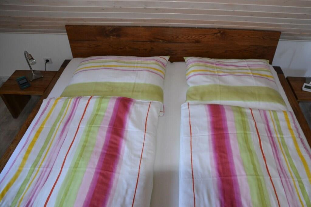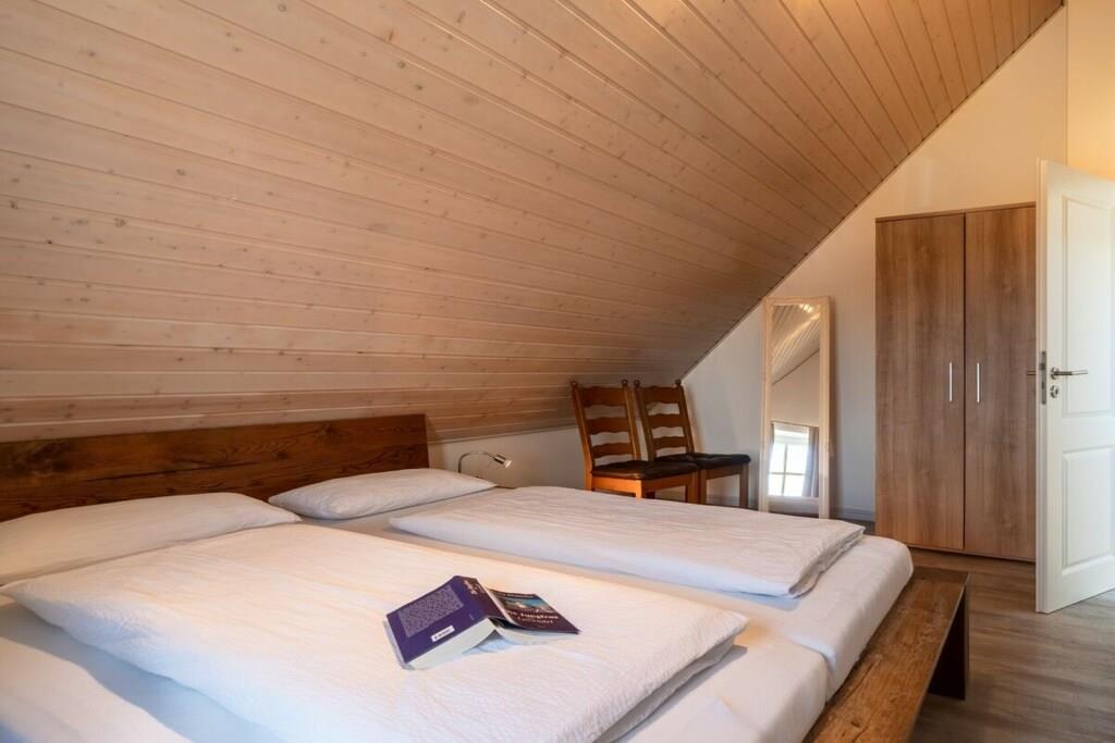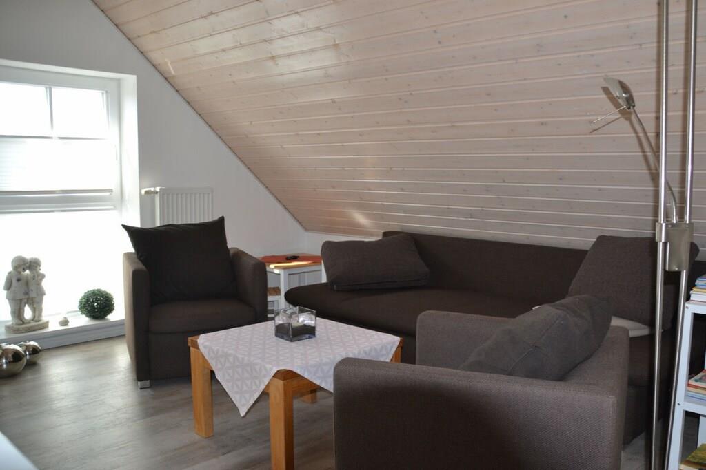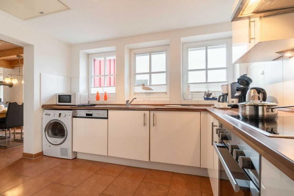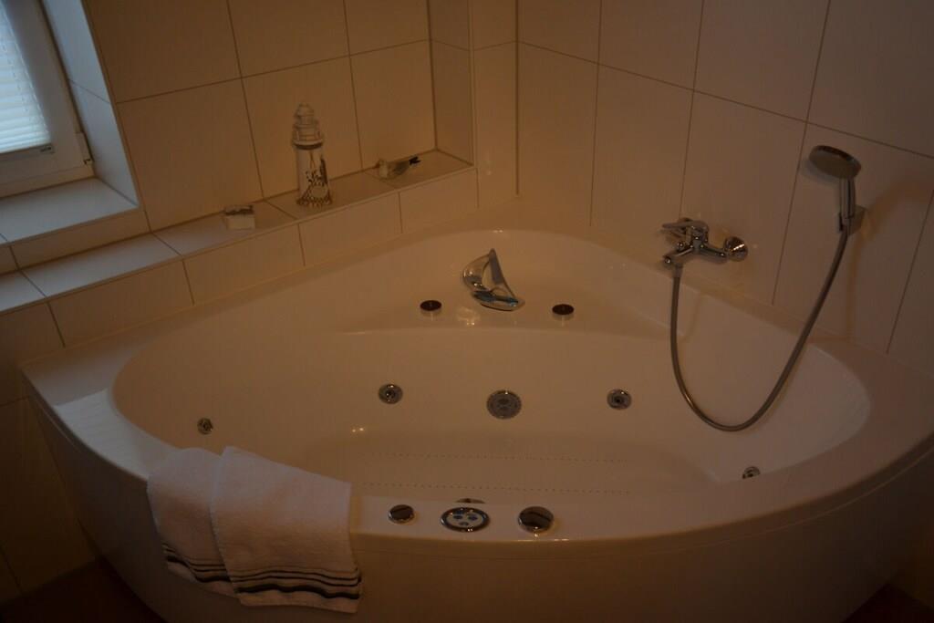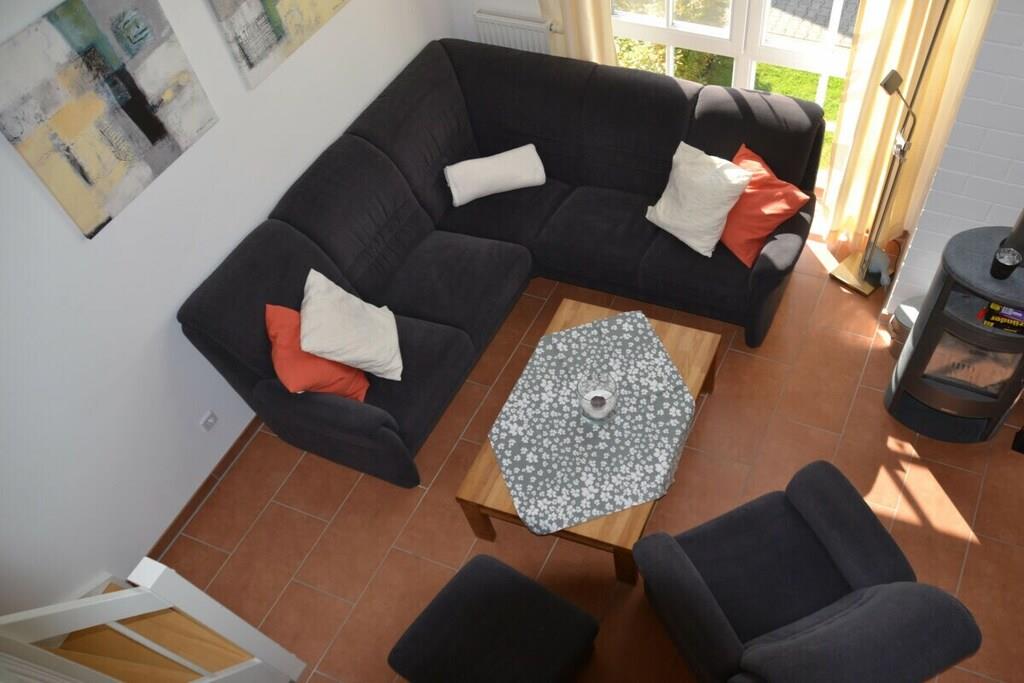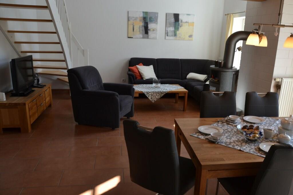 3 Schlafzimmer und 2 weitere Schlafmöglichkeiten (Schlafsofa) auf der Galerie, ein Fernseher mit integriertem Receiver, ein zweiter Fernseher steht in einem der Schlafzimmer, ein Wellnessbad mit Sauna und Whirlpool und ein zweites Duschbad im oberen Wohnungsbereich sorgen für Entspannung. Der gemütliche Wohnraum mit Kaminofen, eine voll ausgestattete Küche lassen keine Wünsche offen. Ein WC-Sitz und Steckdosensicherungen für die Kleinsten sind ebenso vorhanden wie eine Waschmaschine, ein Trockner, Bügelbrett und Bügeleisen. Ihre Fahrräder finden Platz im Fahrradschuppen und die Fliegengitter sorgen dafür, dass ungebetene Gäste draußen bleiben. Und wer zwischendurch im Internet surfen möchte, kann dies mit dem kostenfrei nutzbaren WLAN gerne tun.