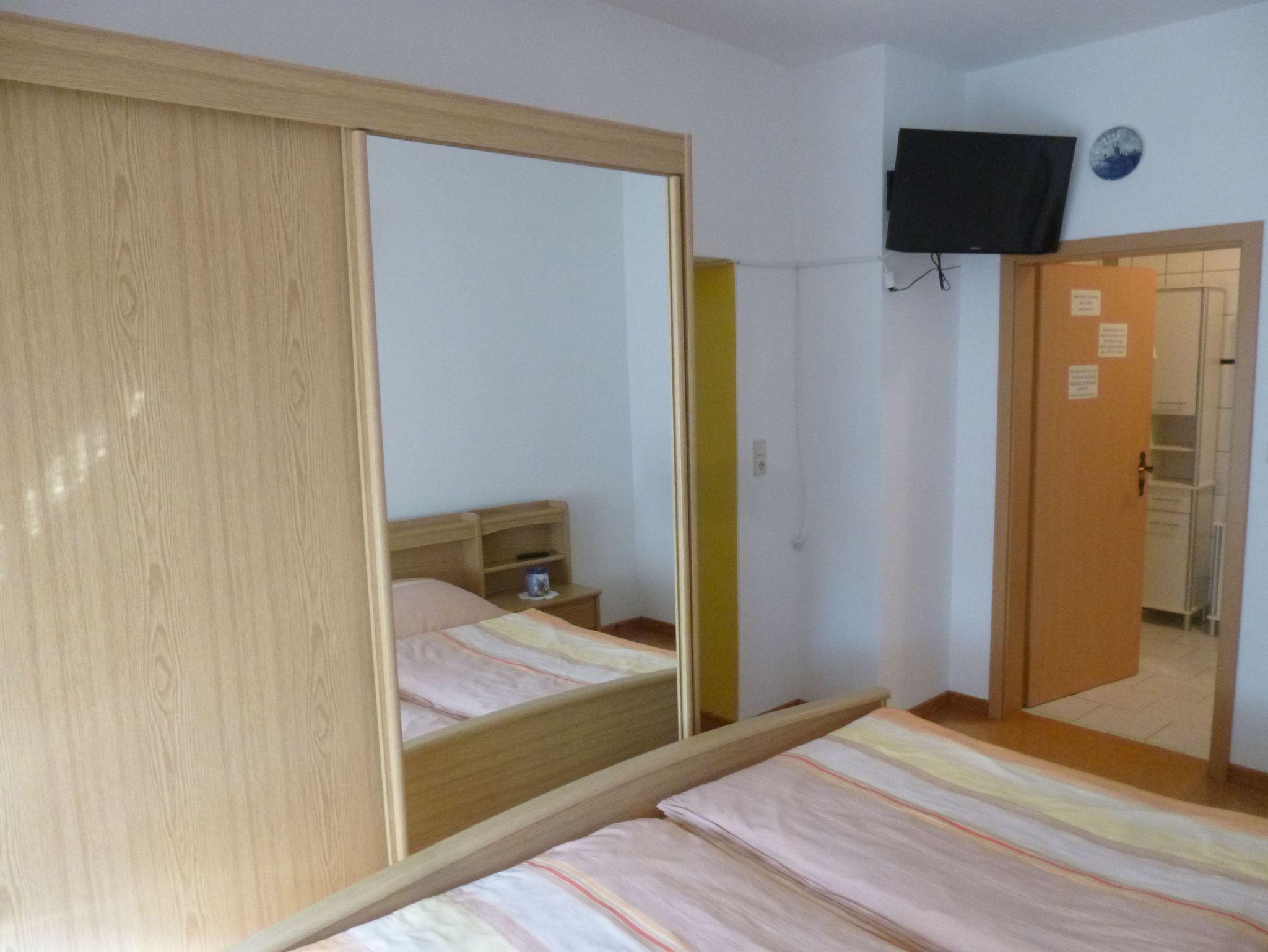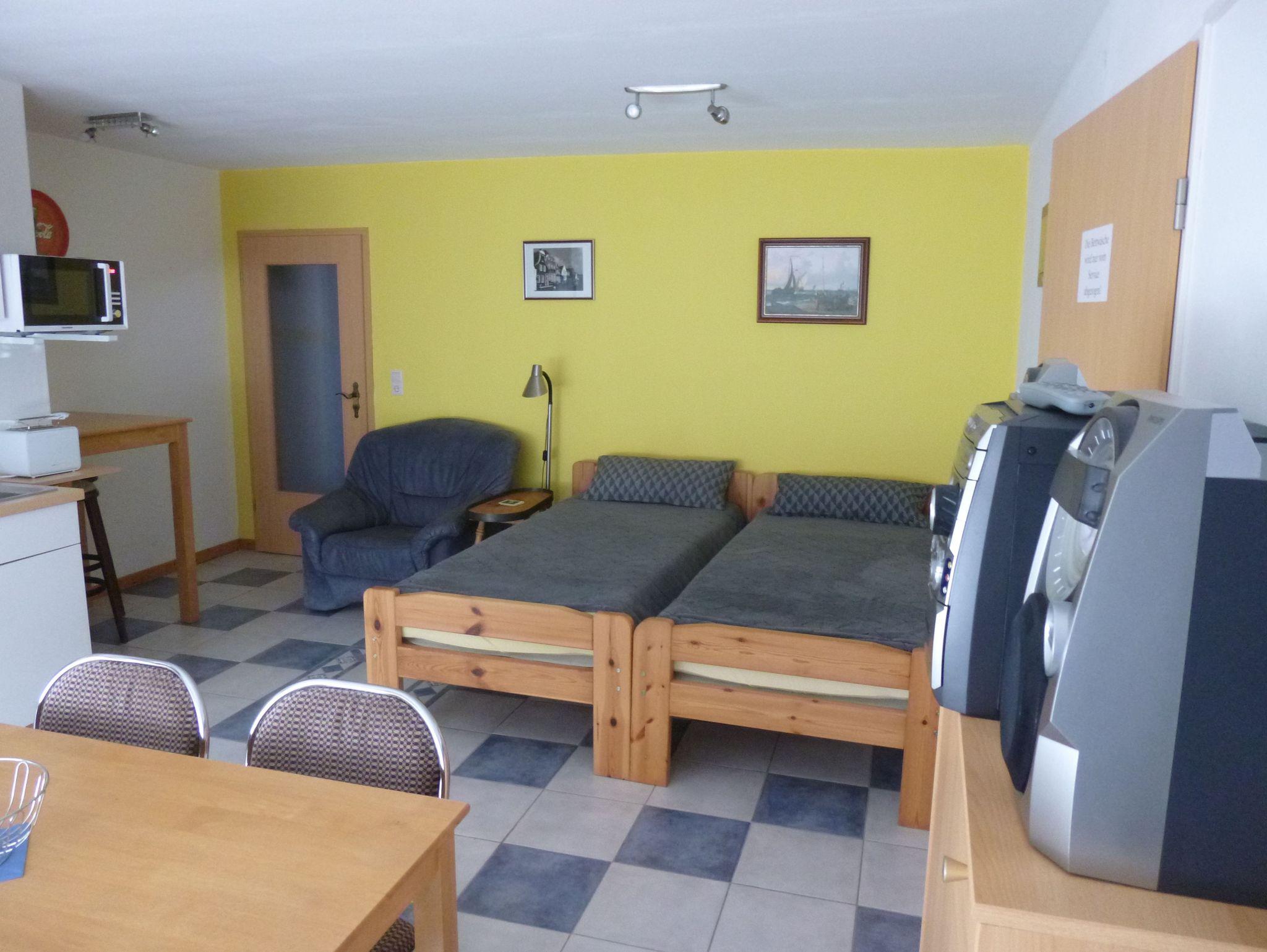 Die ca. 50 qm große Ferienwohnung liegt im Erdgeschoss und verfügt über 1 Schlafzimmer und eine Wohnküche, sowie ein Badezimmer mit Dusche, WC, Waschmaschine und Trockner. In der Küche befindet sich ein Geschirrspüler, ein Herd mit Backofen, sowie eine Kaffeemaschine, Wasserkocher, Mikrowelle und eine Essecke. Im Wohnbereich befinden sich zwei zusätzliche Betten. Im Schlafzimmer, sowie in der Wohnküche steht den Gästen ein Fernseher zur Verfügung.