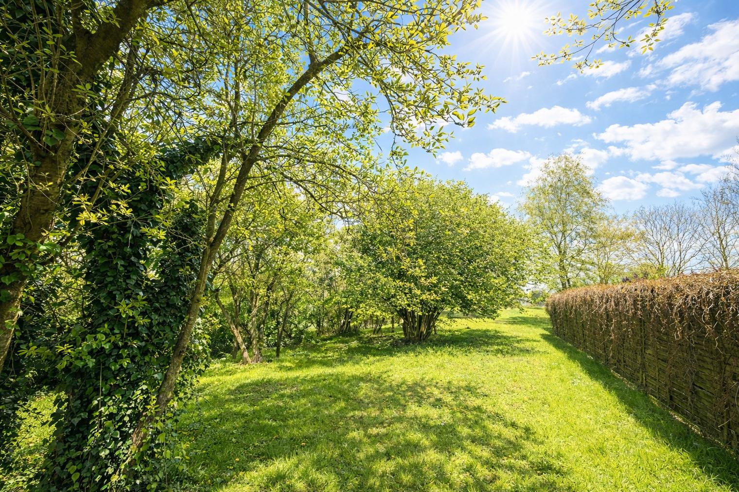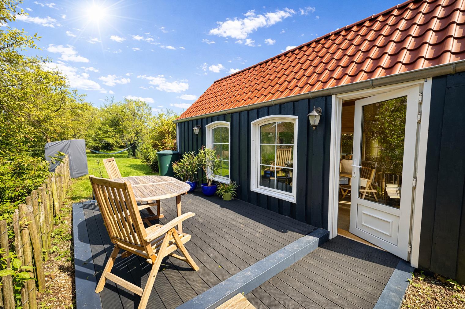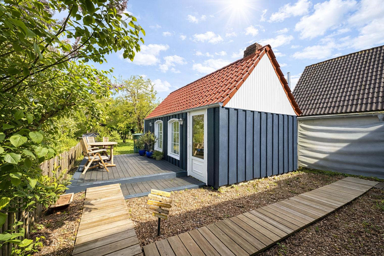Besonders schön: der große, naturbelassene Garten mit Obstbäumen, Strandkorb, Hängematte und einem Gartenhaus mit Kaminofen. Hier lässt man die Seele baumeln — ob bei Sonnenschein im Grünen oder abends am knisternden Feuer. In der Erntezeit dürfen Sie vom Obst naschen.