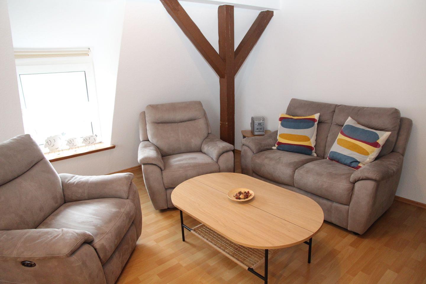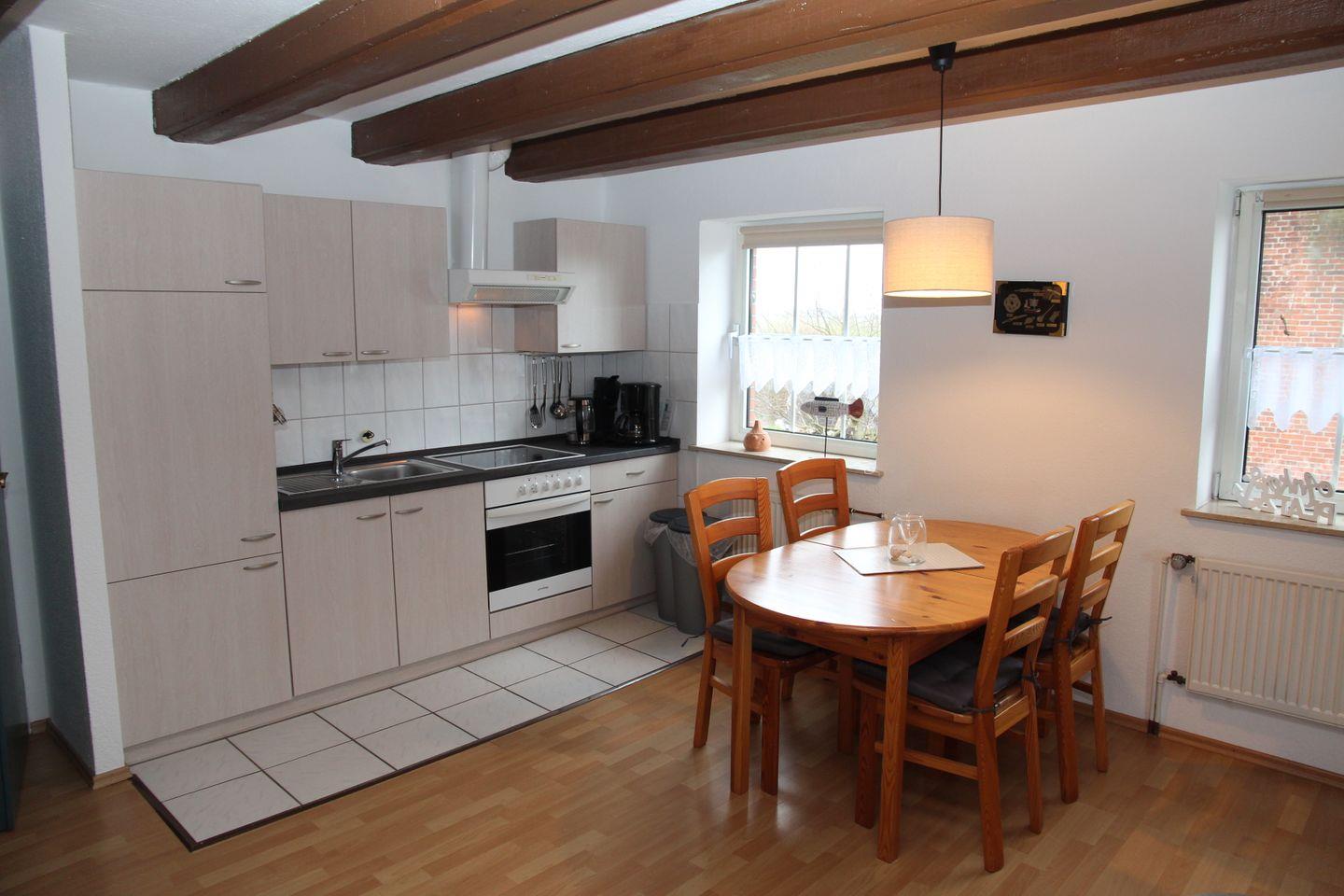Die Obergeschosswohnung "Bentje" bietet auf großzügigen 60qm Platz für bis zu 3-4 Personen. In dieser Wohnung landen Sie direkt im großzügigen Wohn- und Essbereich mit Sofa, zwei Sesseln und Fernseher. Direkt angrenzend in der Küchenzeile mit Essbereich finden Sie Cerankochfeld, Backofen, Kühlschrank, Wasserkocher, Toaster, Kaffeemaschine, Senseo-Padmaschine und Spülbecken. Bitte beachten Sie, dass keine Spülmaschine und auch kein Gefrierfach vorhanden sind. Das modernisierte Badezimmer verfügt über eine Dusche mit niedrigem Einstieg, Waschbecken und WC. In einem der Schlafzimmer finden Sie ein Doppelbett und einen großen Kleiderschrank, in dem anderen ist ein Etagenbett (eher nur für Kinder geeignet) vorhanden.