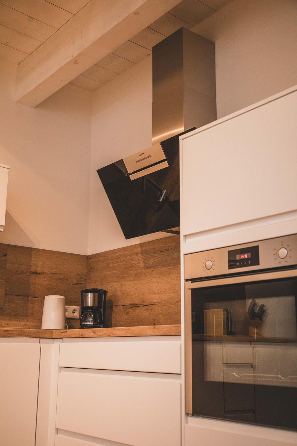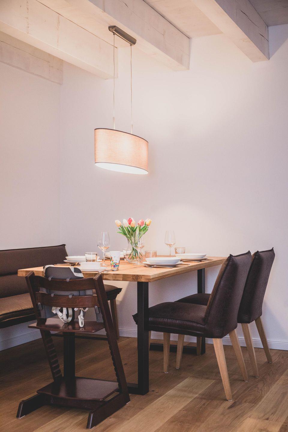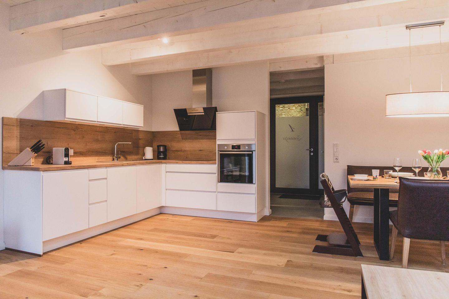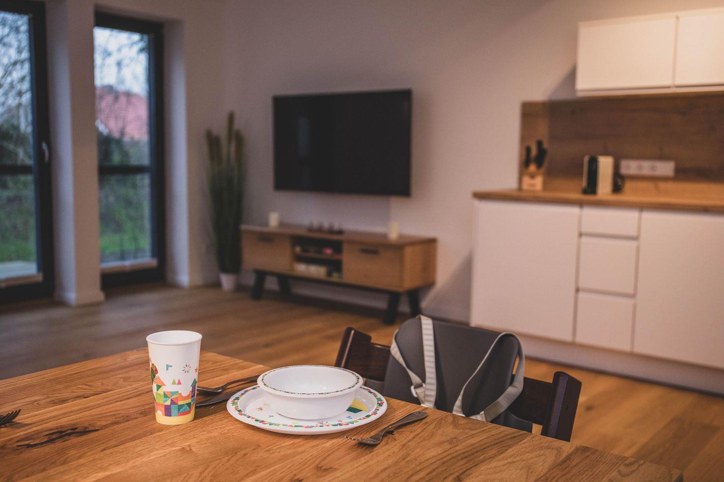 Die Ferienwohnung ist liebevoll gestaltet und überzeugt im Erdgeschoss mit einem offenen Wohnkonzept, welches das Wohnzimmer und die Küche miteinander verbindet. Kochen Sie Ihre Lieblingsgerichte in der voll ausgestatteten Küche – mit Geschirrspüler, Induktionsherd, Kühlschrank und zahlreichen Küchengeräten wie einer Nespresso-Maschine, einem Mixer und einer Mikrowelle. Fürjüngere Gäste gibt es einen Stokke Tripp-Trapp Hochstuhl mit Baby-Set und Gurt, sowie Kindergeschirr- und besteck. Der stilvolle Esstisch lädt zu geselligen Essen mit Freunden oder der Familie ein und die Sofaecke bietet einen tollen Platz für entspannte Abende beim Fernsehen oder Spielen. Im Obergeschoss befindet sich das voll ausgestattete Bad mit WC und bodengleicher Dusche sowie zwei Schlafzimmer, beide mit Verdunkelungsmöglichkeit und Fliegengitter, zusätzlich sind Nachtlichter und ein Türgittervorhanden.