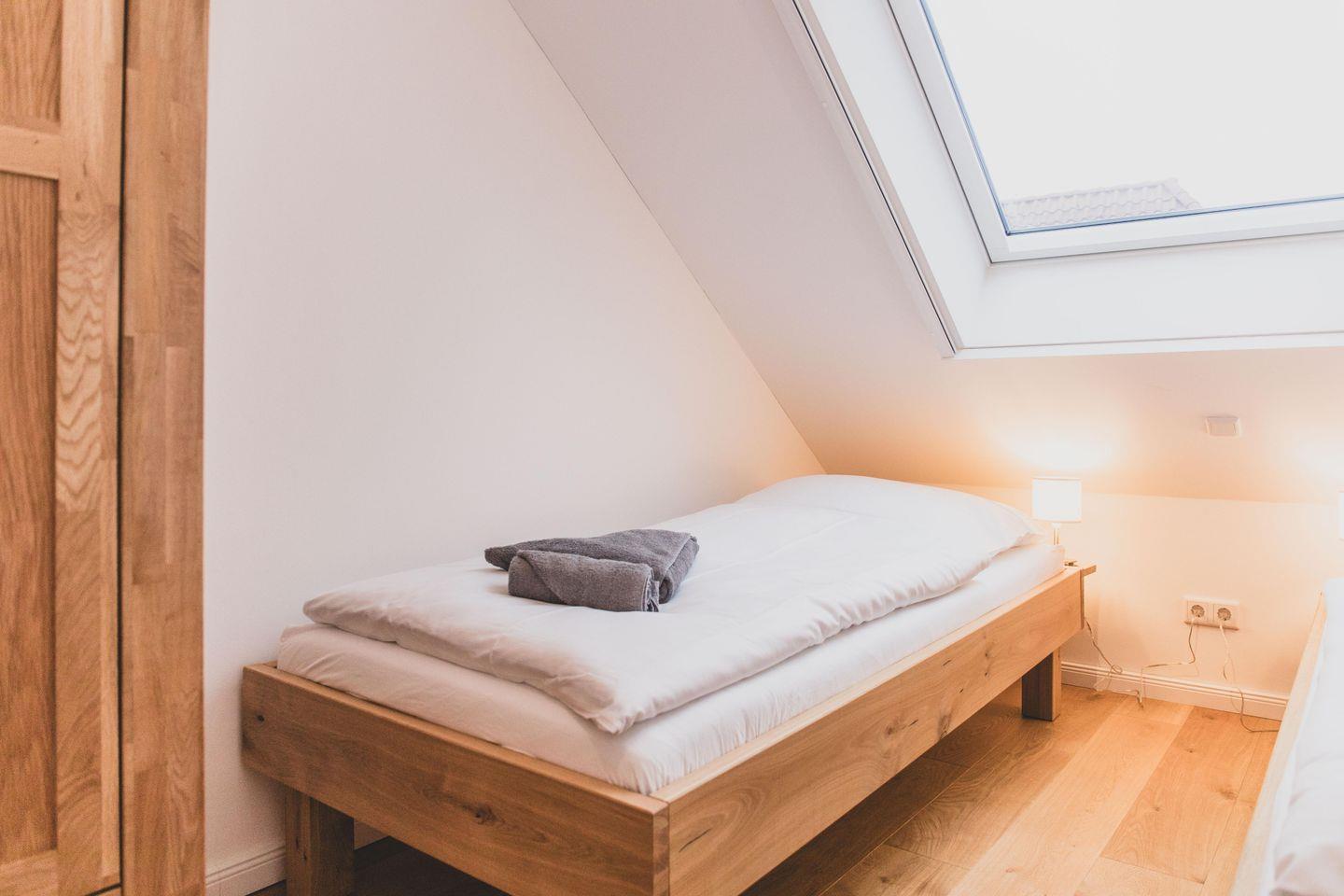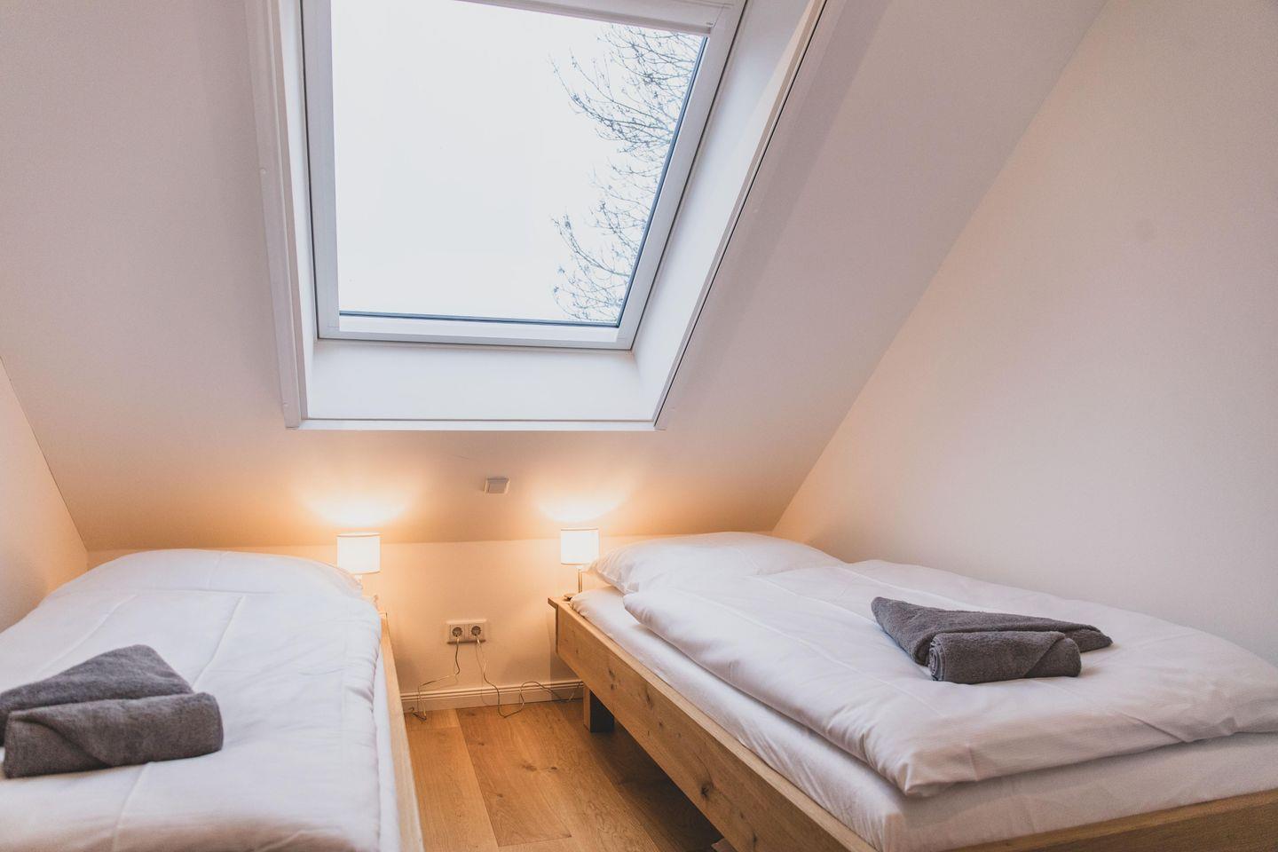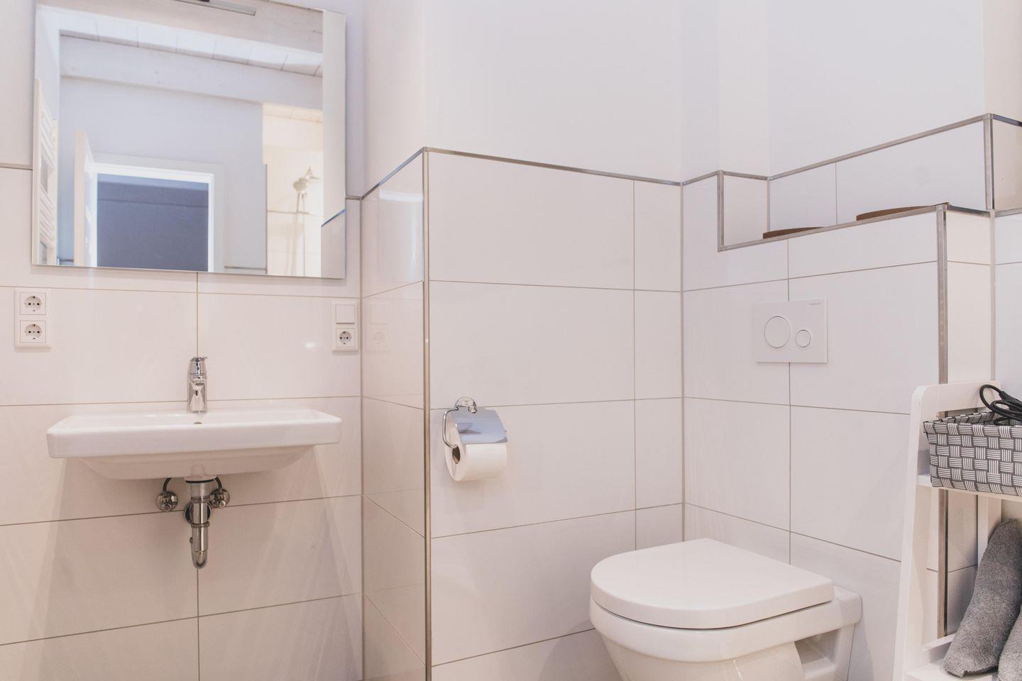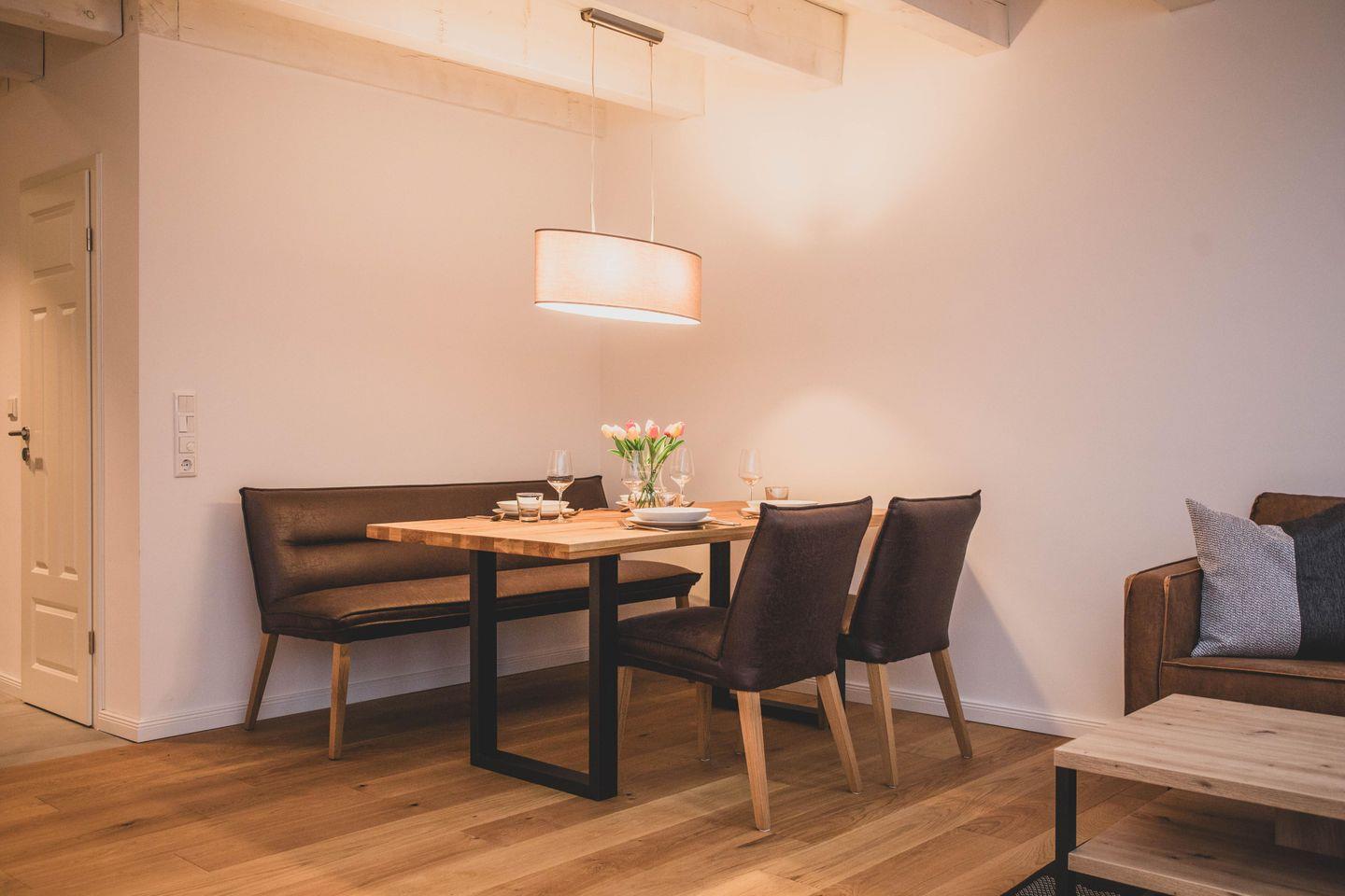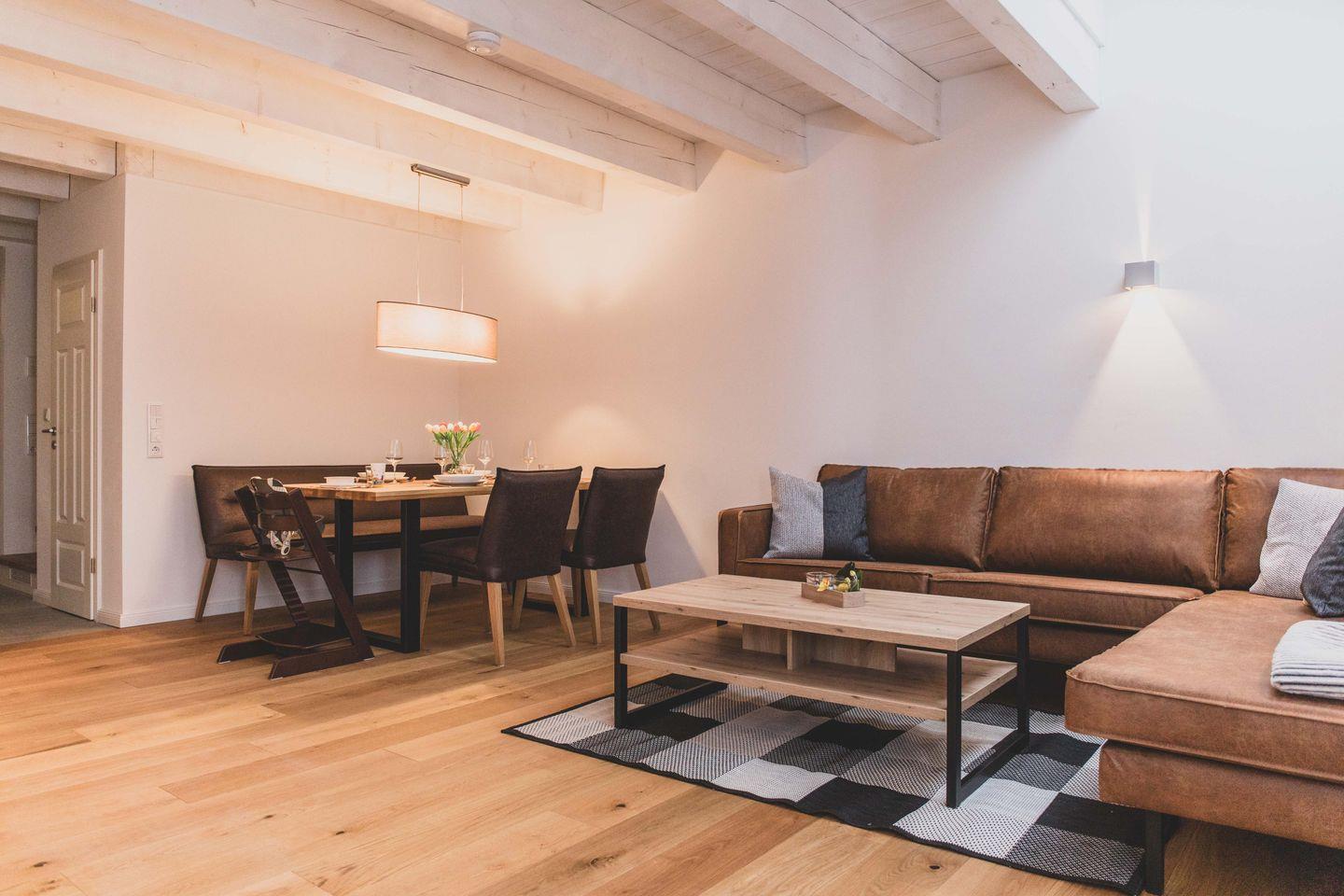 Die Ferienwohnung ist liebevoll gestaltet und überzeugt im Erdgeschoss mit einem offenen Wohnkonzept, welches das Wohnzimmer und die Küche miteinander verbindet. Kochen Sie Ihre Lieblingsgerichte in der voll ausgestatteten Küche – mit Geschirrspüler, Induktionsherd, Kühlschrank und zahlreichen Küchengeräten wie einer Nespresso-Maschine, einem Mixer und einer Mikrowelle. Fürjüngere Gäste gibt es einen Stokke Tripp-Trapp Hochstuhl mit Baby-Set und Gurt, sowie Kindergeschirr- und besteck. Der stilvolle Esstisch lädt zu geselligen Essen mit Freunden oder der Familie ein und die Sofaecke bietet einen tollen Platz für entspannte Abende beim Fernsehen oder Spielen. Im Obergeschoss befindet sich das voll ausgestattete Bad mit WC und bodengleicher Dusche sowie zwei Schlafzimmer, beide mit Verdunkelungsmöglichkeit und Fliegengitter, zusätzlich sind Nachtlichter und ein Türgittervorhanden.