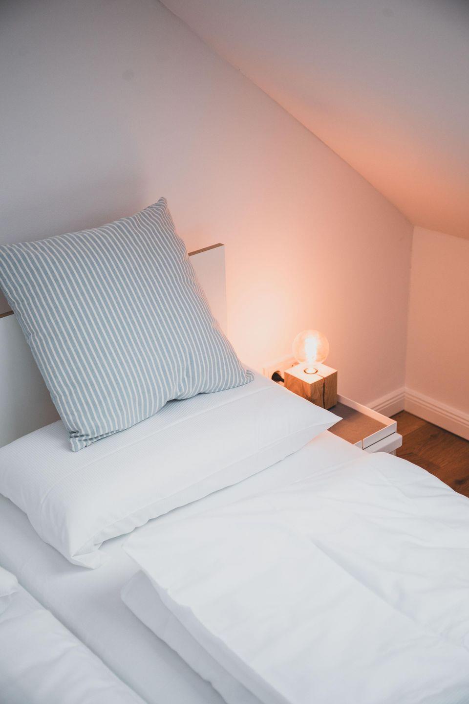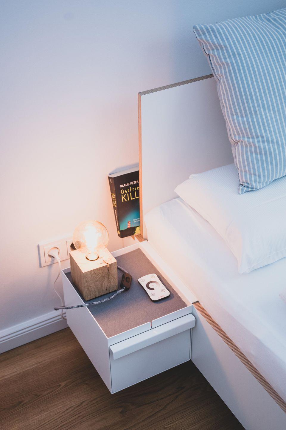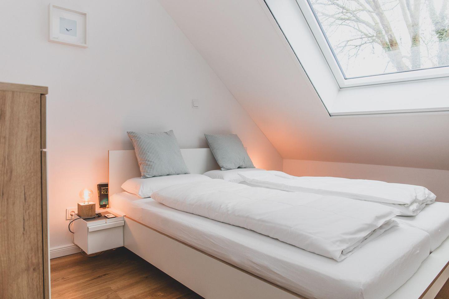 Im Schlafzimmer I befindet sich ein Doppelbett (1,60 m x 2,00 m) mit zwei unterschiedlich harten Matratzen sowie eine Kommode. Stimmungsvolles Licht bietet die Unterbeleuchtung des Bettes, welche ihr bequem über eine Fernbedienung steuern könnt. Oder ihr beobachtet einfach die Sterne durch das große Dachfenster.