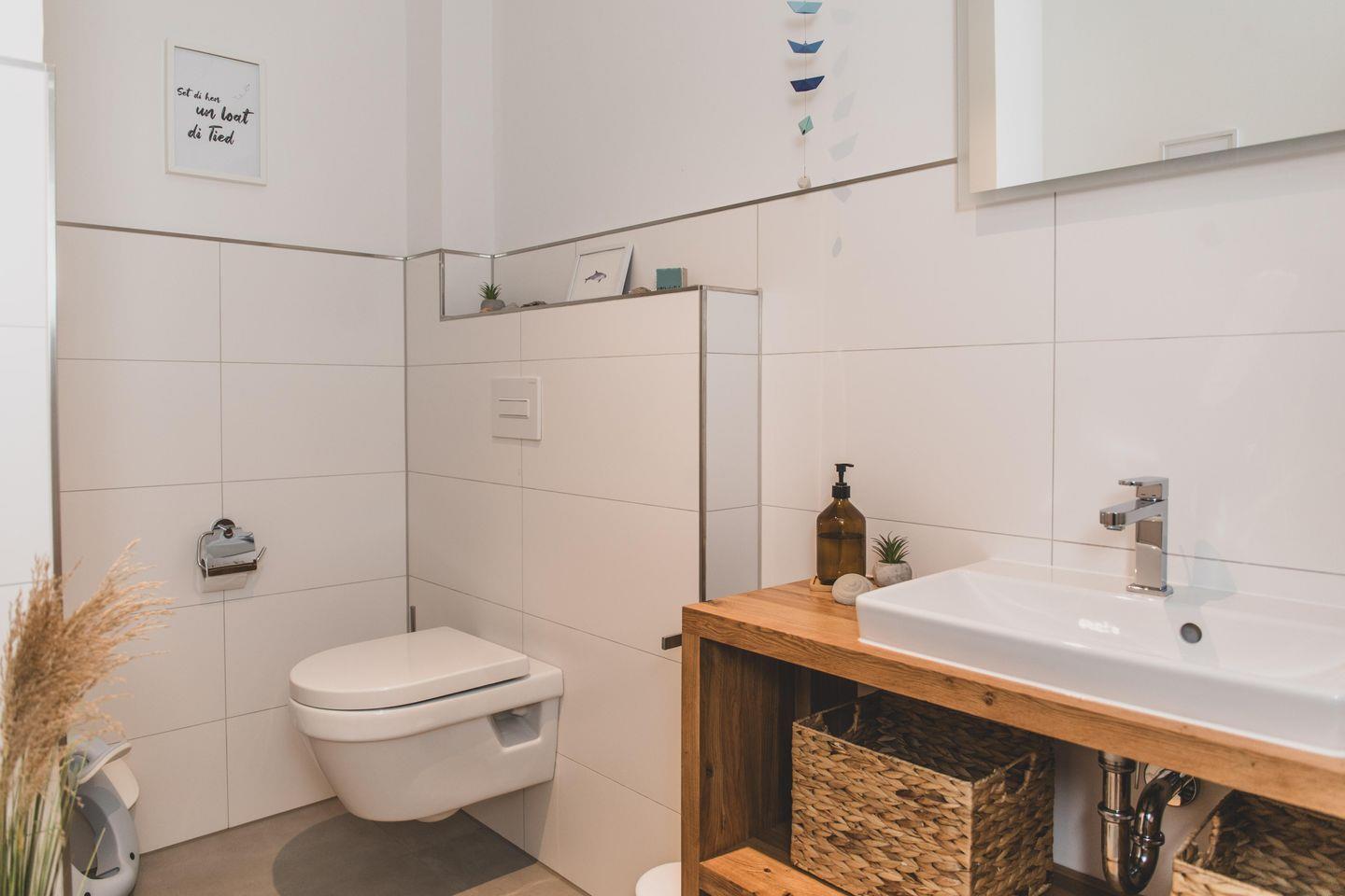 Das geräumige Badezimmer ist mit WC, einer ebenerdigen Dusche und einem großen Waschtisch mit Holz-Ablageflächen ausgestattet.