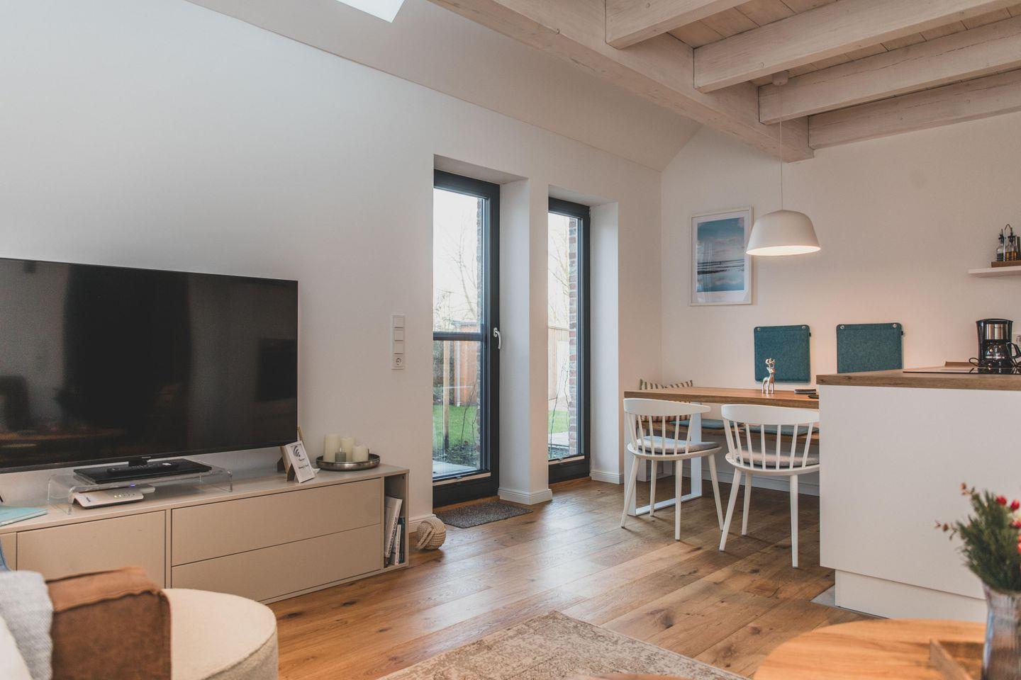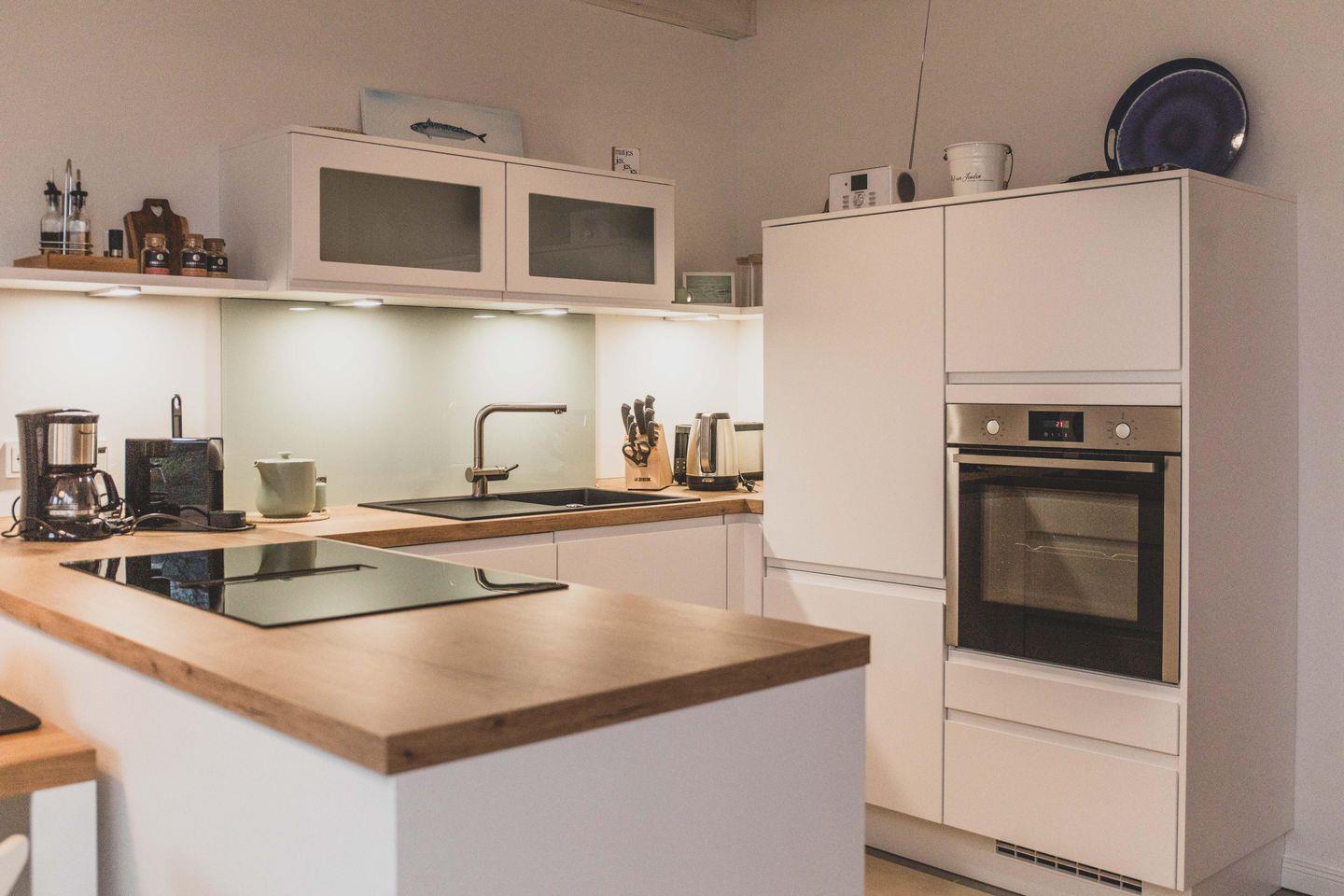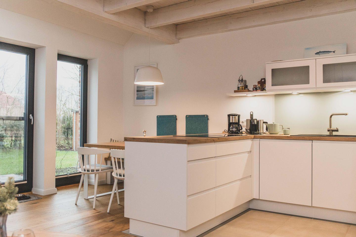 Freizeitköche freuen sich über die umfangreich ausgestattete Küche mit Bora-Kochfeld, hoch eingebautem Backofen, Mikrowelle, Geschirrspüler und Kühlschrank. Startet euren Tag mit einer Tasse heißen Ostfriesentee oder einem Espresso aus der Nespresso-Maschine auf der gemütlichen Bank im Essbereich mit Blick auf die Terrasse und ins Grüne.