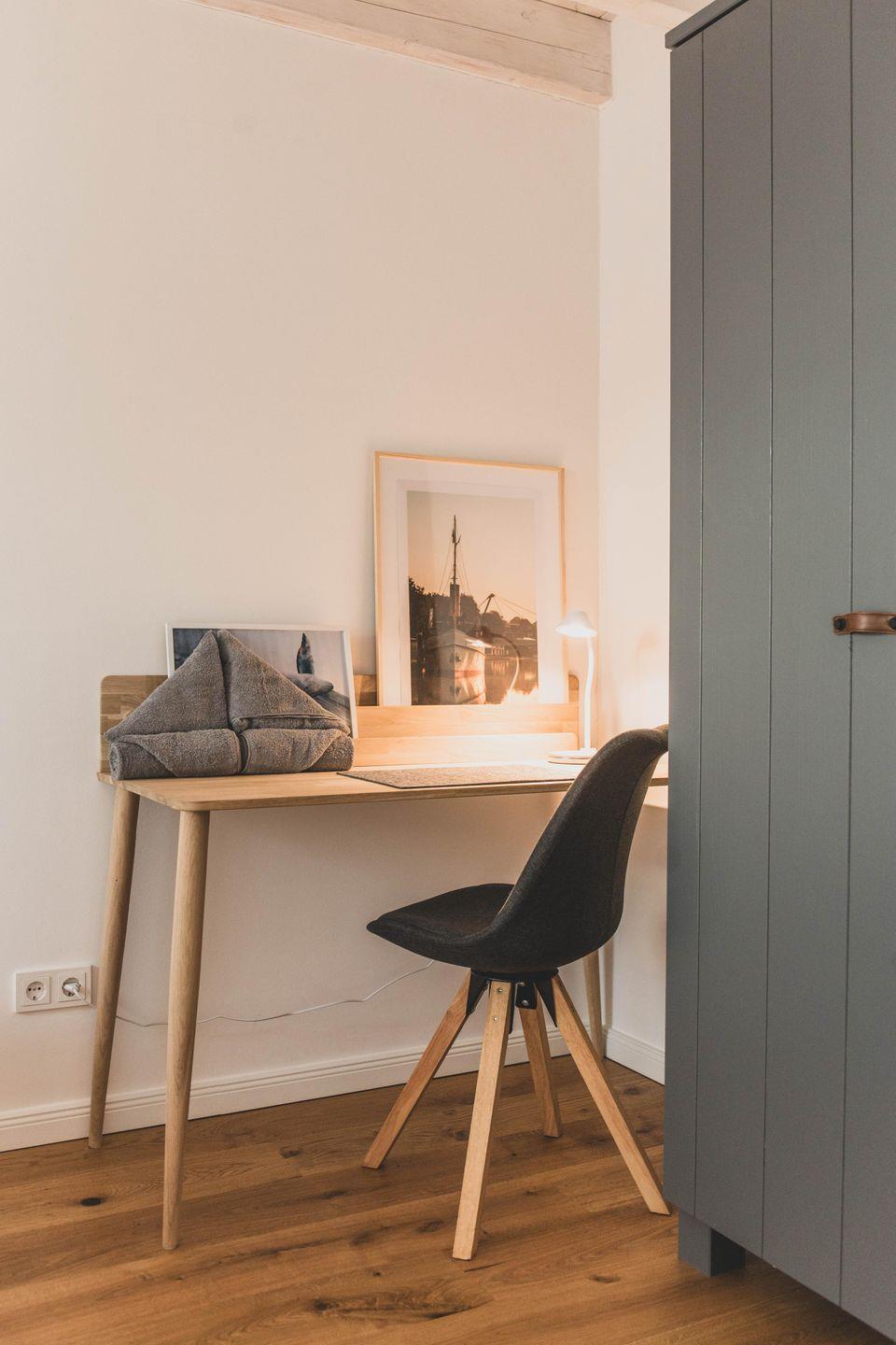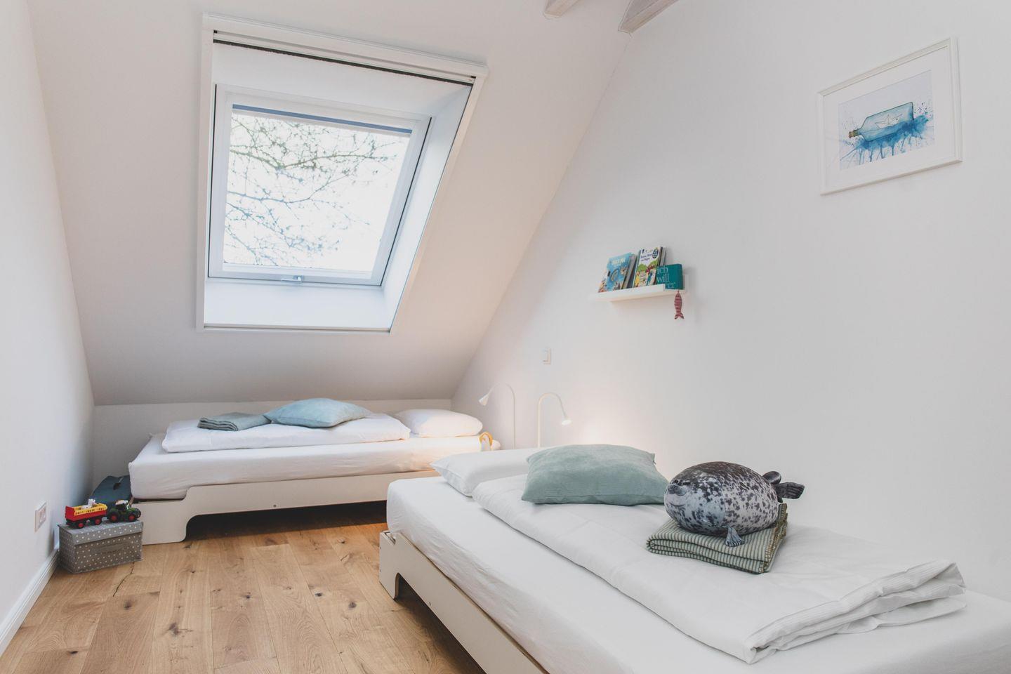 Im Schlafzimmer II befinden sich 2 große Einzelbetten (1,00 m x 2,00 m) sowie ein Schreibtsch.