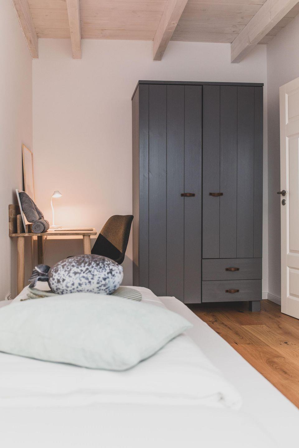 Ein großer Kleiderschrank bietet ausreichend Stauraum.