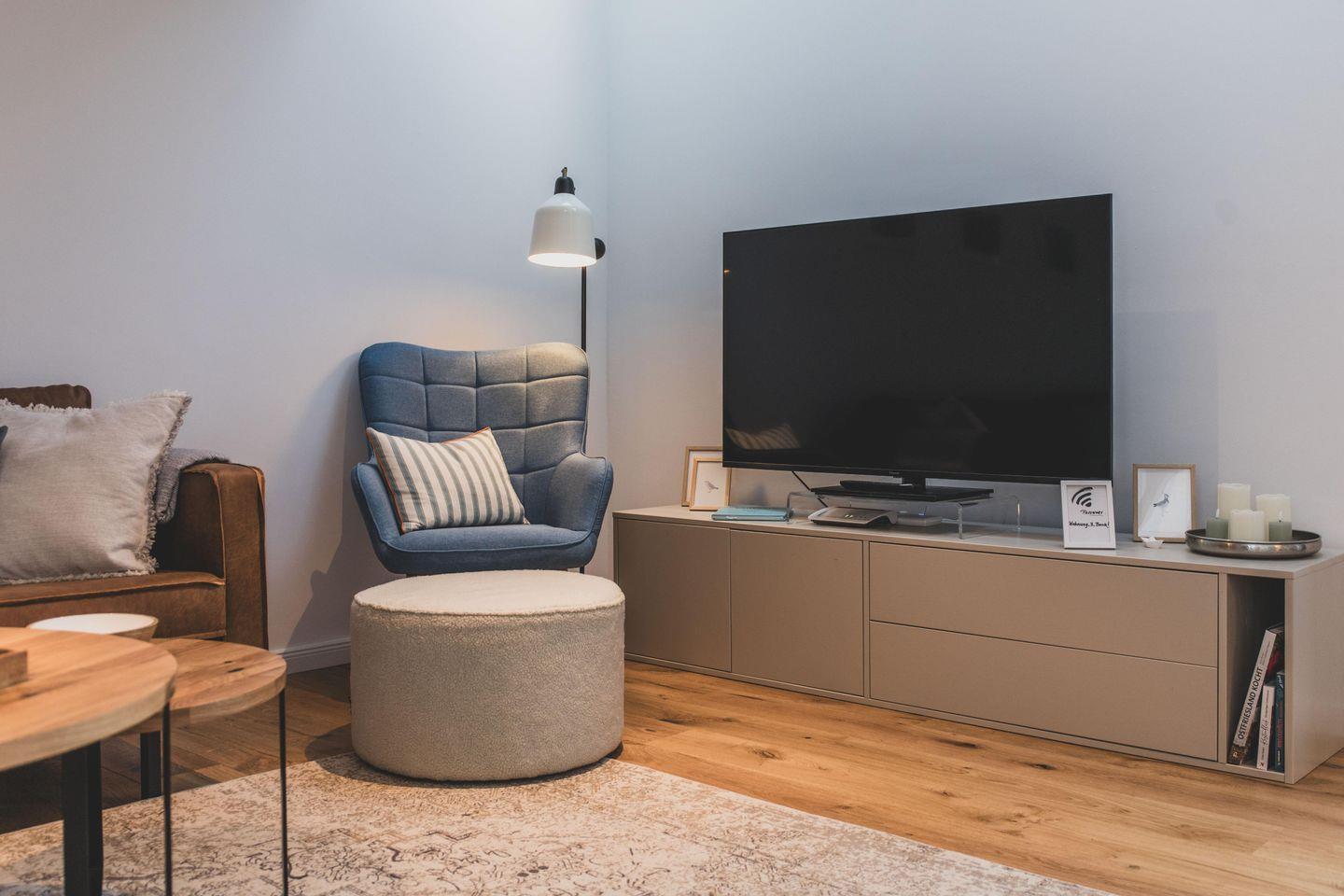 Für Unterhaltung sorgen ein 55“ TV mit Internet- und SAT-Anschluss sowie kostenloses WLAN.