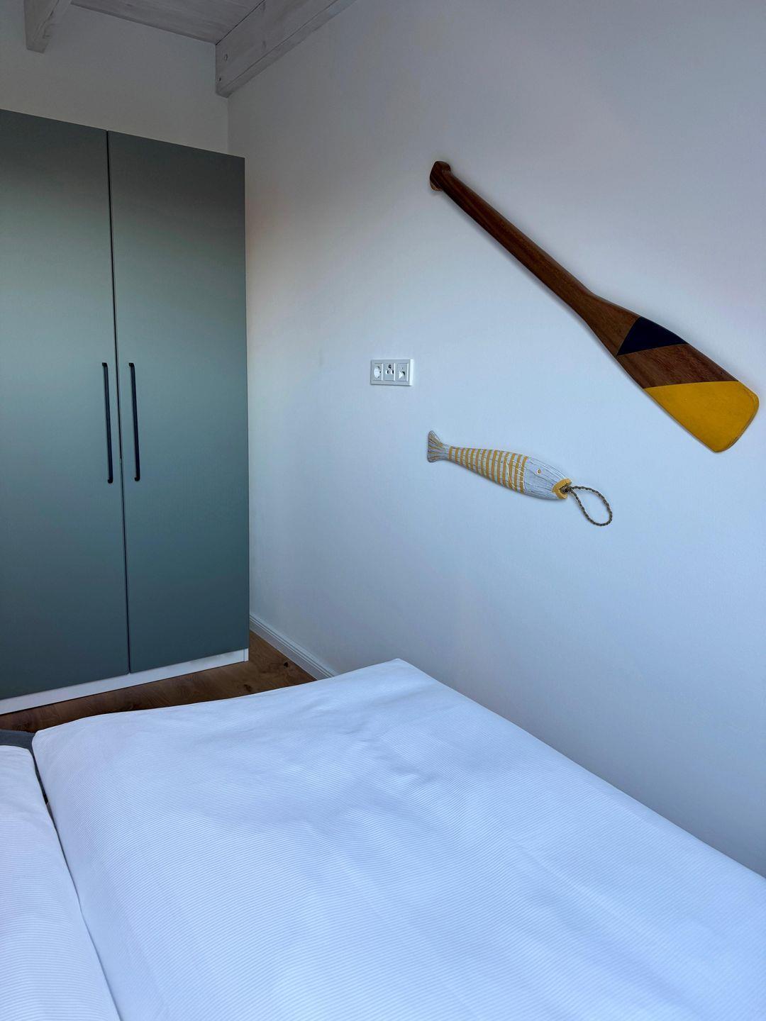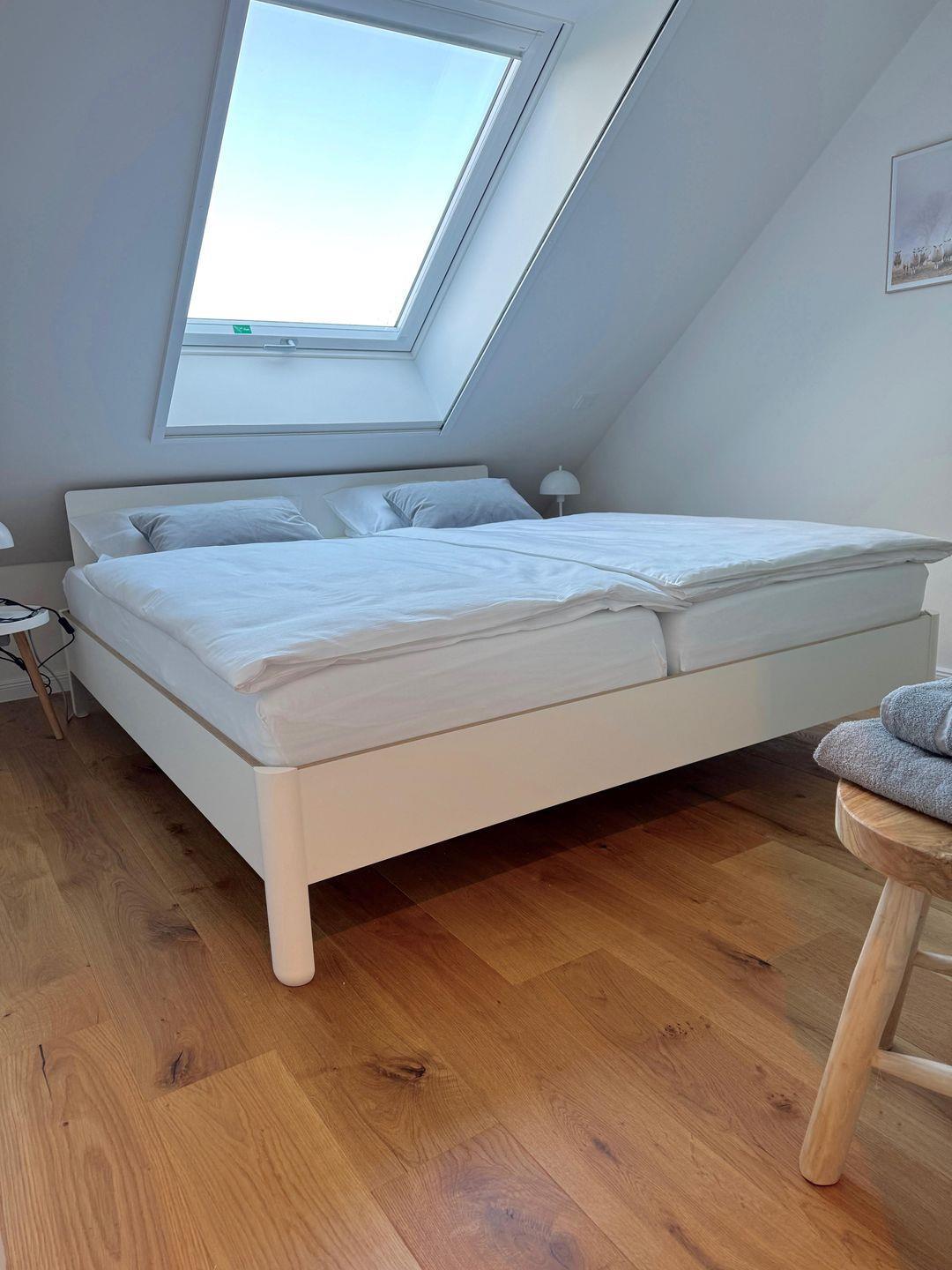 Das Obergeschoss verfügt über zwei geschmackvoll eingerichtete Schlafzimmer. Das moderne Bad ist mit einer bodenebenen Dusche, WC und einer Handtuchheizung ausgestattet. Der obere Treppenbereich ist für unseren kleinsten Gäste zusätzlich mit einem Treppenschutzgitter abgesichert. Des Weiteren sind alle zugänglichen Steckdosen in der Ferienwohnung mit einem integrierten Kinderschutz ausgestattet.