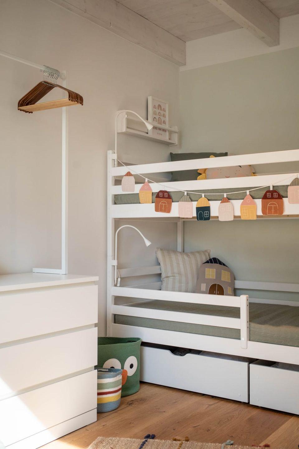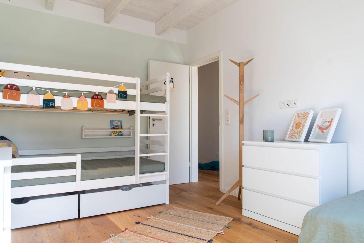 Die beiden Einzelbetten (90 x 200 cm) im 2. Schlafzimmer lassen sich problemlos zu einem Doppelbett zusammenschieben oder für mehr Platz zum Spielen auch übereinanderstapeln. Darüber hinaus bietet ein Etagenbett 2 weitere Schlafplätze (90 x 200 cm) für Kinder oder schlanke Gäste bis 70 kg Körpergewicht. In 2 Kommoden (eine davon mit aufgesetzter Kleiderstange) ist auch hier genügend Platz für Kleidung und persönliche Dinge.