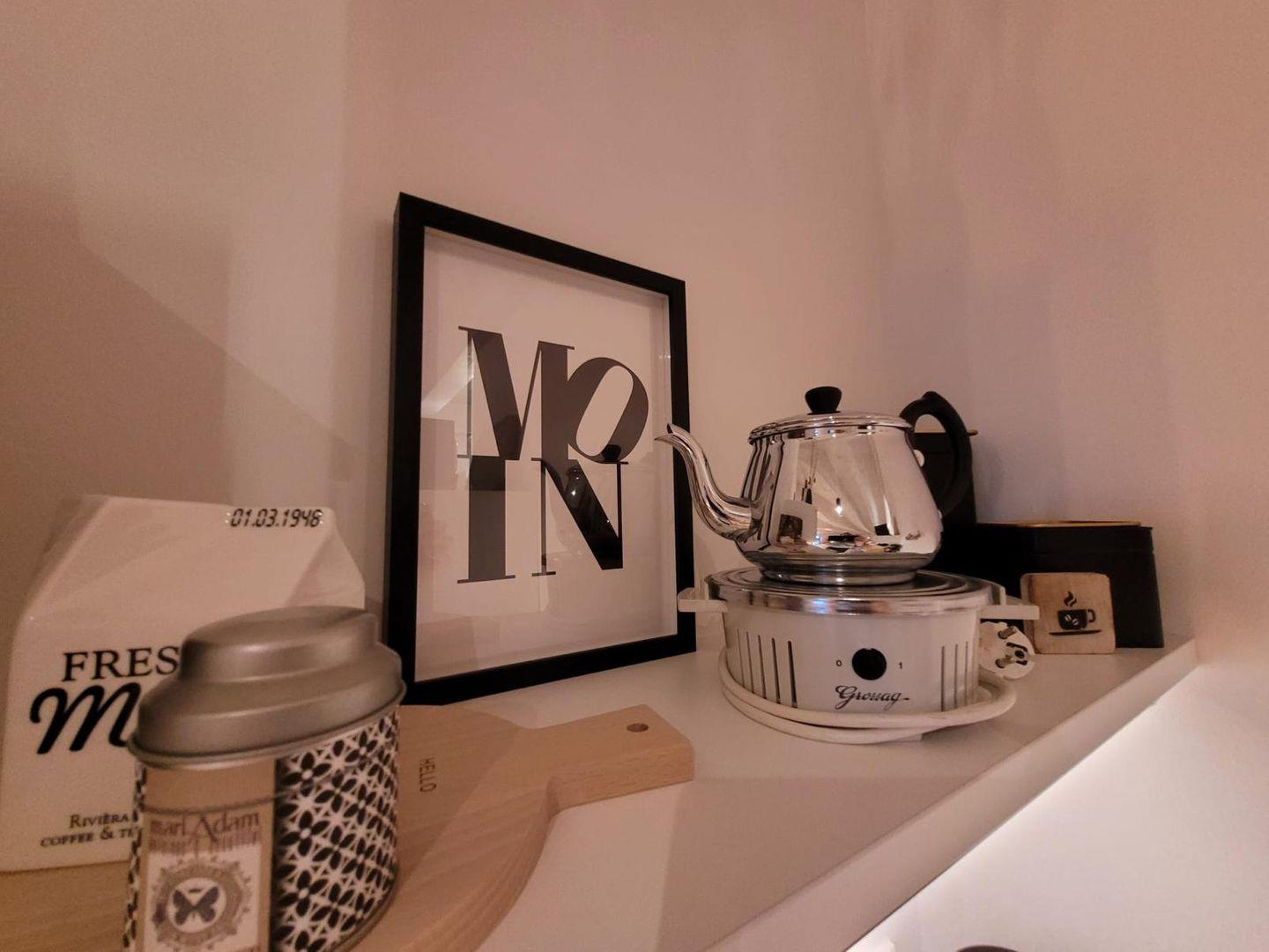 3 Tassen Tee mit Sahne und Kluntje aus original ostfriesischen Teetassen sind „Ostfriesenrecht“, aber auch Kaffeeliebhaber kommen mit einer Filter-Kaffeemaschine, Milchaufschäumer und der Nespresso Essenza mini auf ihre Kosten.