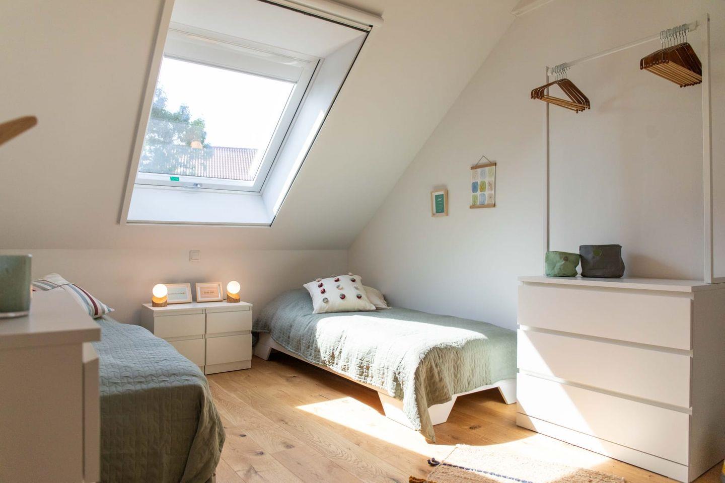 Ein weiteres Bad mit bodentiefer Dusche sowie 2 Schlafzimmer mit großen Dachfenstern (incl. Insektenschutz- und Verdunklungsrollos) befinden sich in der oberen Etage. Im oberen Bad sorgt der integrierte Träger des Ständerfachwerks wiederum für einen ganz besonderen Charme.