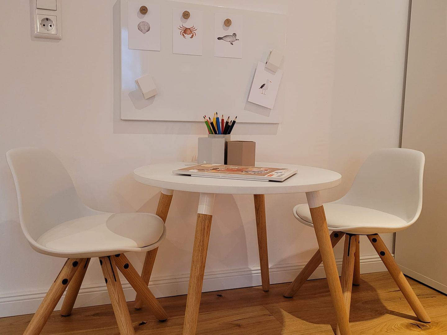 Kinder werden sich über einen eigenen kleinen Tisch mit 2 Stühlen, Malutensilien, Bilderbücher sowie Bau-, Lego- und Duplo-Steine freuen. Ein Hochstuhl sowie Kindergeschirr sind ebenfalls vorhanden.