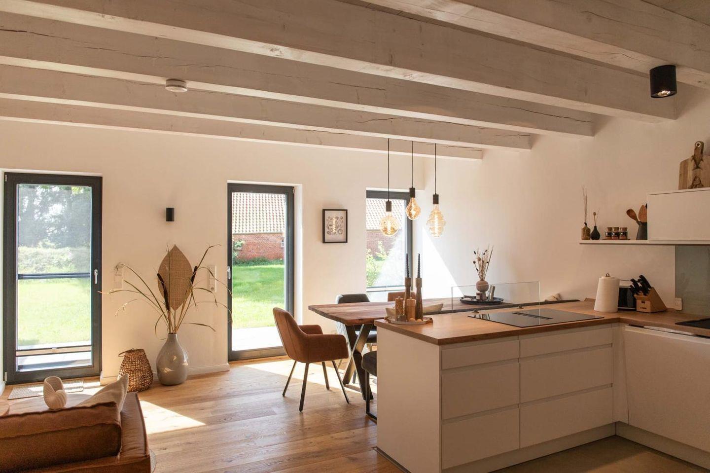 Die moderne, umfangreich ausgestattete Küche lädt zum gemeinsamen Kochen ein. Backofen, Toaster, Mikrowelle, ein großer Kühlschrank incl. Gefrierfach und eine Spülmaschine gehören ebenso zur Ausstattung wie ein Induktionskochfeld mit integriertem Dunstabzug.