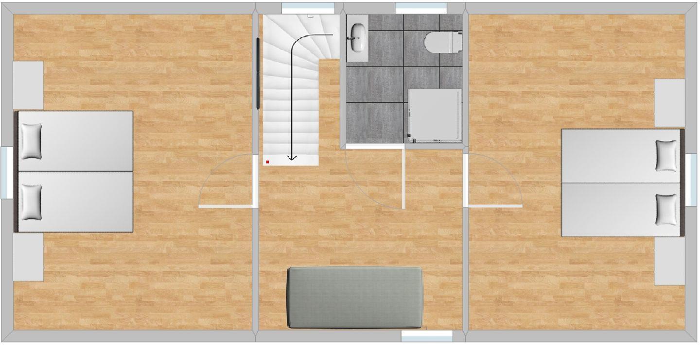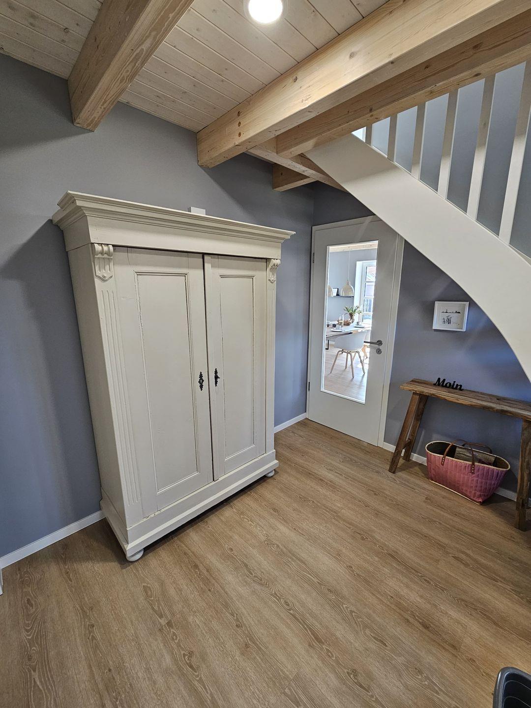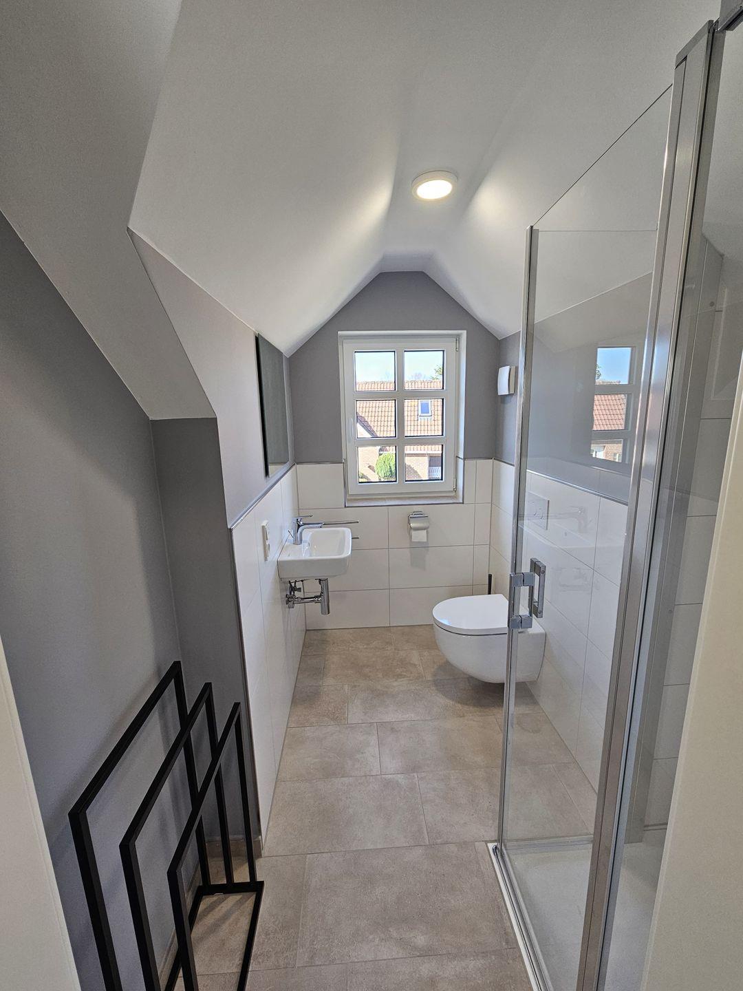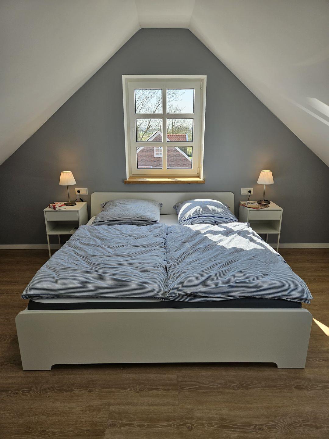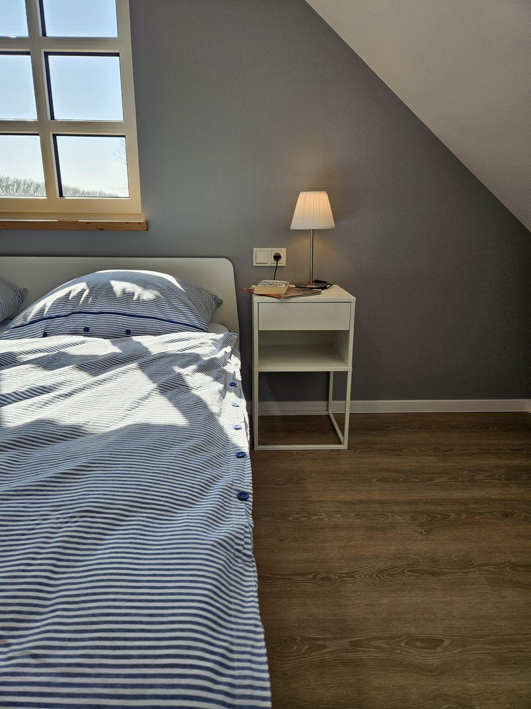 Das Ferienhaus Mühle 5 verfügt über insgesamt zwei Schlafzimmer, die sich hervorragend für erholsame Nächte eignen. Weiterhin stehen Ihnen zwei Badezimmer zur Verfügung, die mit bodengleichen Duschen und modernen Waschbecken ausgestattet sind. Zudem gibt es eine Waschmaschine, die zur Eigennutzung bereitsteht, sowie die Erstausstattung an Handtüchern und Bettwäsche. Ein zusätzlich Bett im Flur des Obergeschosses erlaubt es weiteren 2 Personen bequem zu nächtigen. Bitte beachten Sie, dass dieser Raum nicht von den anderen Räumen abgetrennt ist.