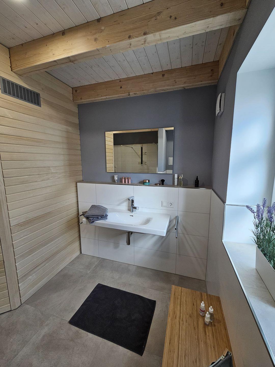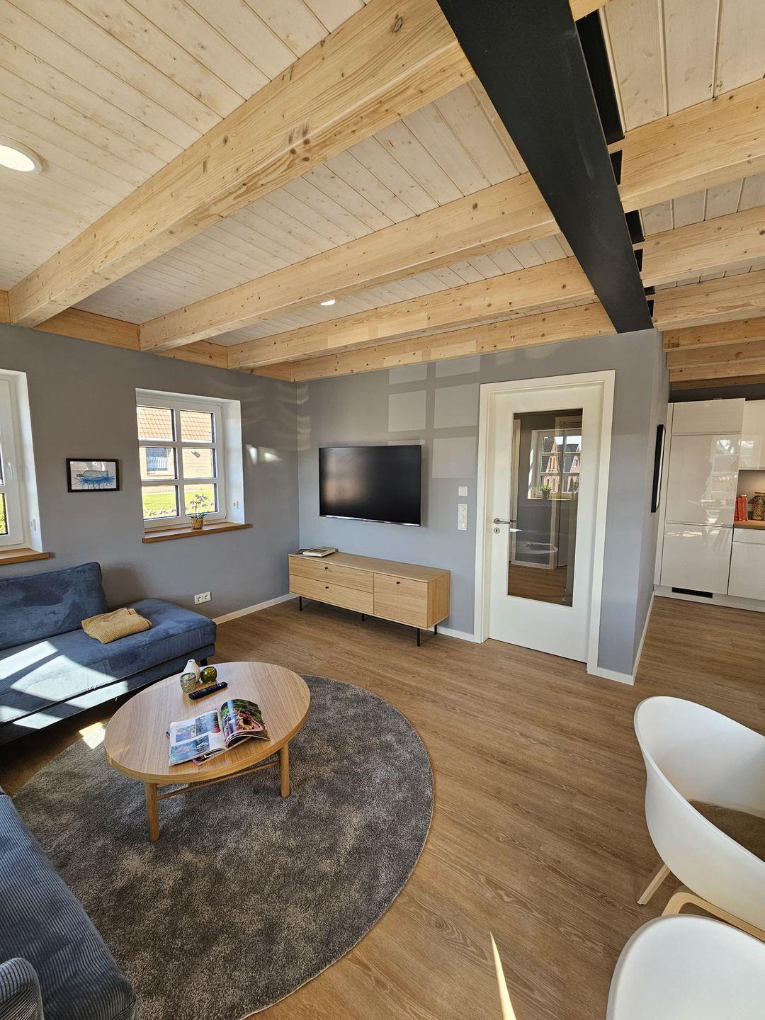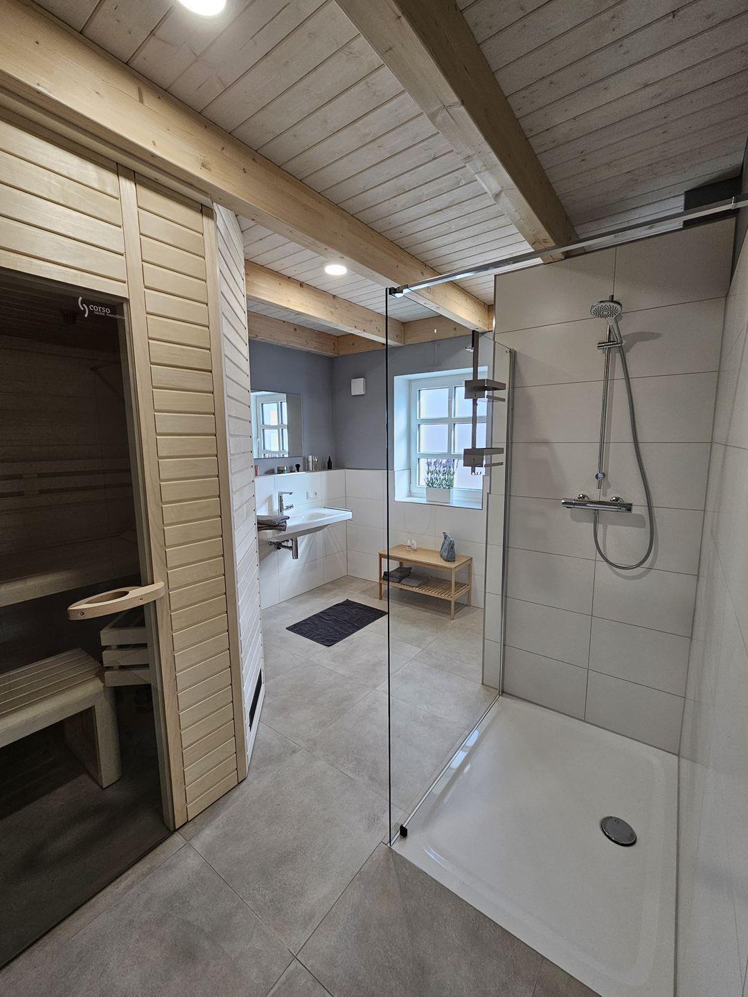 Im Wohnbereich laden eine bequeme Sitzecke, eine Sofaecke und ein Smart-TV zum Entspannen ein. Große Fenster sorgen für viel Tageslicht und eine einladende Atmosphäre. Die gesamte Einrichtung ist modern und geschmackvoll gewählt – ideal für einen Urlaub, der Luxus und Gemütlichkeit miteinander vereint. Genießen Sie entspannte Stunden in der hauseigenen Sauna - perfekt zum Abschalten nach einem ereignisreichen Urlaubstag.