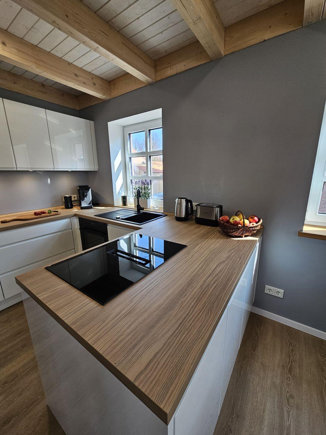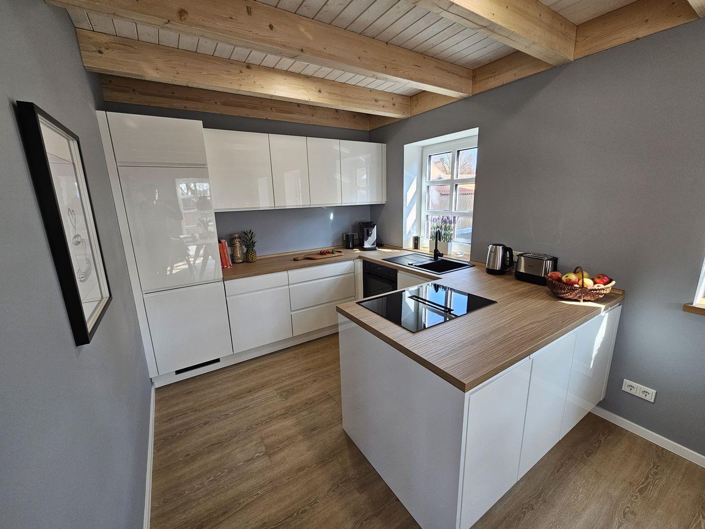 Das großzügige Zuhause erstreckt sich über zwei Etagen und ist mit allem ausgestattet, was Sie für einen komfortablen Aufenthalt benötigen. Die helle und offene Küche, die nahtlos in den Wohnbereich übergeht, ist modern gestaltet und verfügt über alle notwendigen Utensilien, um Ihre Lieblingsgerichte zuzubereiten. Hier finden Sie einen Backofen, ein 4-Platten-Induktionskochfeld, eine Spülmaschine sowie eine Espressomaschine. Der Esstisch bietet genug Platz für gemeinsame Mahlzeiten und gesellige Abende.
