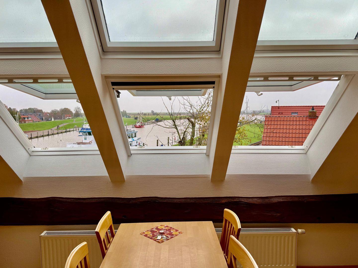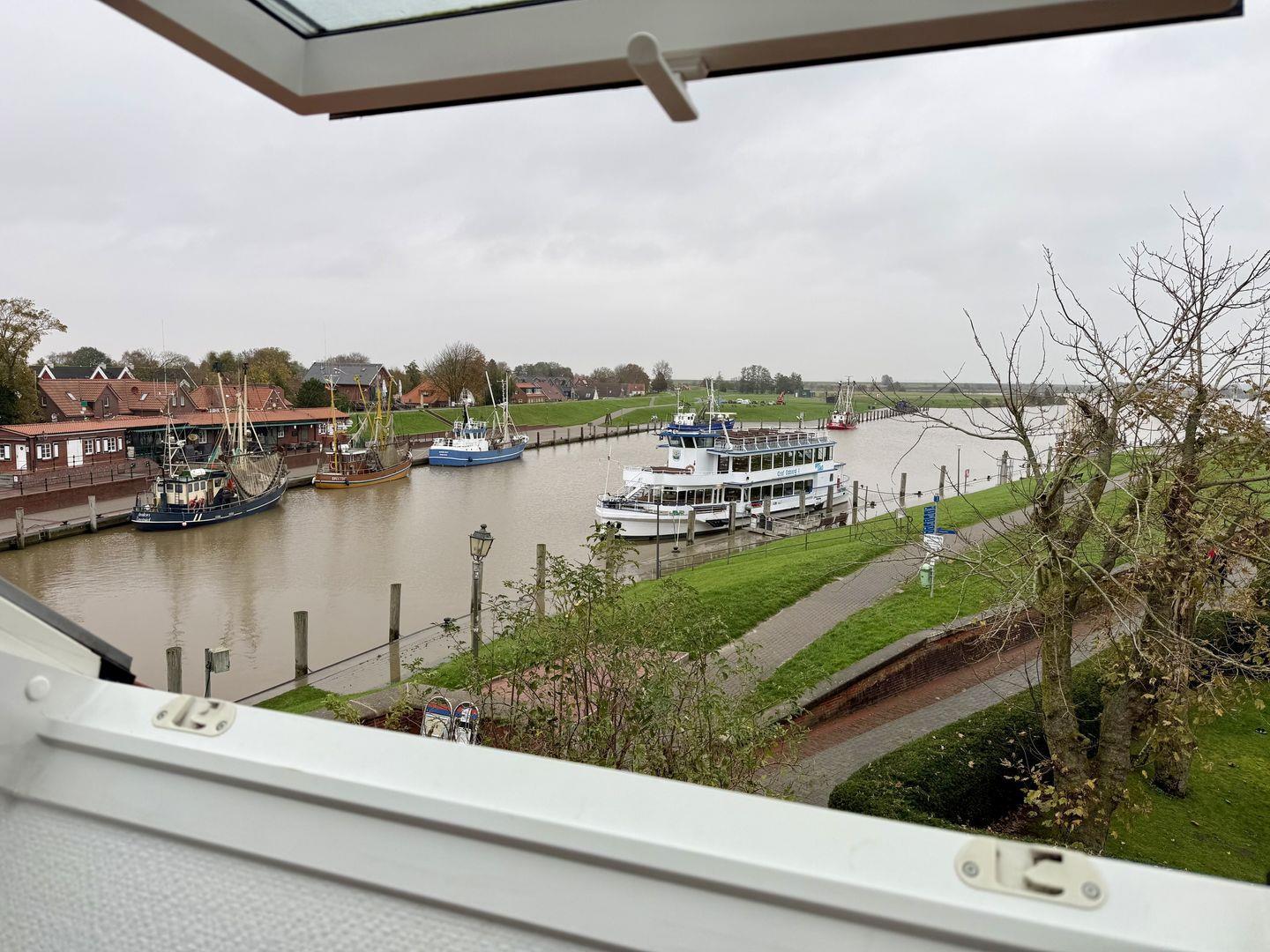 Die ruhige, komfortable Ferienwohnung „Woquard“ liegt oben zur Deichseite und bietet Platz für bis zu 4 Personen. Genießen Sie den Blick auf den Kutterhafen und die Hafenausfahrt.