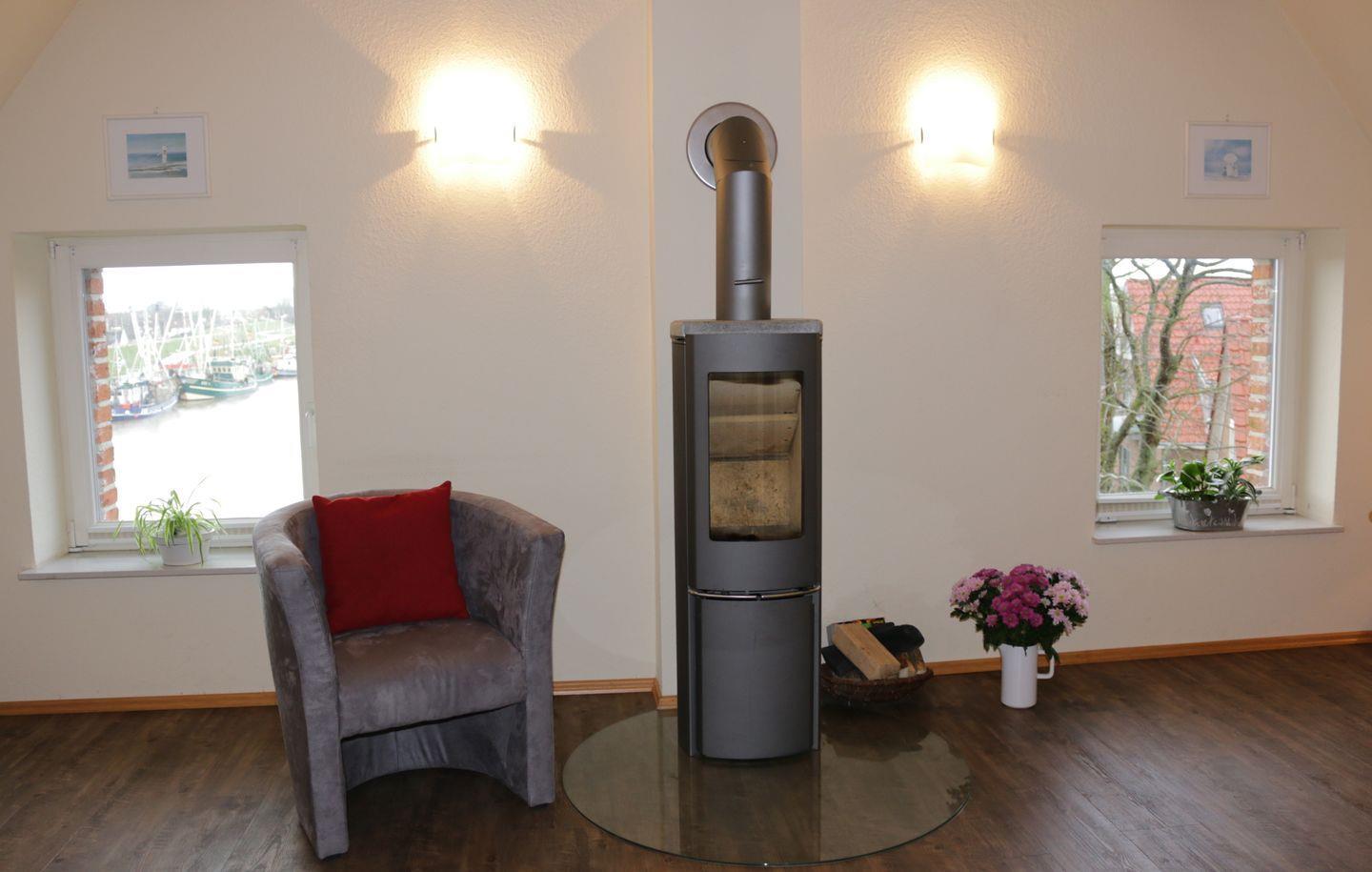 Die Nichtraucher-Ferienwohnung „Rysum“ liegt im Vorderhaus im Dachgeschoss und bietet Platz für 2 Personen. Genießen Sie den wunderschönen Blick auf den Kutterhafen und die historische Häusergalerie.
