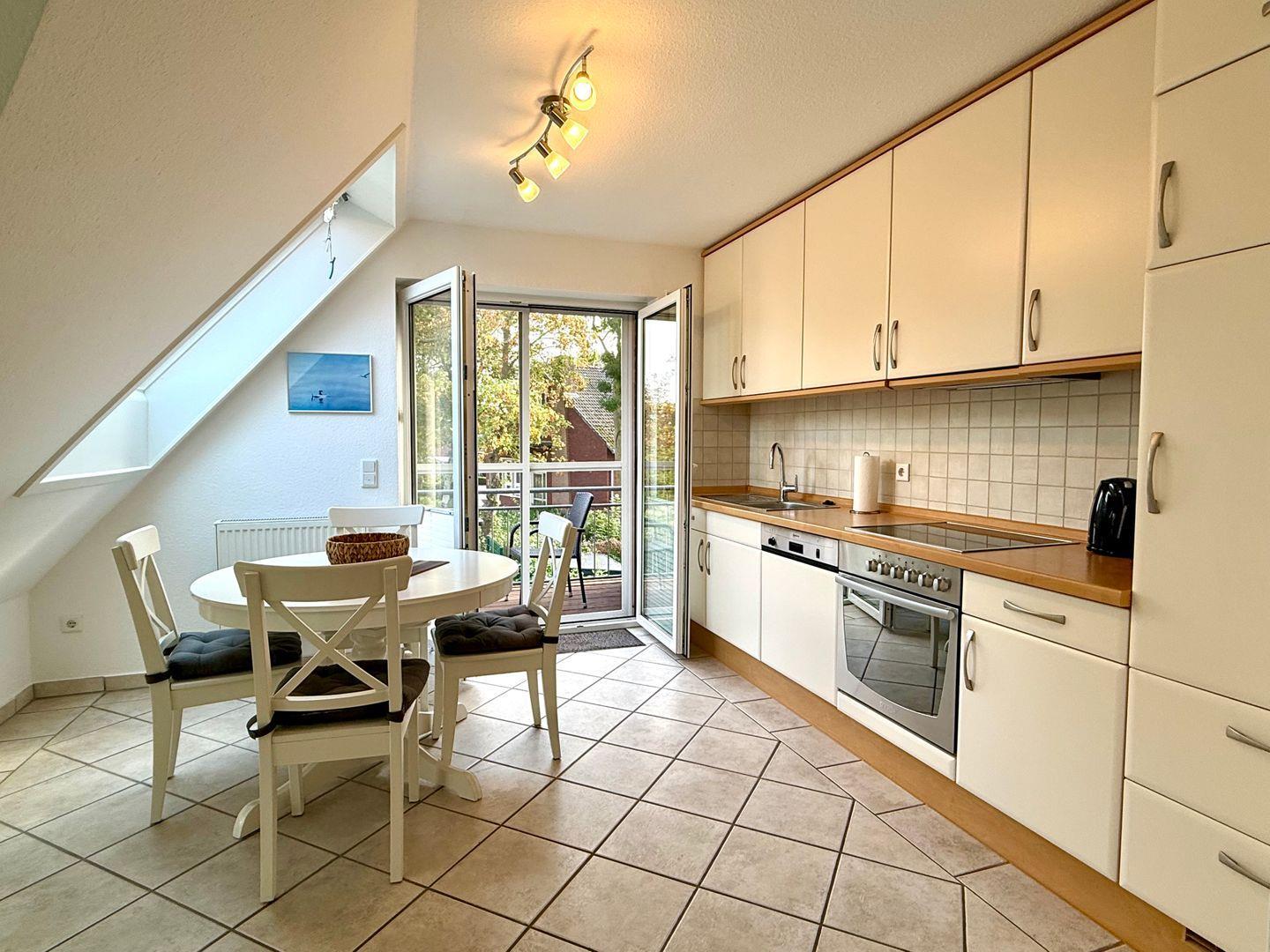 Die Küchenzeile ist vollständig ausgestattet – unter anderem mit Geschirrspüler, großem Kühlschrank, separatem Gefrierfach, Kaffeemaschine, Wasserkocher und Toaster. Am geräumigen Esstisch lässt sich das Essen mit Blick nach draußen genießen.