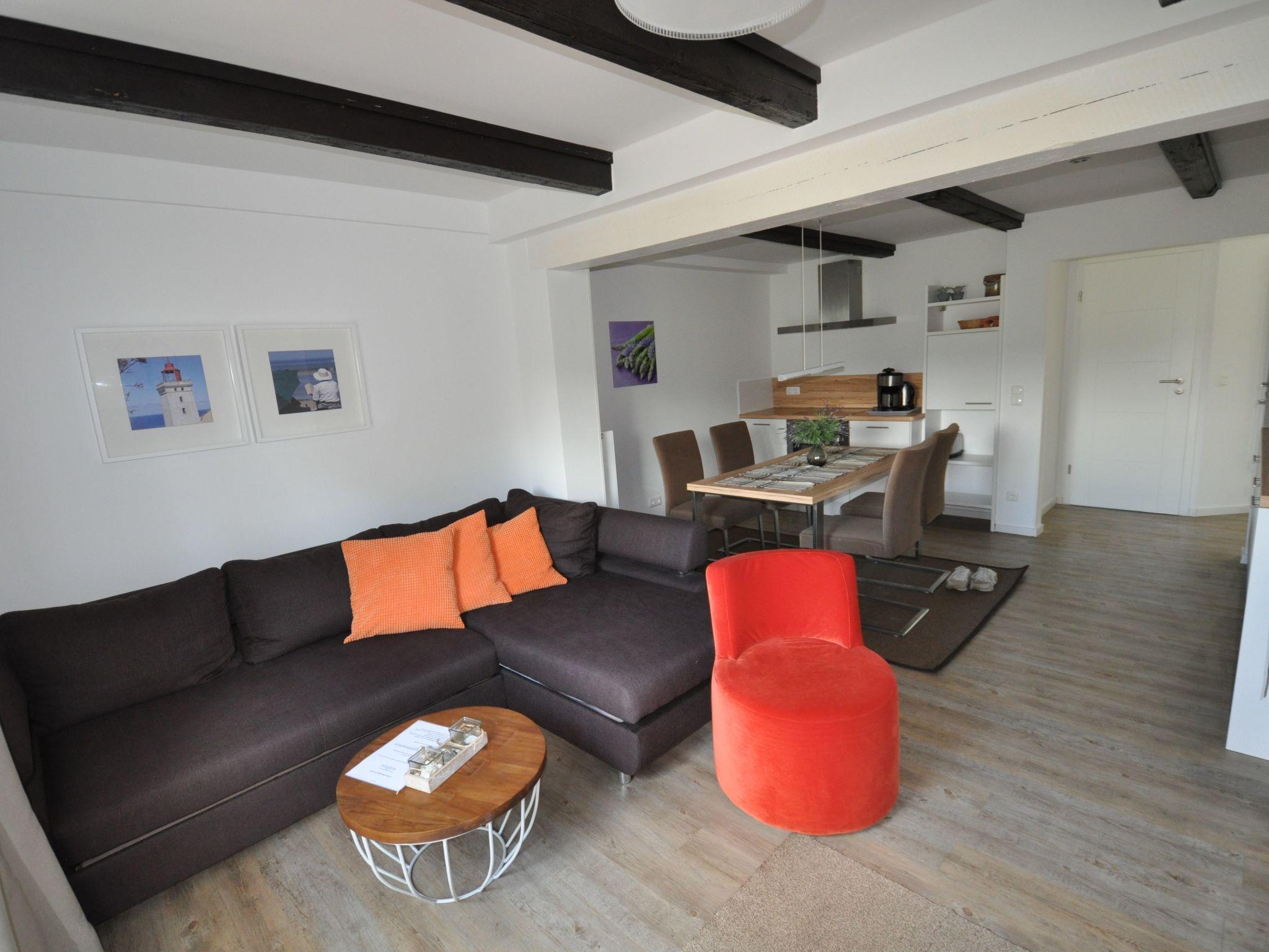 The maisonette apartment provides around 75m² of living space and is suitable for four adults. The ground floor has a big combined living room and kitchen with a cosy sofa corner, a dining space for four people and a fully-equipped kitchen, while the upper floor, with sloping ceilings under the roof, comprises two bedrooms, with daylight through skylights. Both have a box spring bed 160cm wide with two separate mattresses, as well as a wardrobe. There is a generous bathroom with a shower, WC and daylight. All the rooms have heating.