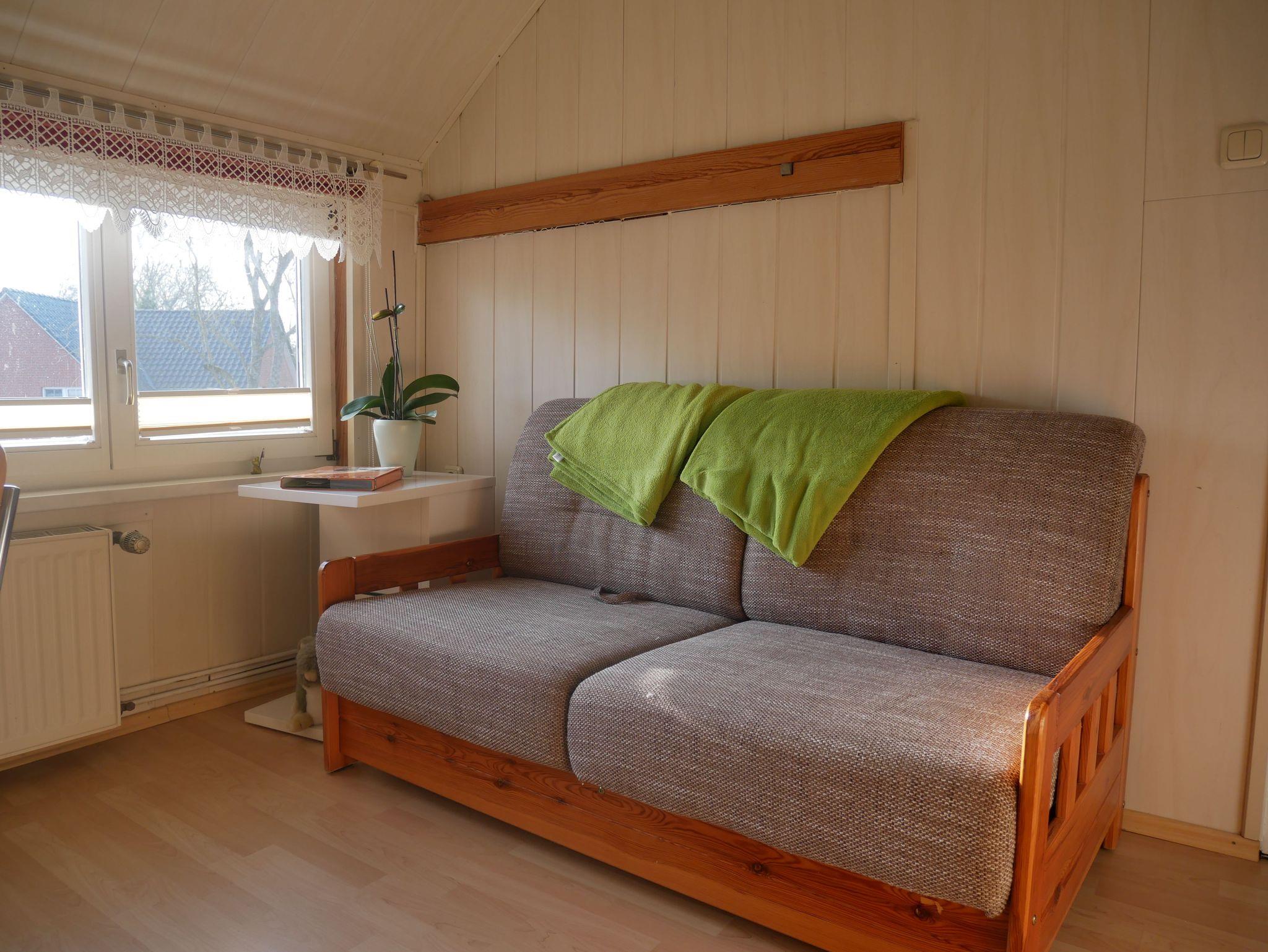 Im Wohnbereich finden Sie eine bequeme Couch, die bei Bedarf auch als Schlafcouch für Kinder bis maximal 14 Jahre genutzt werden kann (Maße 140 x 200 cm). Von hier aus haben Sie einen schönen Blick in das Gartencafé, was für eine entspannte Atmosphäre sorgt. Hier steht auch ein Esstisch mit vier Stühlen sowie ein Flachbildfernseher für entspannte Abende bereit.