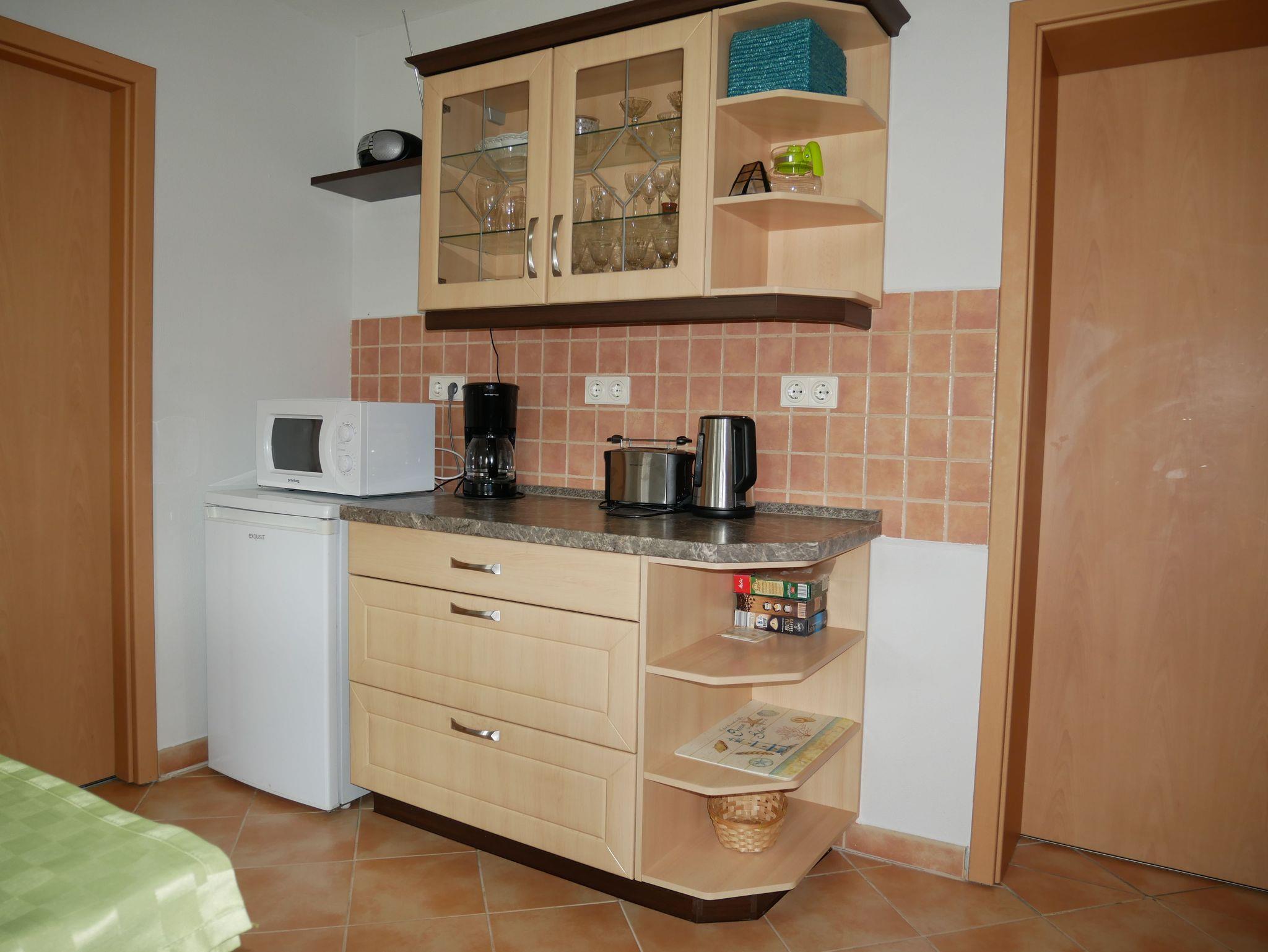Die voll ausgestattete Küche grenzt direkt an das Wohnzimmer und ist mit einen Cerankochfeld, Backofen, Kühlschrank mit Gefriermöglichkeit, Spülmaschine, Mikrowelle, Kaffeemaschine, Wasserkocher und Toaster ausgestattet, in dem Sie nach Herzenslust kochen können.