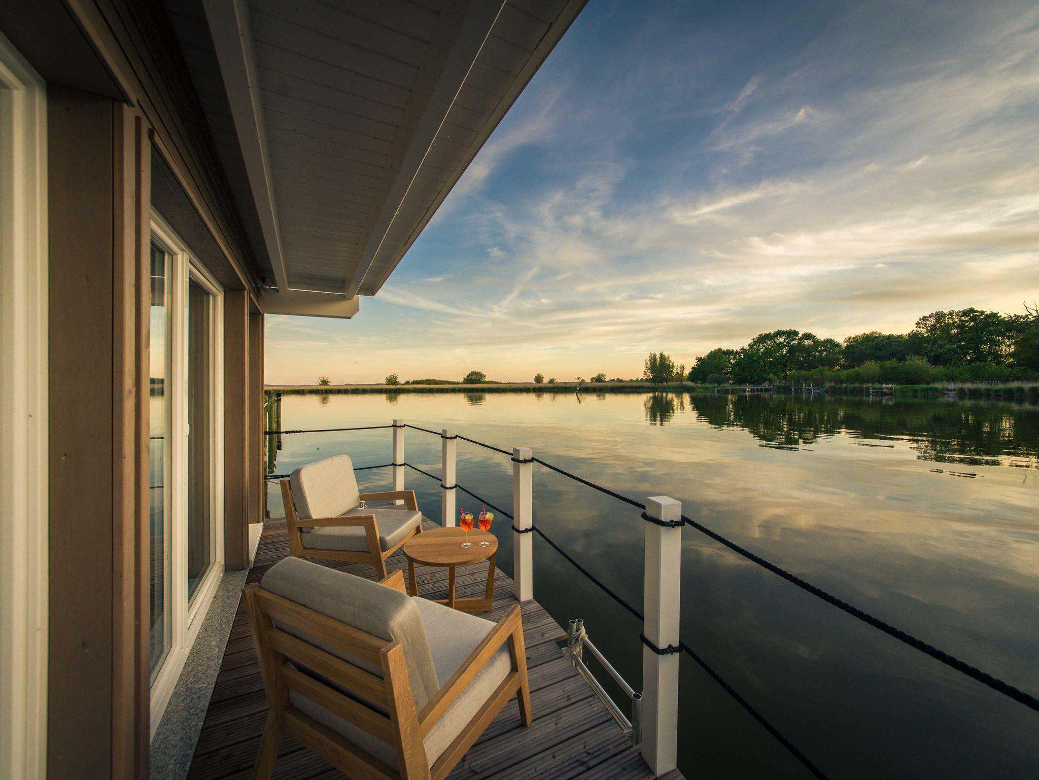 Die neuen exklusiven Schwimmenden Suiten liegen in der kleinen 4-Sterne Marina Naturhafen Krummin auf der Insel Usedom: Der Blick auf das Wasser begleitet Ihren Urlaub die gesamte Zeit.